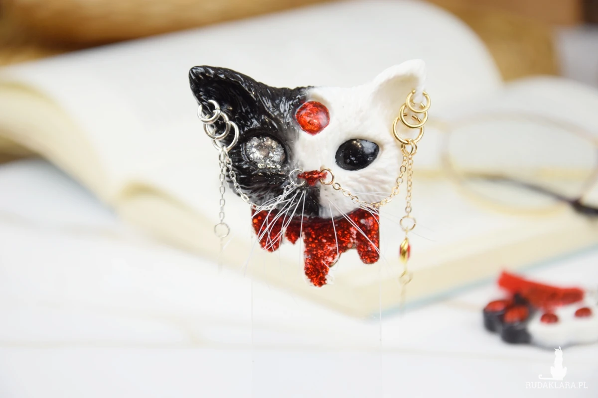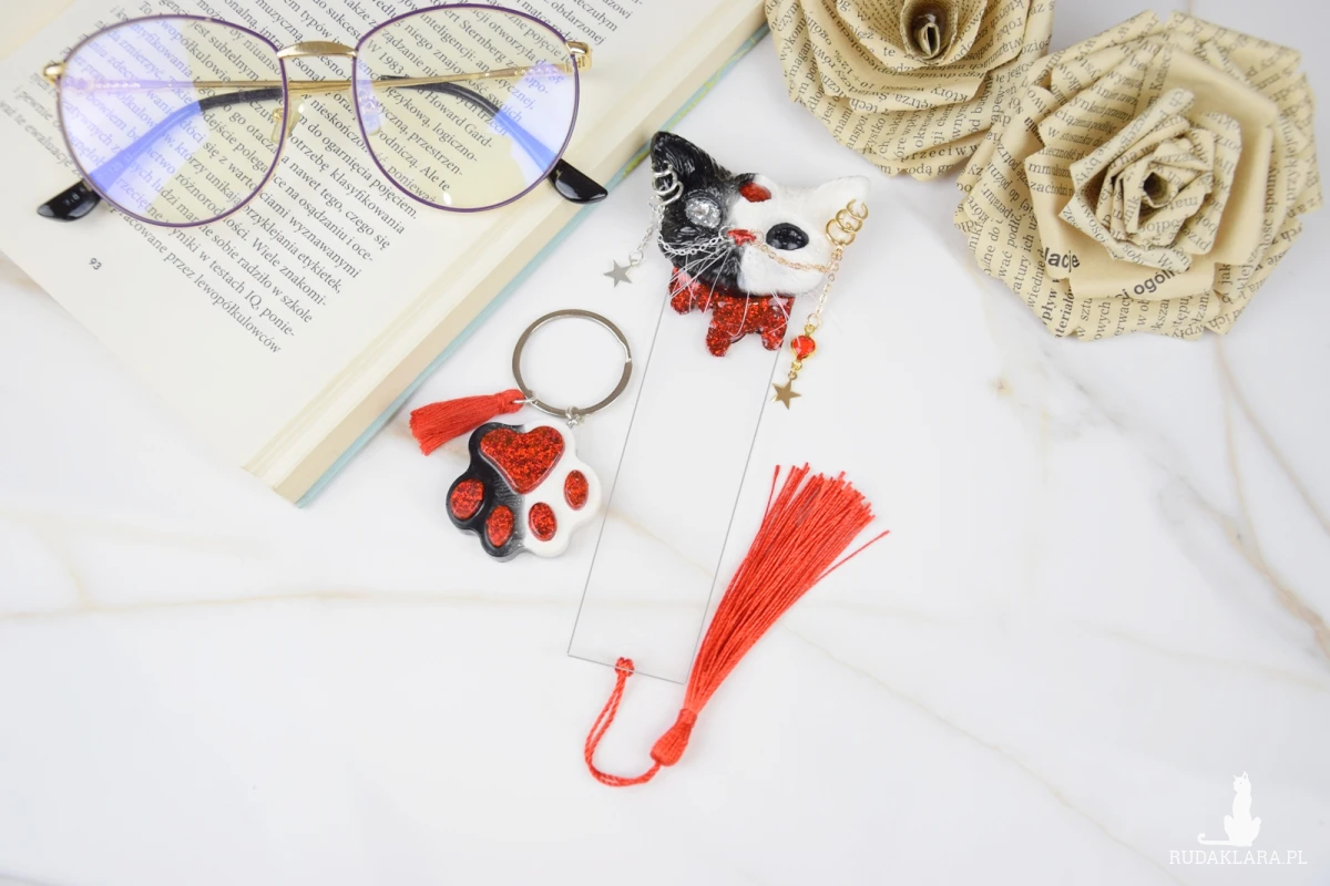Głowa kota jest trójwymiarowa, co nadaje jej wyjątkowy, realistyczny wygląd. Dodatkowo, została starannie ozdobiona ręcznie układaną biżuterią, która nawiązuje do hinduskich motywów. Te bogate detale wprowadzają element egzotyki i kulturowego bogactwa, sprawiając, że każdy egzemplarz jest unikalny i pełen charakteru. W komplecie z zakładką do książki jest brelok z żywicy w kształcie kociej łapy to ciekawy i oryginalny dodatek, idealny dla miłośników kotów.