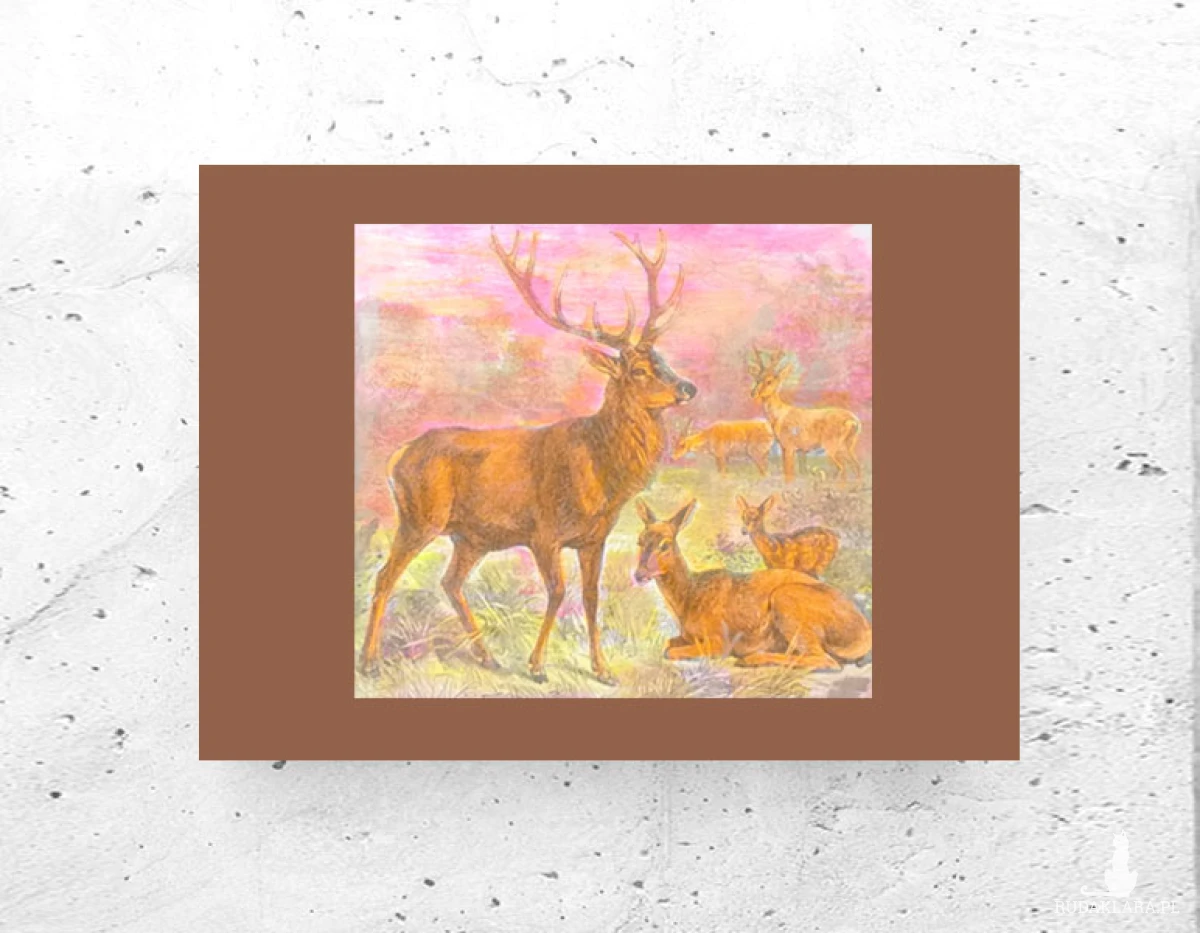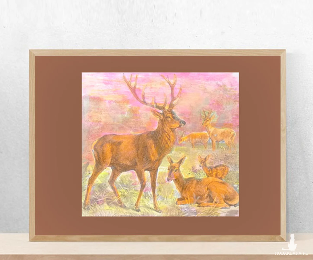 Obrazek w stylu retro. Grafika z jeleniem i sarnami na brązowym kartoniku 21 x 30 cm. Poster do samodzielnej oprawy. Plakat wystarczy tylko