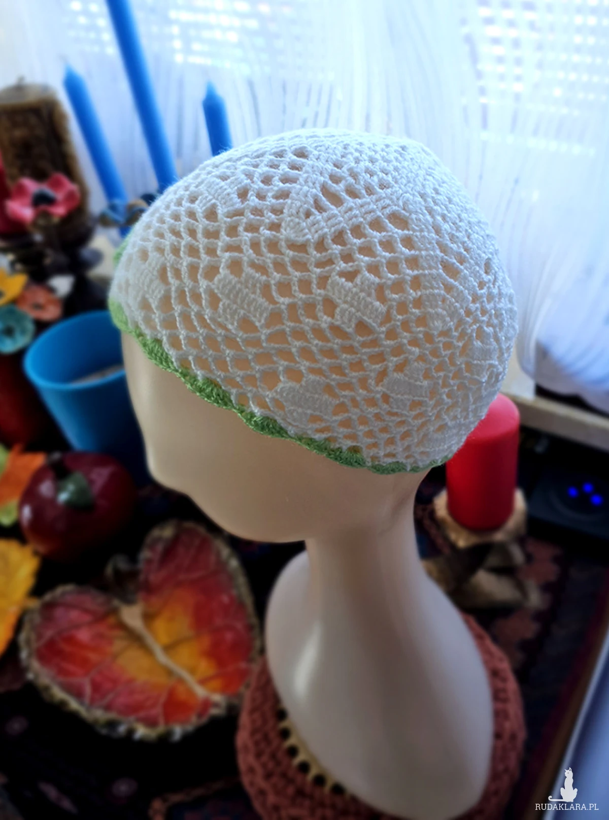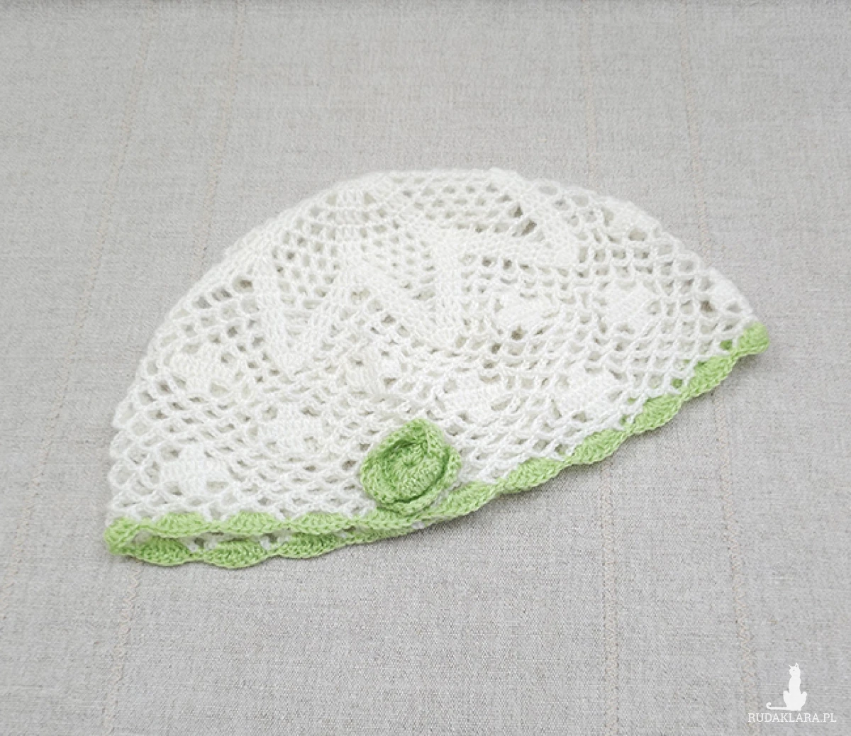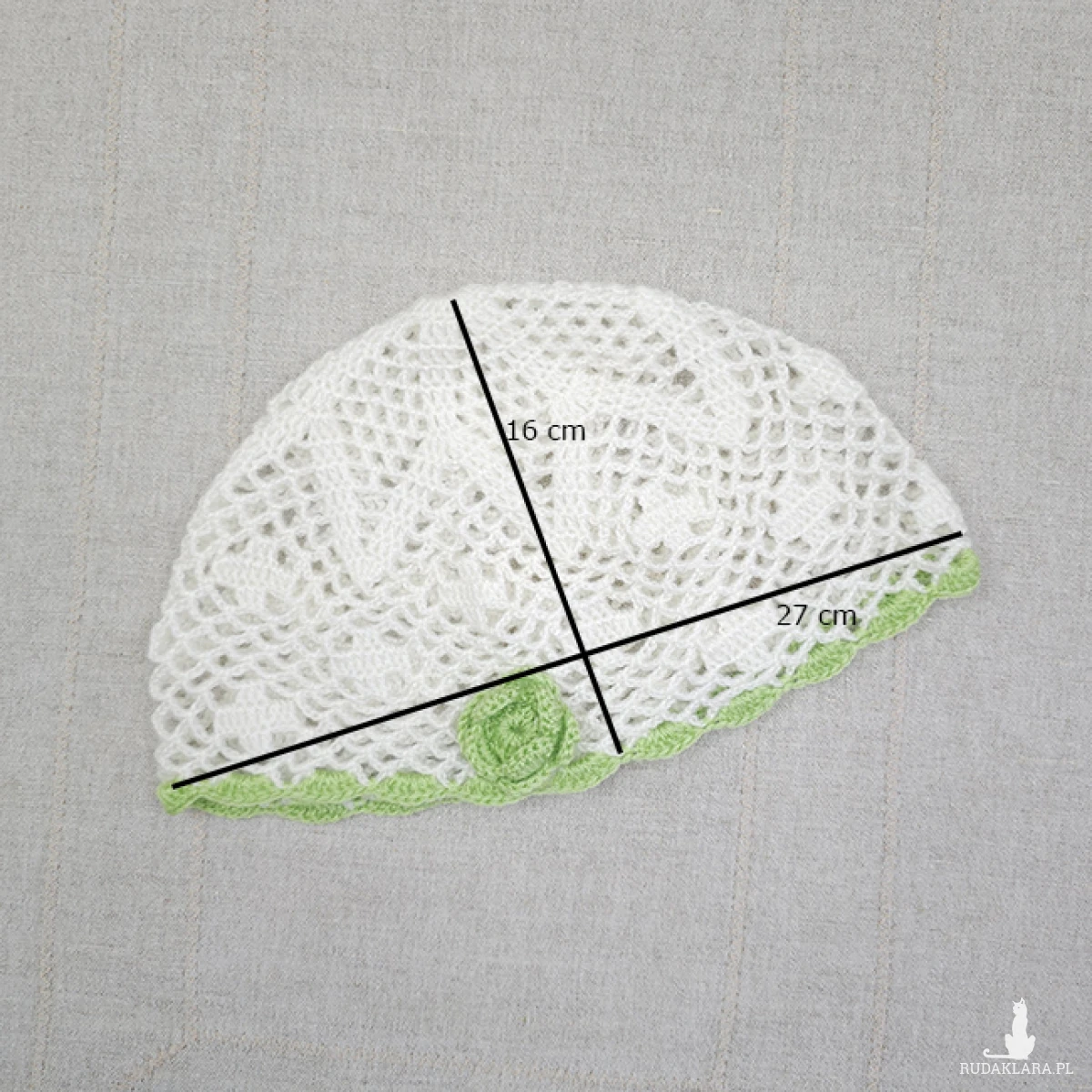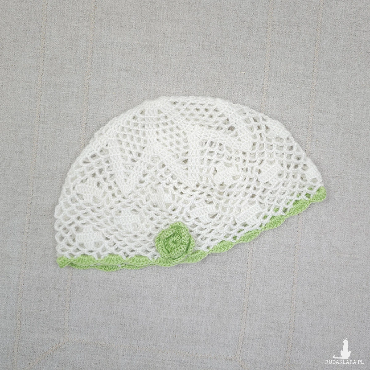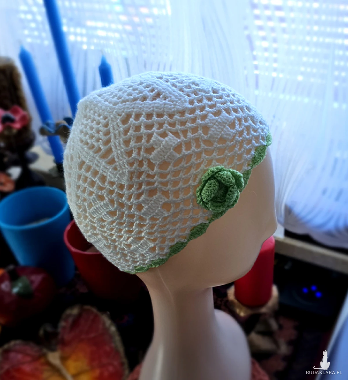 Czapka wykonana na szydełku z włóczki akrylowej.