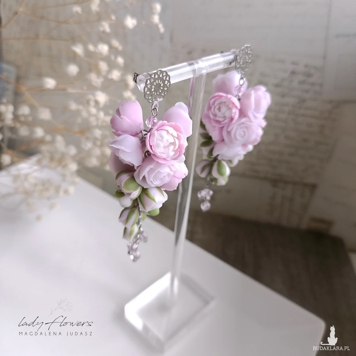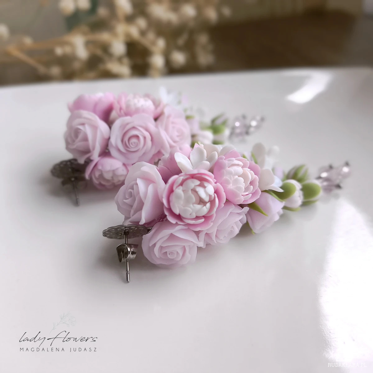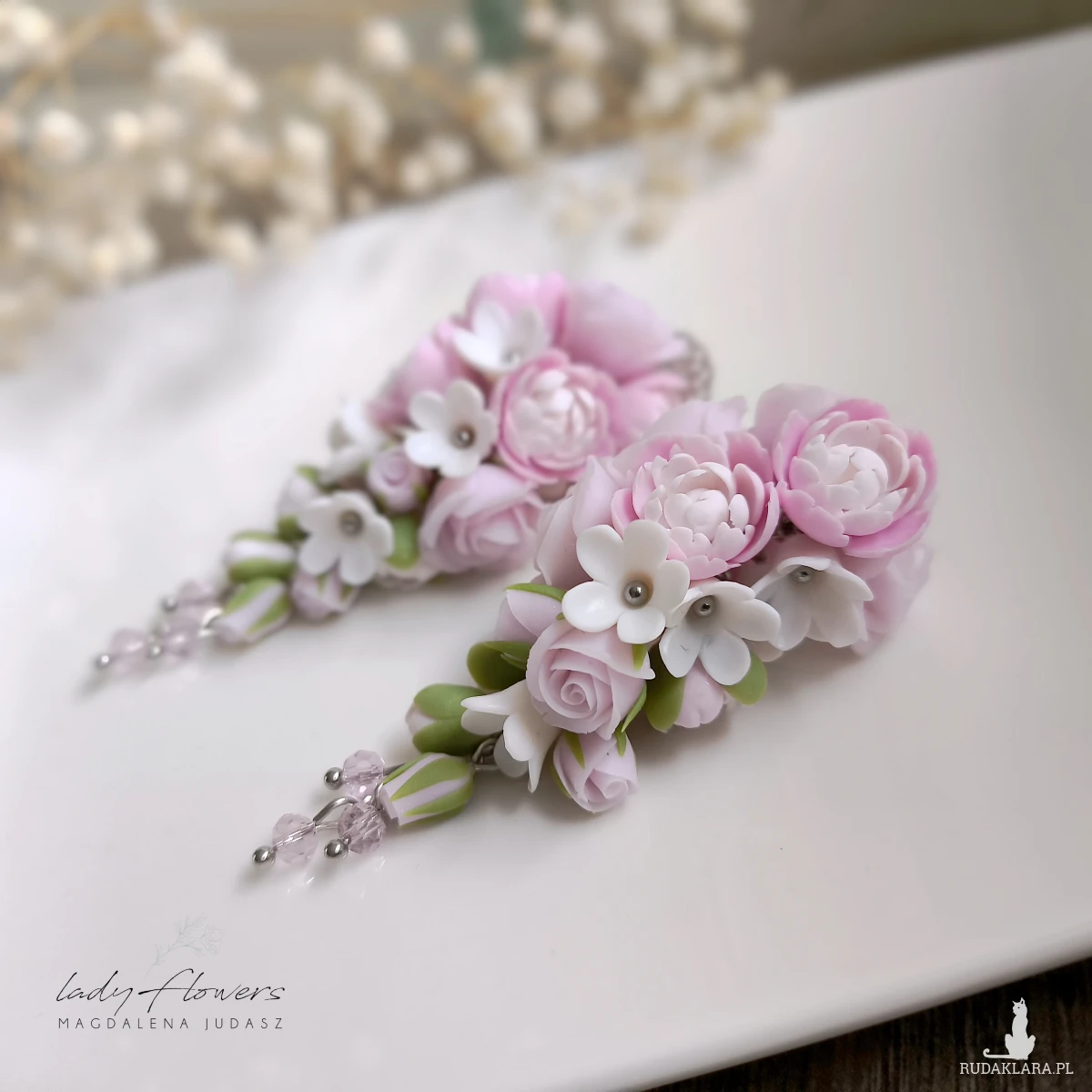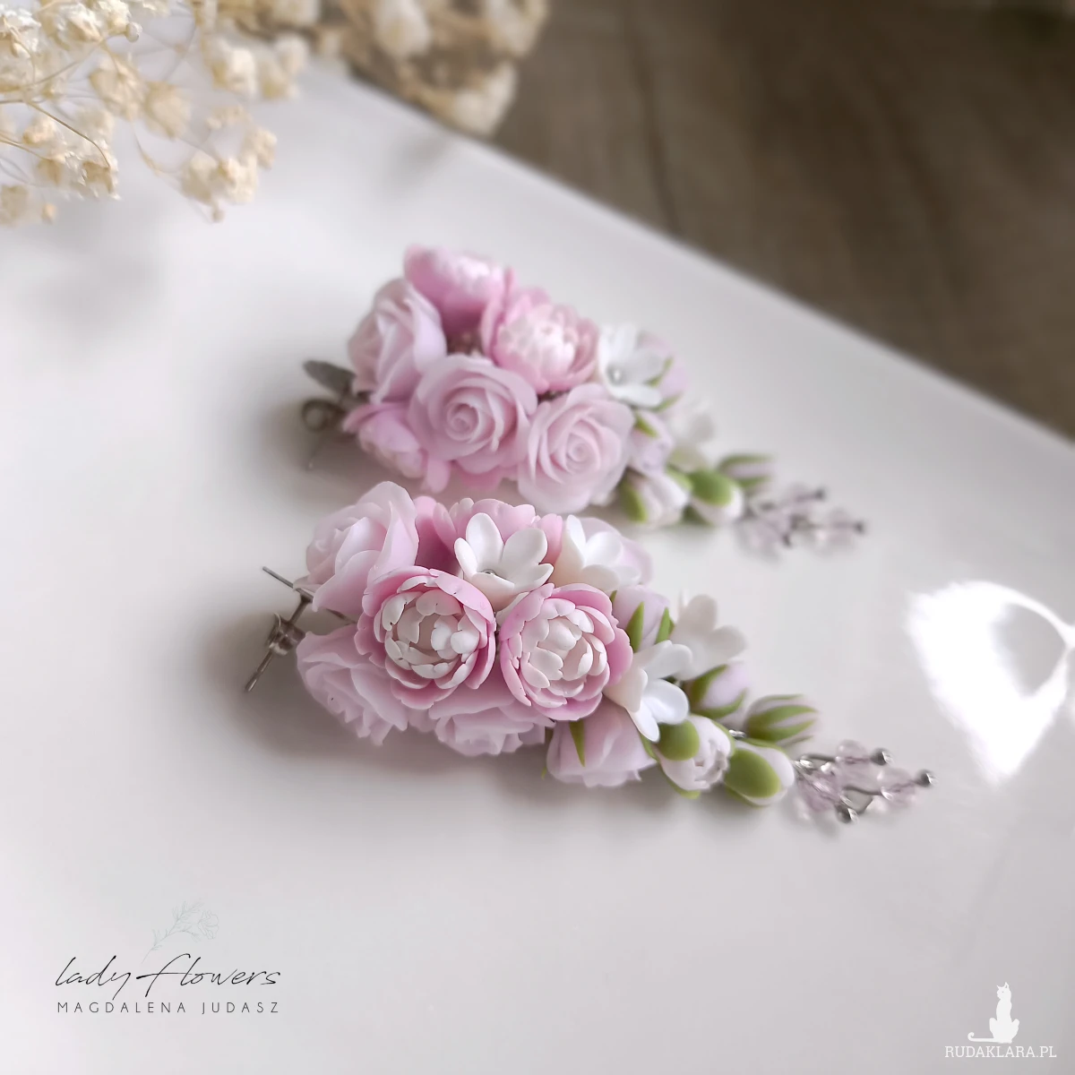 Eleganckie kolczyki z pudrowymi peoniami i różyczkami, wykonane z profesjonalnej masy termoutwardzalnej.