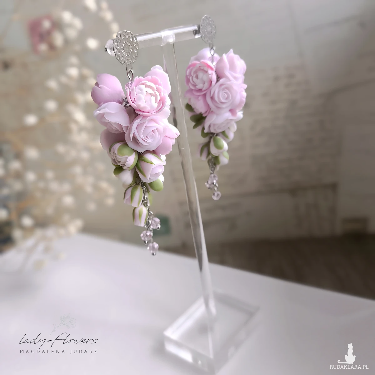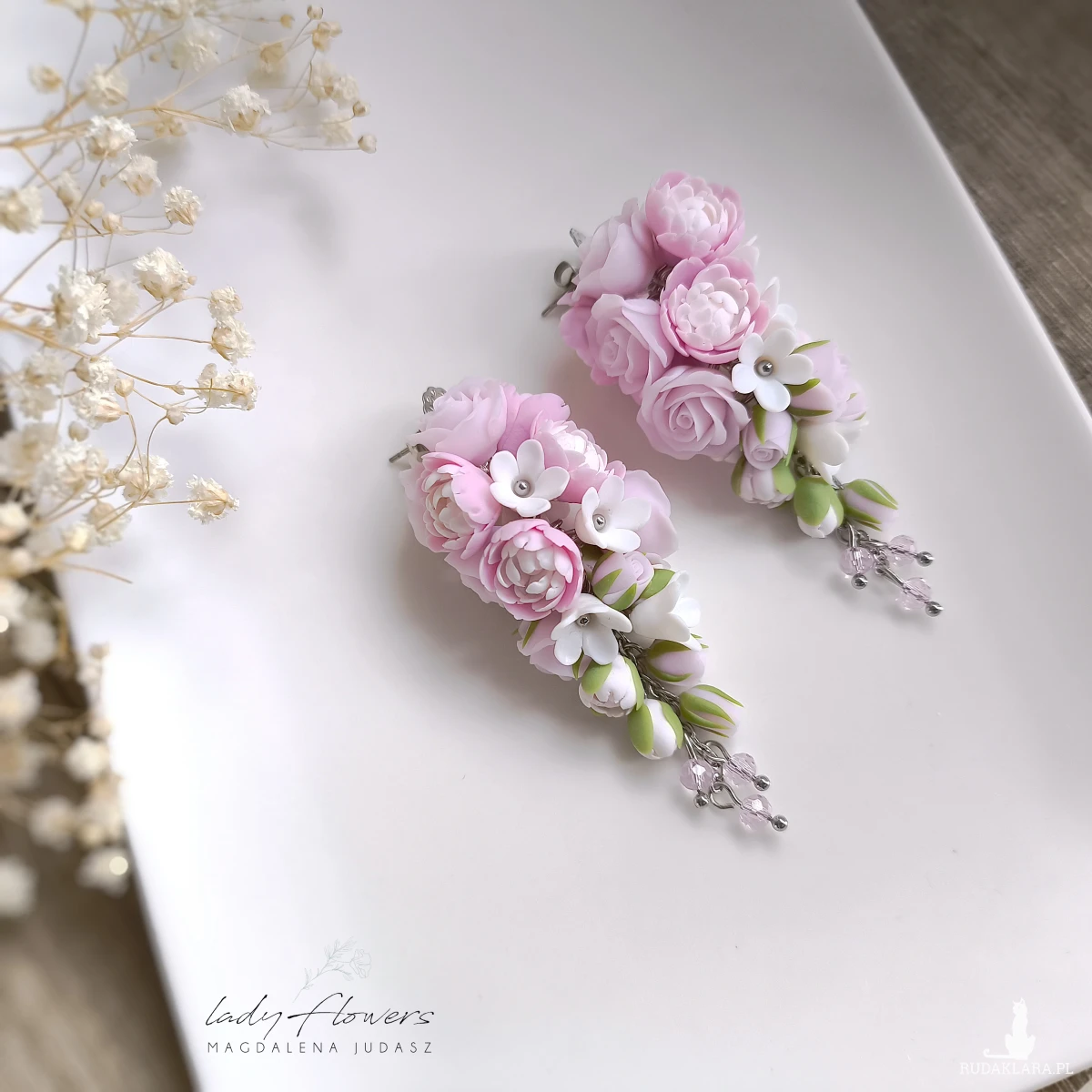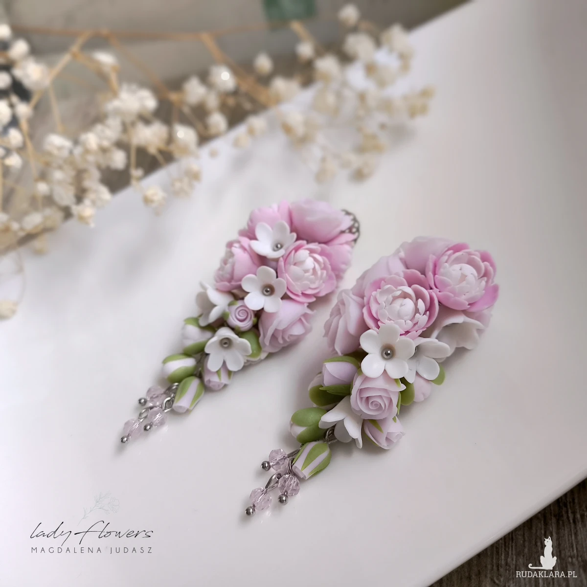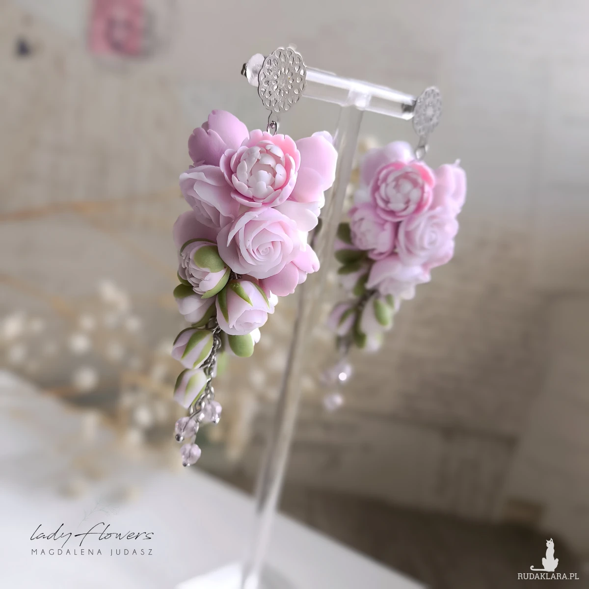 Eleganckie kolczyki z pudrowymi peoniami i różyczkami, wykonane z profesjonalnej masy termoutwardzalnej.