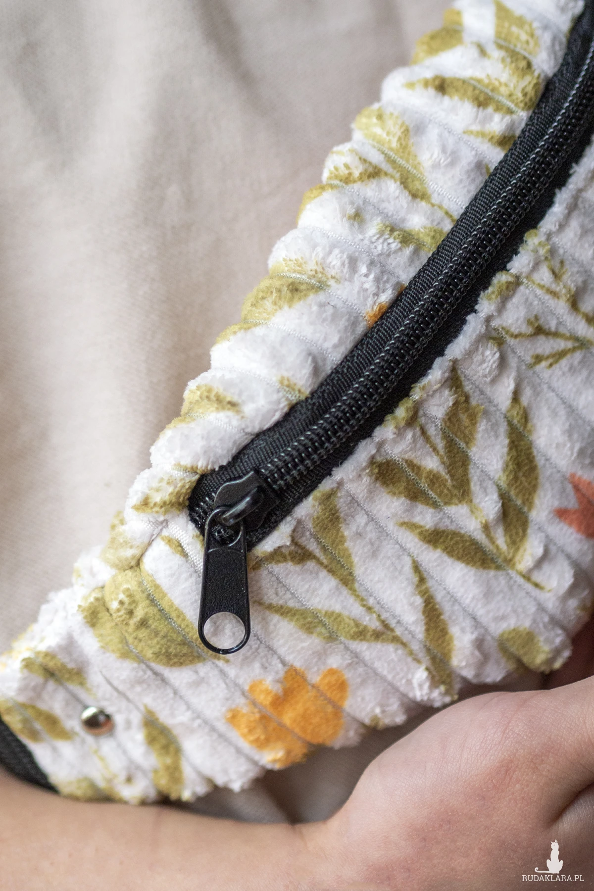 Mała saszetka, torebka biodrowa, nerka dla dziecka wykonana z grubego sztruksu w kolorze ecru w kwiaty. Zapinana na suwak.