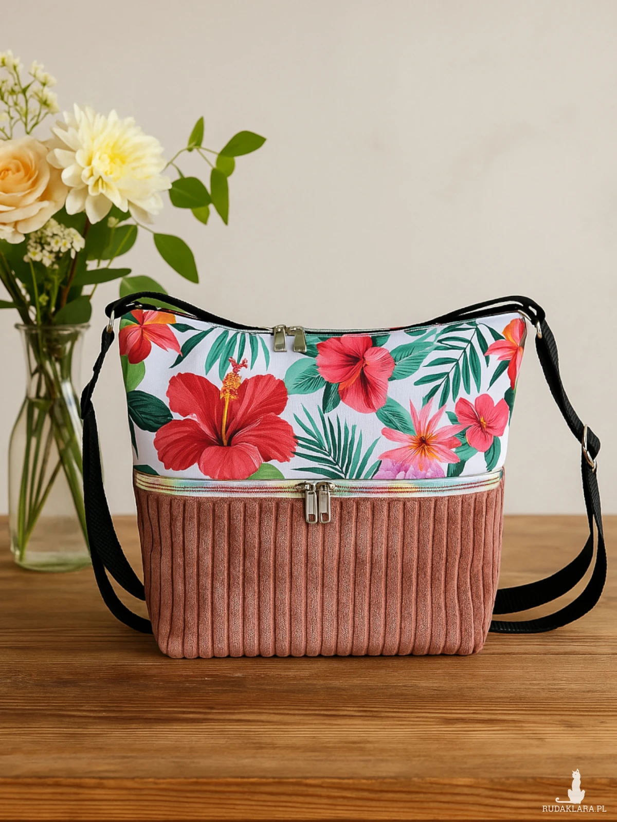 Kobiecy design – góra przodu wykonana z wodoodpornej tkaniny w zachwycający kwiatowy wzór, który od razu przyciąga wzrok. Tył i dół torebki uszyte są z miękkiego sztruksu w kolorze brudnego różu, który dodaje całości subtelnego uroku.
