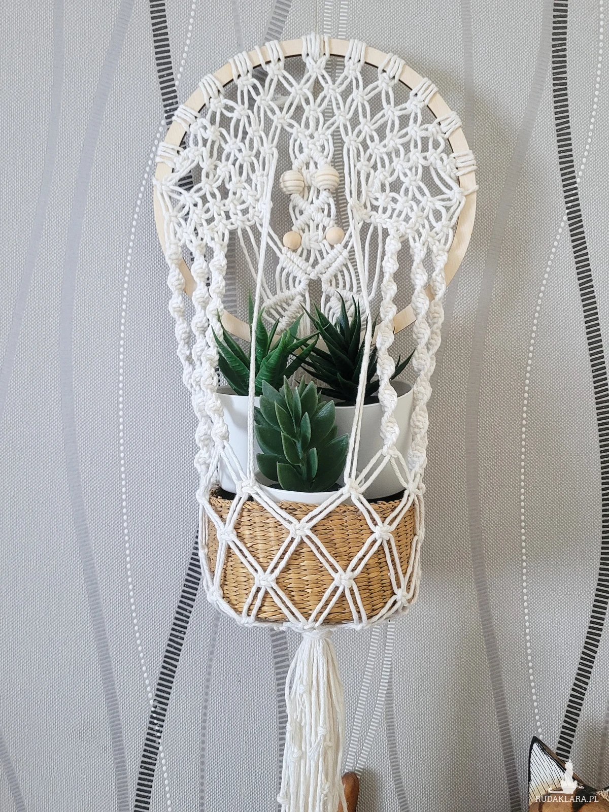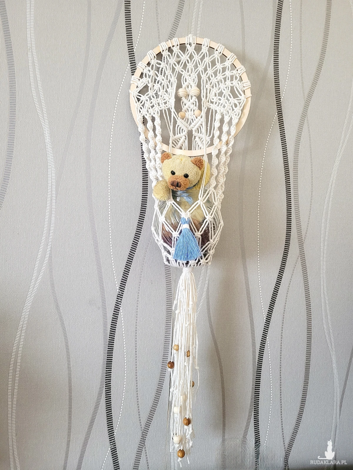 Ozdoba wypleciona ze sznurka bawełnianego w kolorze naturalnym, na obręczy ze sklejki drewnianej, chwosty w kolorze jasnego niebieskiego/błękitu lub jasnego różu- do wyboru, dodatkowo ozdobiona koralikami drewnianymi.