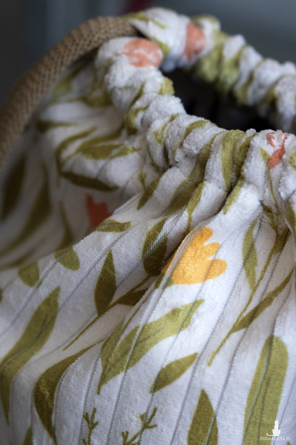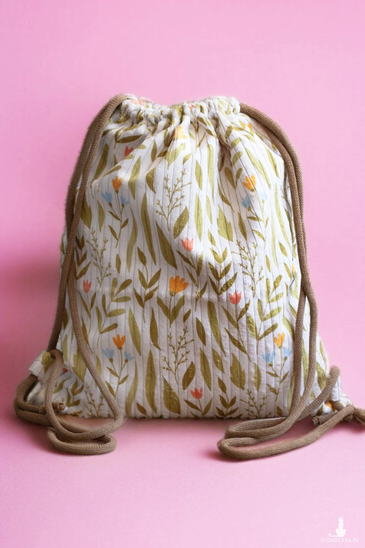 Plecak worek wykonany z grubego sztruksu w kwiaty w kolorze ecru.