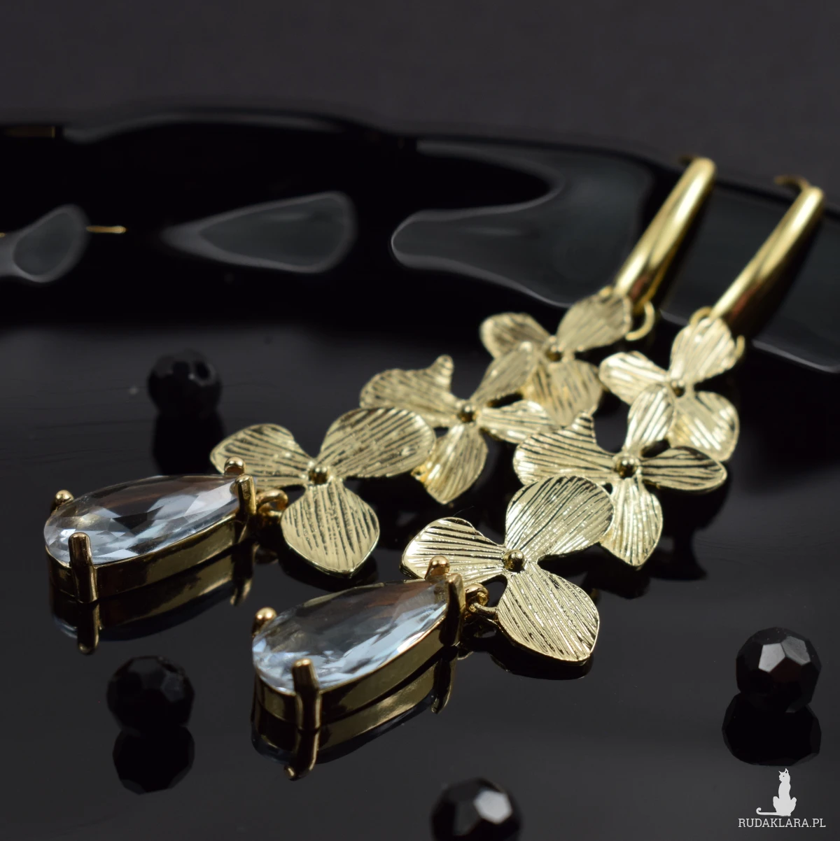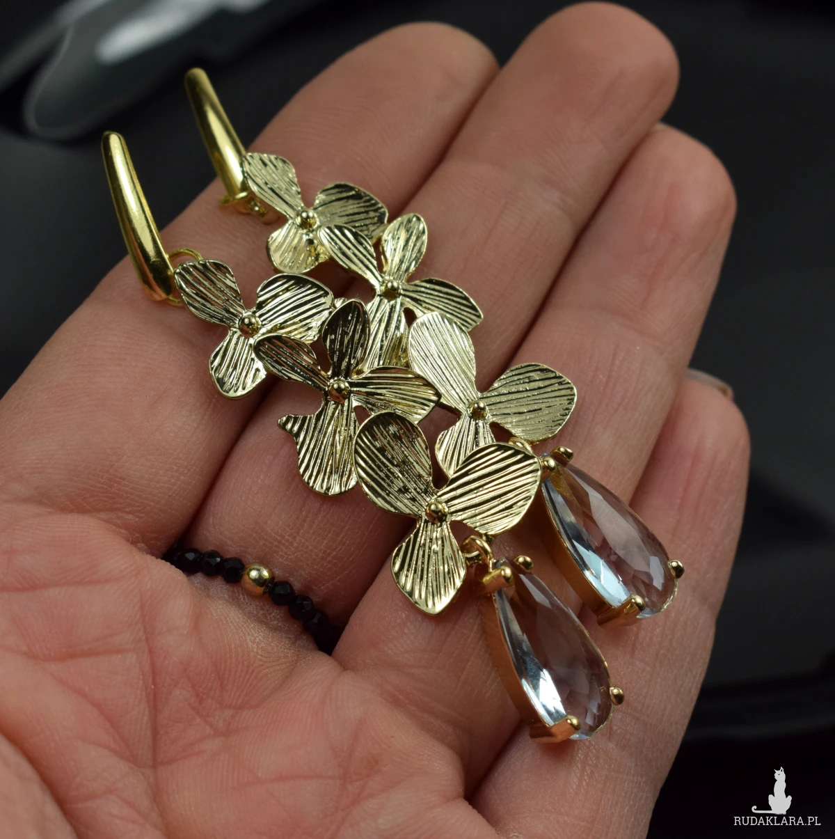 Zjawiskowe, eleganckie kolczyki w odcieniu delikatnego złota, z motywem kwiatowym oraz kryształem w kolorze delikatnej lawendy.