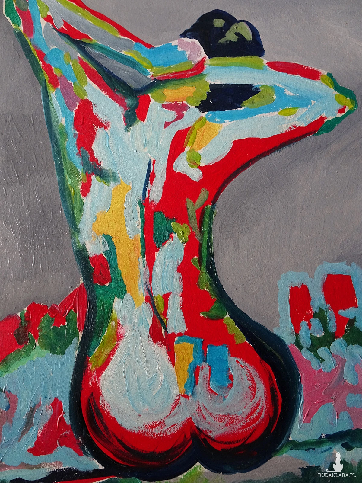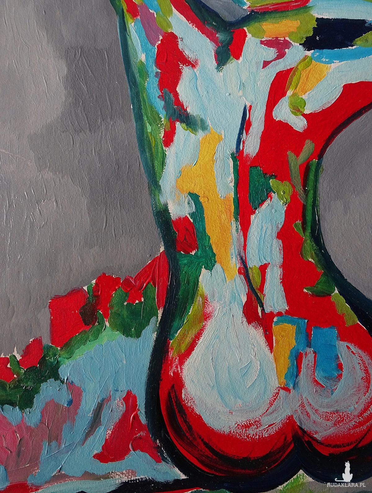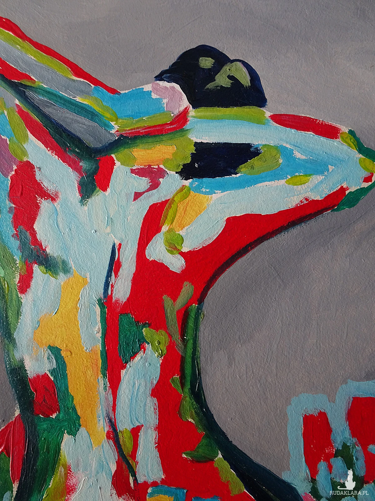 Na obrazie widzimy intrygującą, abstrakcyjną formę, która przykuwa wzrok feerią barw. Dominują intensywne czerwienie i zielenie, które płynnie przechodzą w błękity, żółcie i odcienie różu. Kontury są miękkie, rozmyte, a jednak wyraziście podkreślają centralną postać. Tło jest szare, co dodaje całości surowości i kontrastuje z kolorami postaci. Kompozycja jest dynamiczna, niemalże pulsująca energią, przypominając mi burzę emocji zatrzymaną w czasie. Atmosfera obrazu jest z jednej strony spokojna, z drugiej - tętni niespokojnym rytmem.