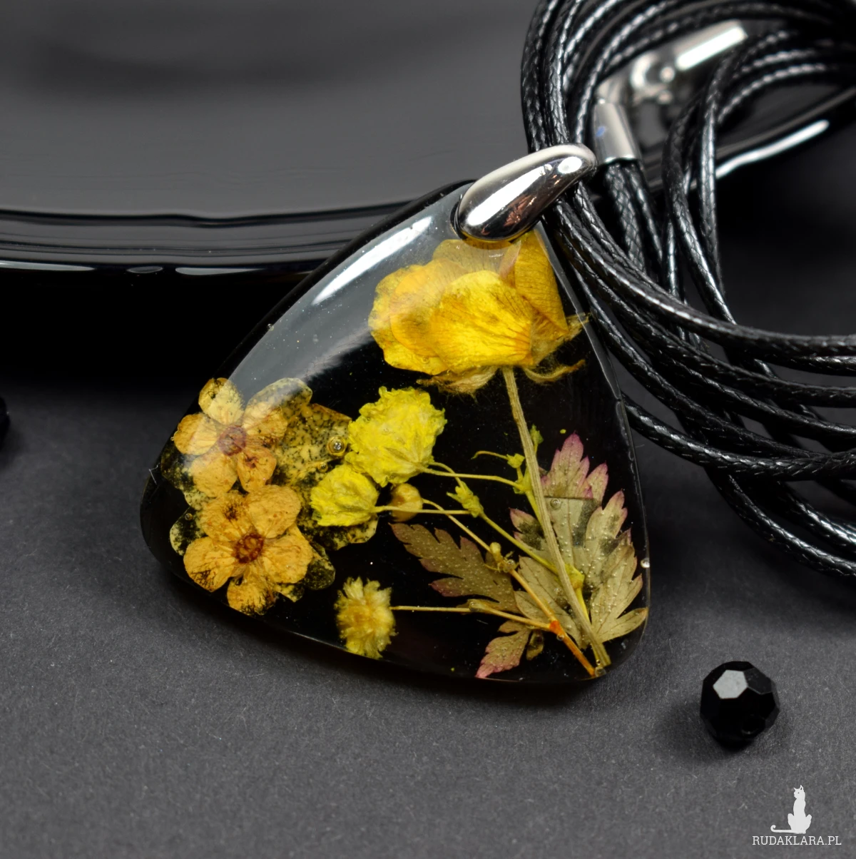 Niezwykły, ręcznie wykonany naszyjnik z żółtymi kwiatami i roślinkami zatopionymi w żywicy.
