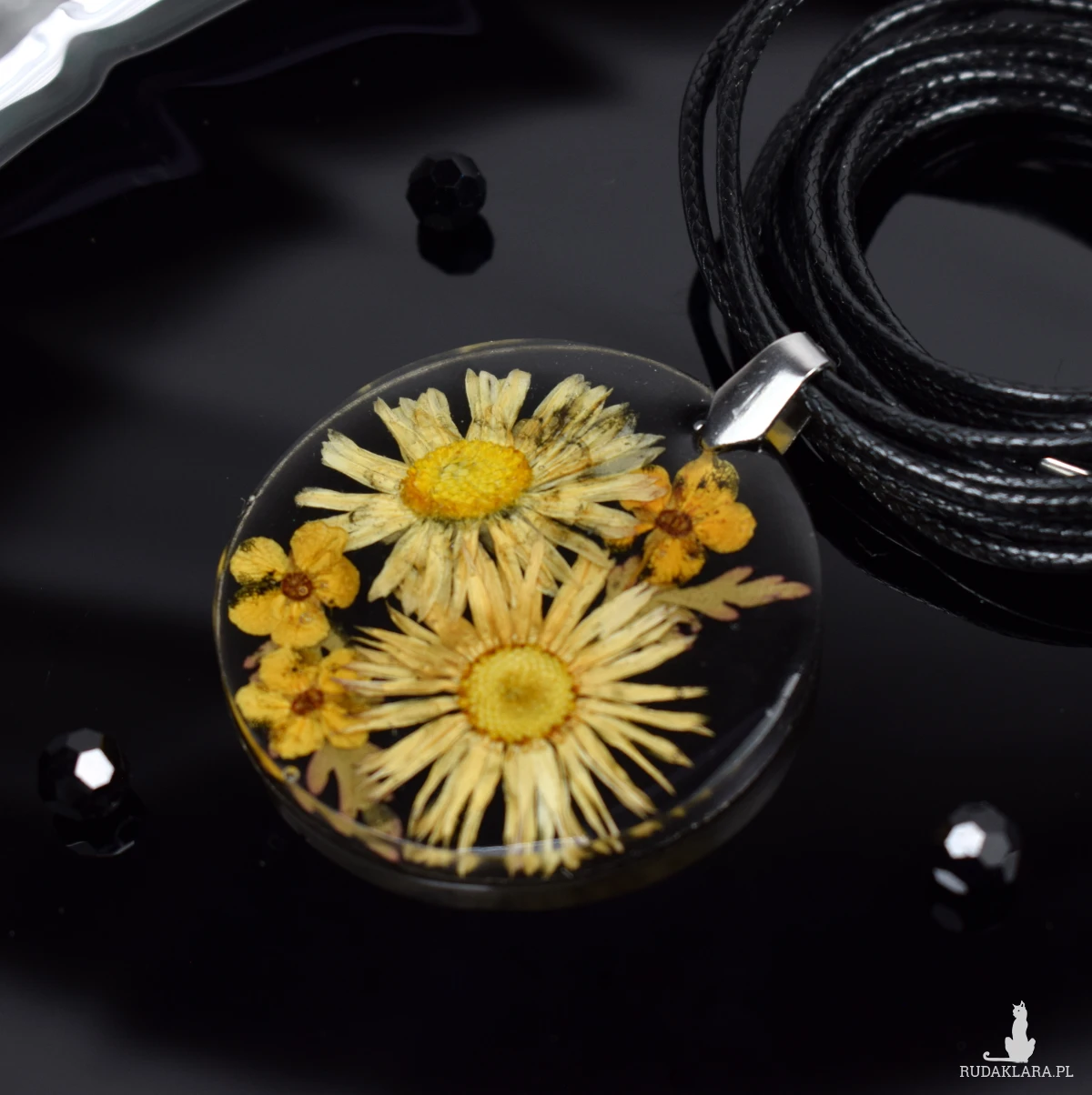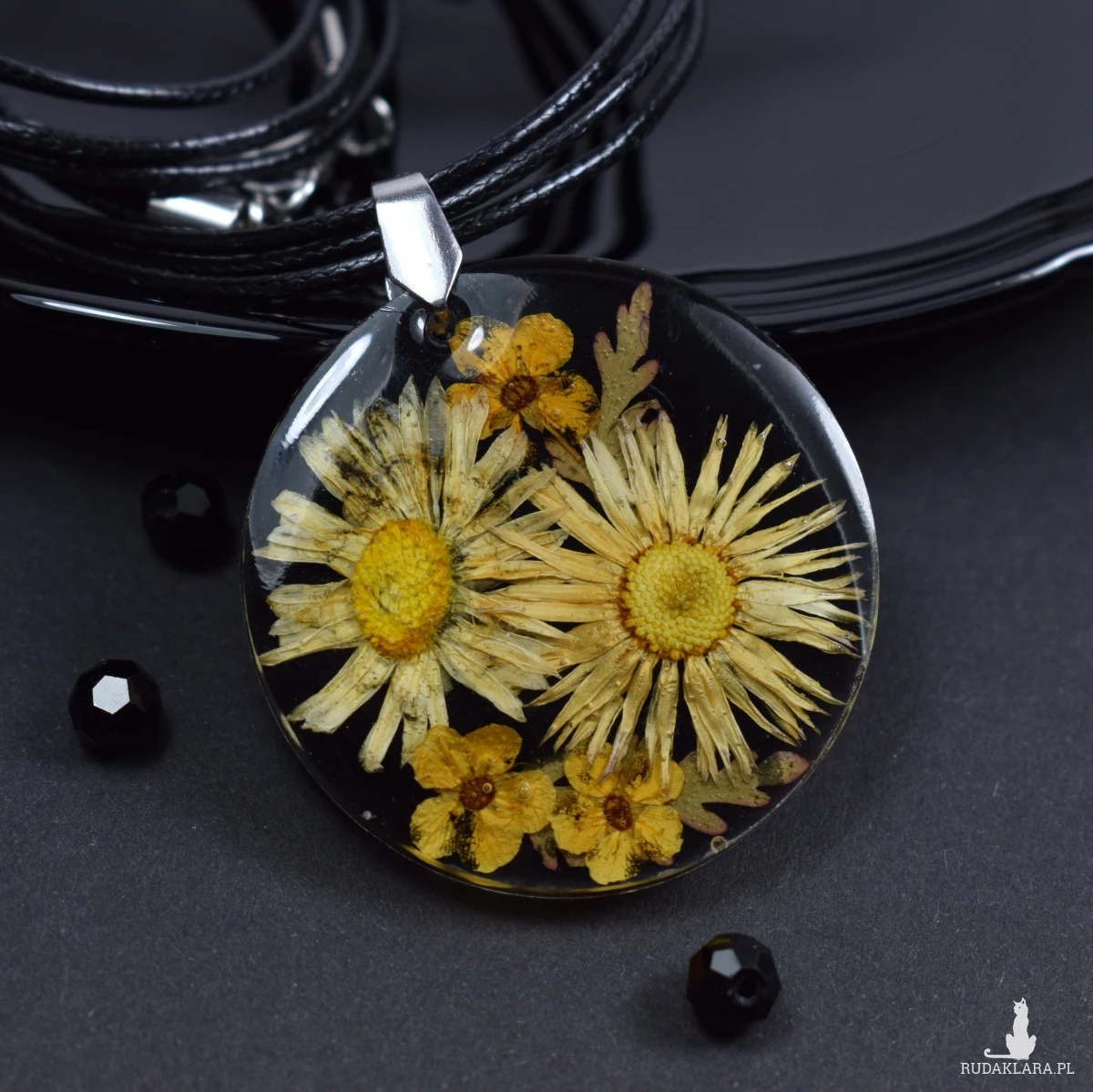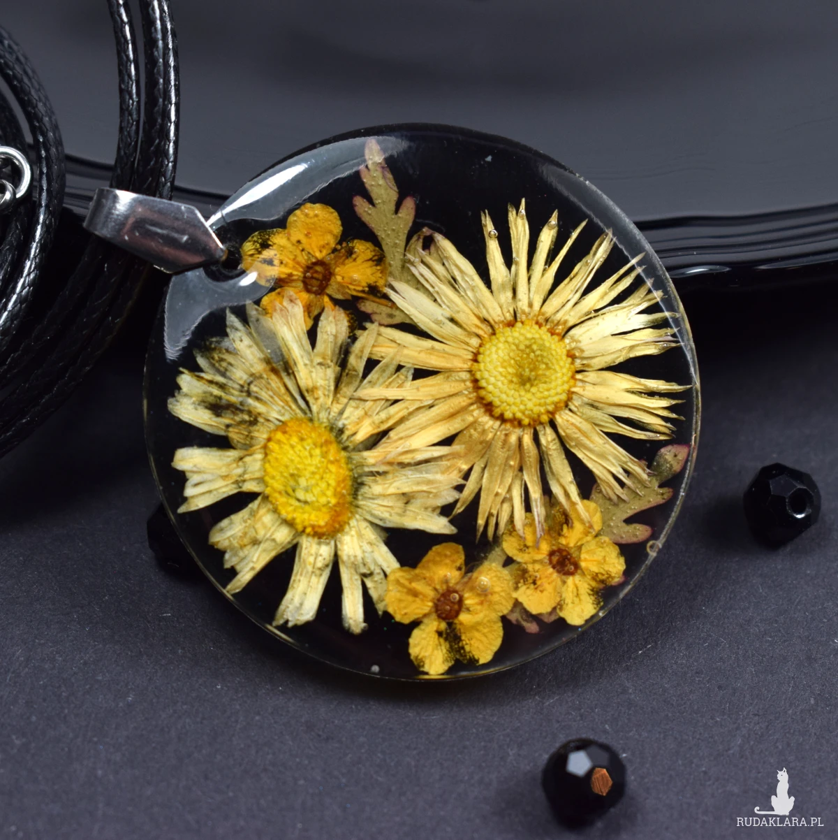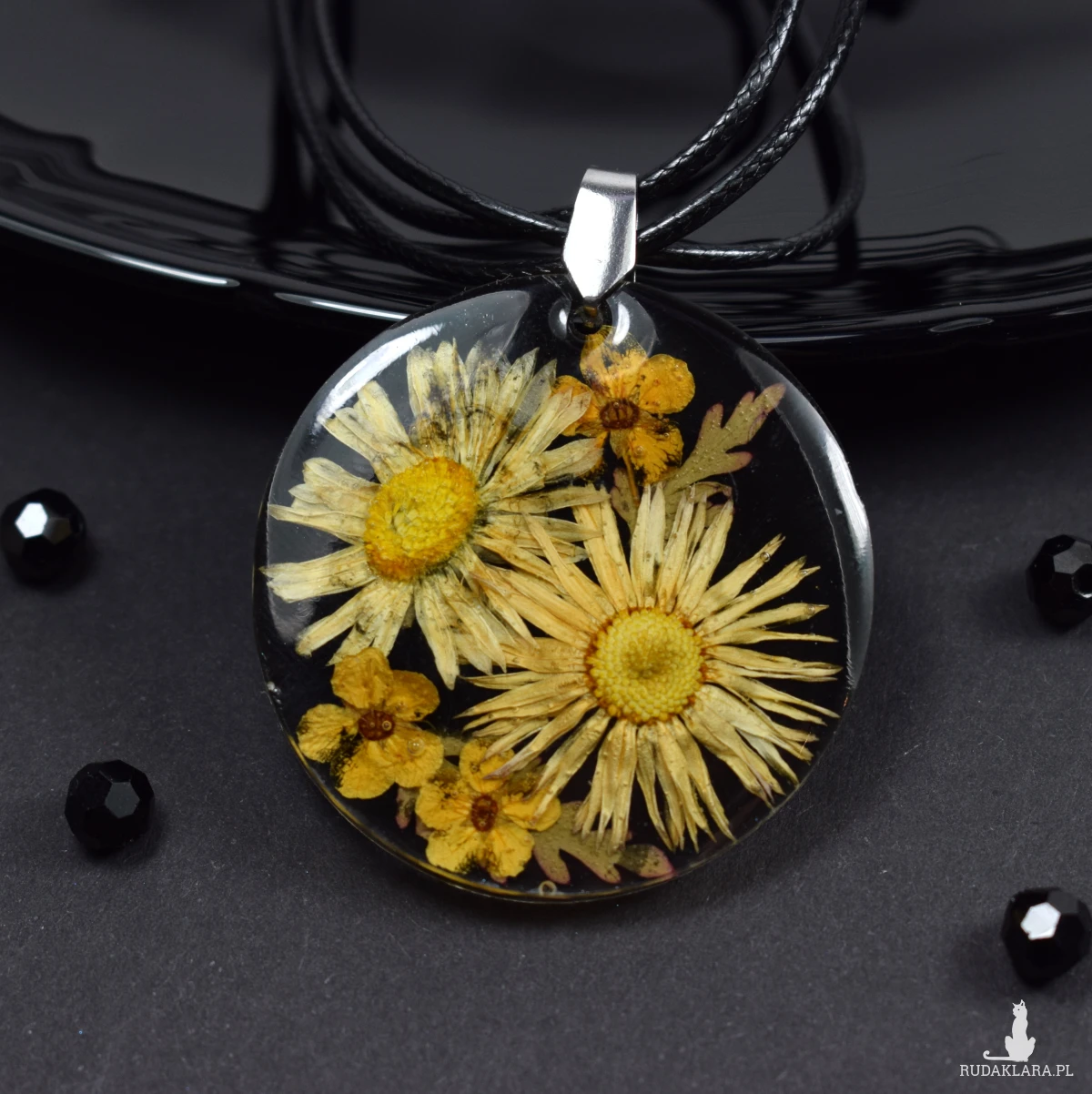 Suszone kwiaty prezentują się przepięknie na czarnym kontrastowym tle. Wisiorek Idealny na specjalne okazje, jak i do noszenia na co dzień.
