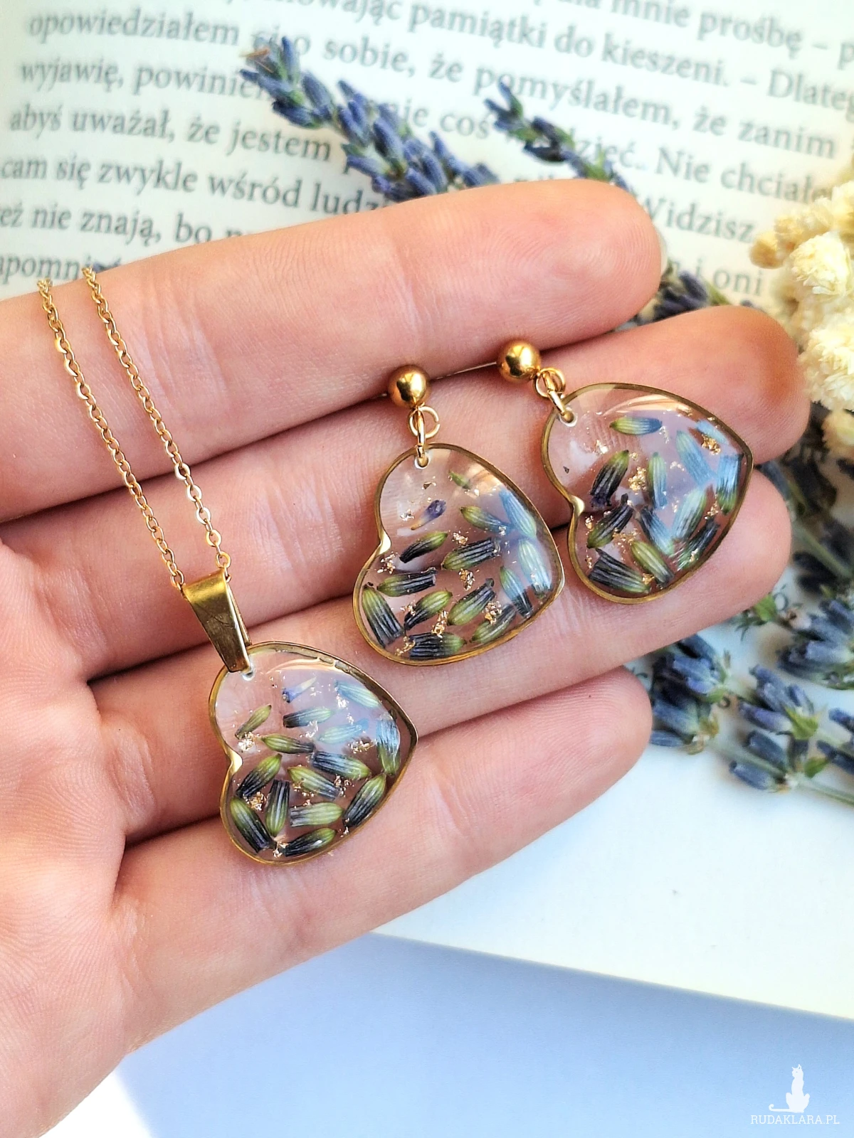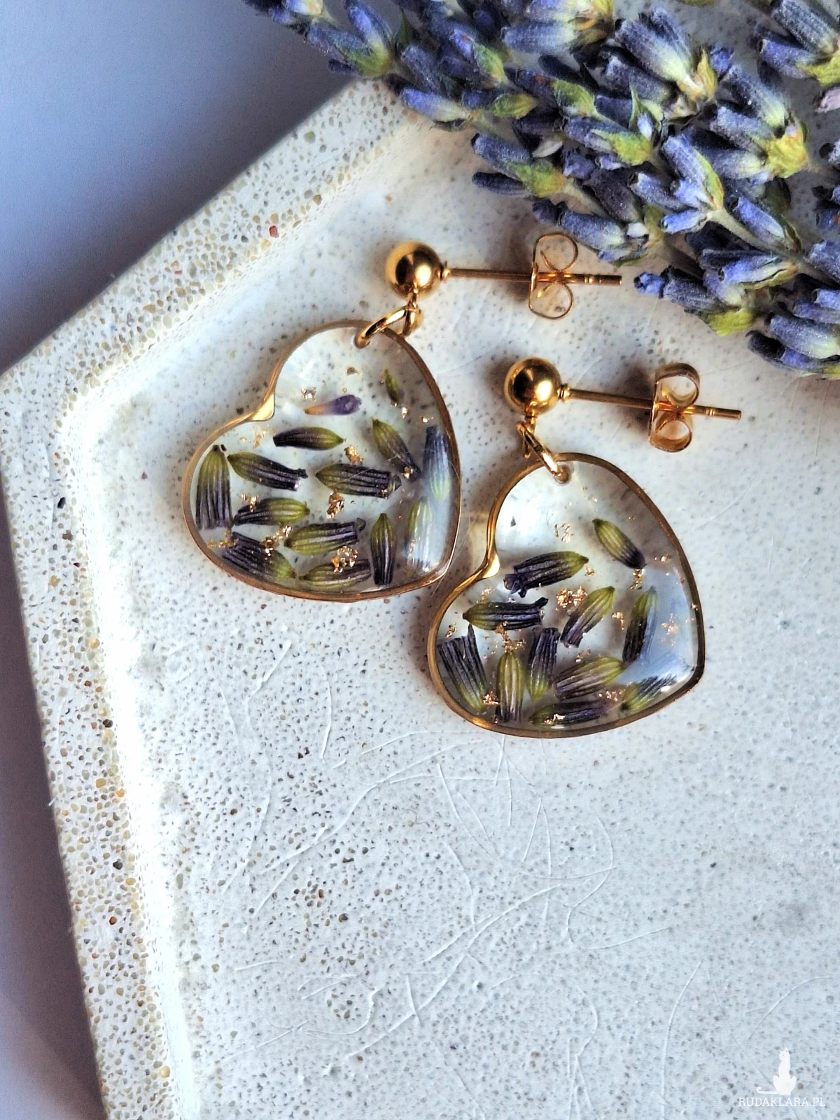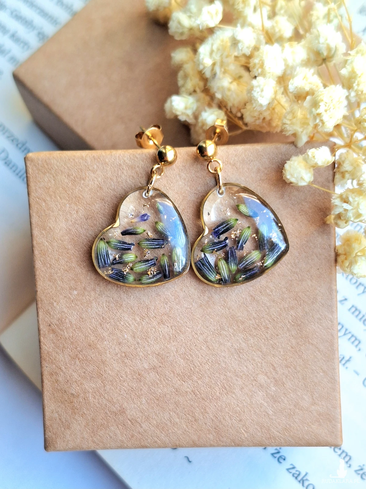Urocze kolczyki w kształcie serca z zatopionymi kwiatami lawendy i drobinkami złota. Wykonane z wysokiej klasy żywicy, która nie zmienia koloru pod wpływem promieniowania UV oraz wysokiej jakości stali chirurgicznej.