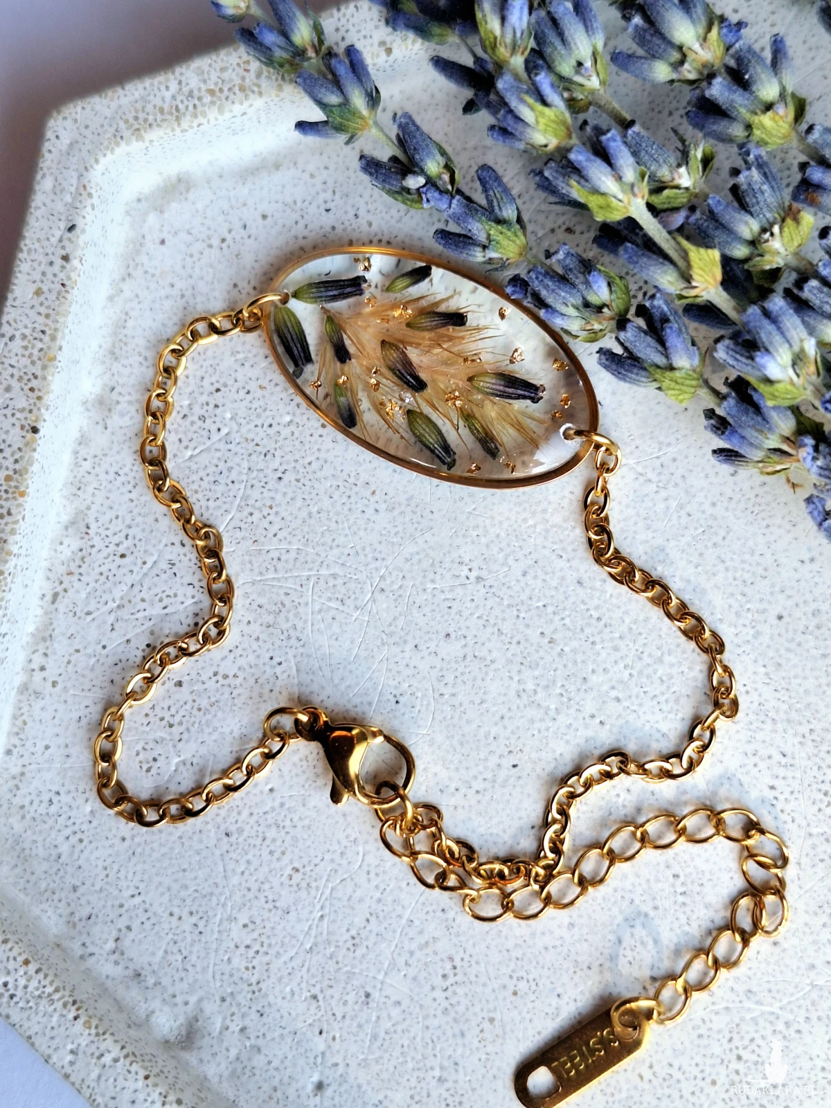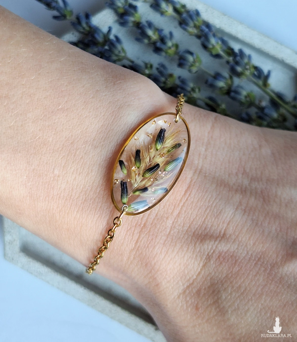 Urocza bransoletka z zatopionymi kwiatami lawendy, trawą i płatkami złota. Wykonana z wysokiej klasy żywicy, która nie zmienia koloru pod wpływem promieniowania uv oraz wysokiej jakości stali chirurgicznej.