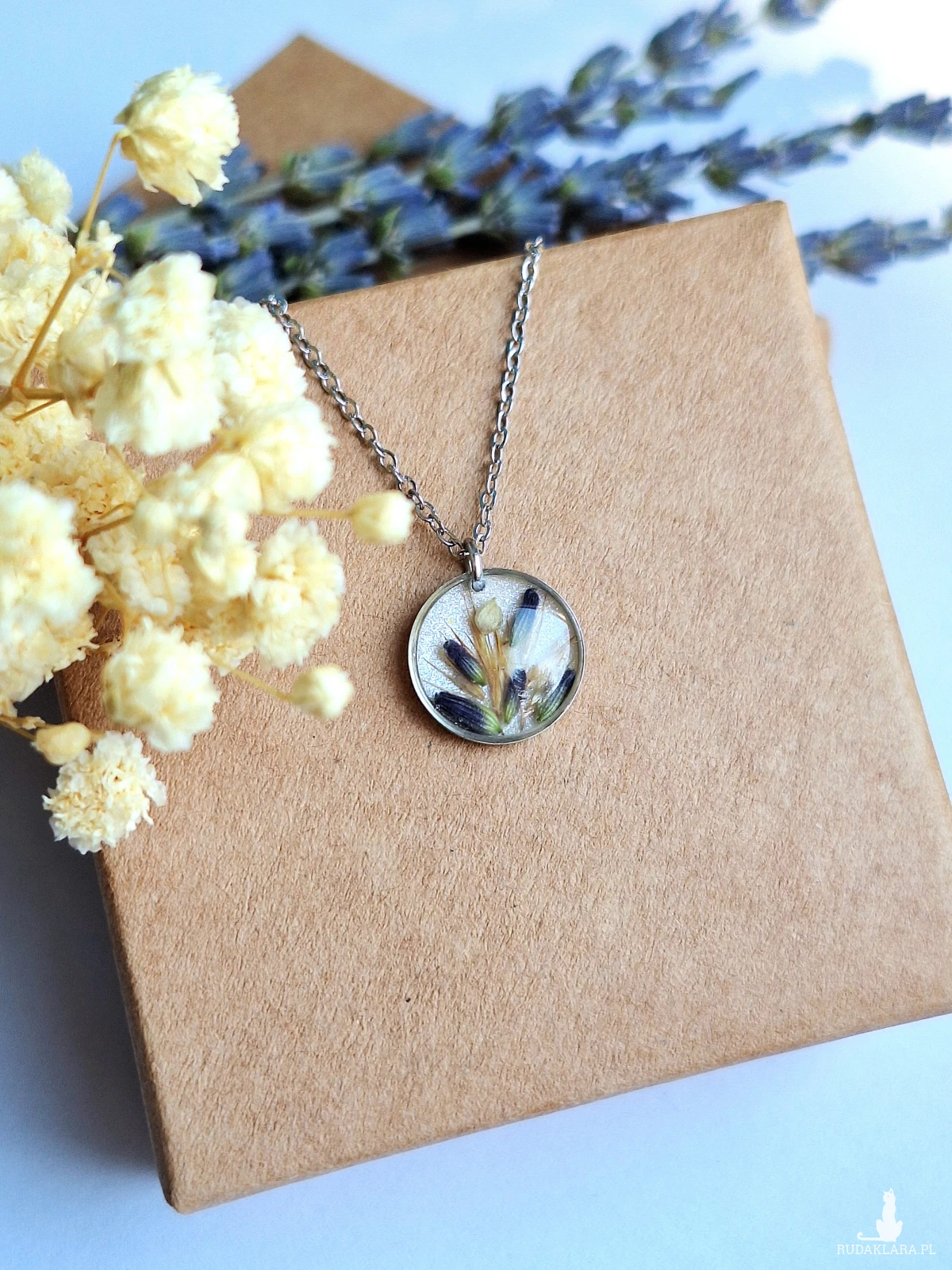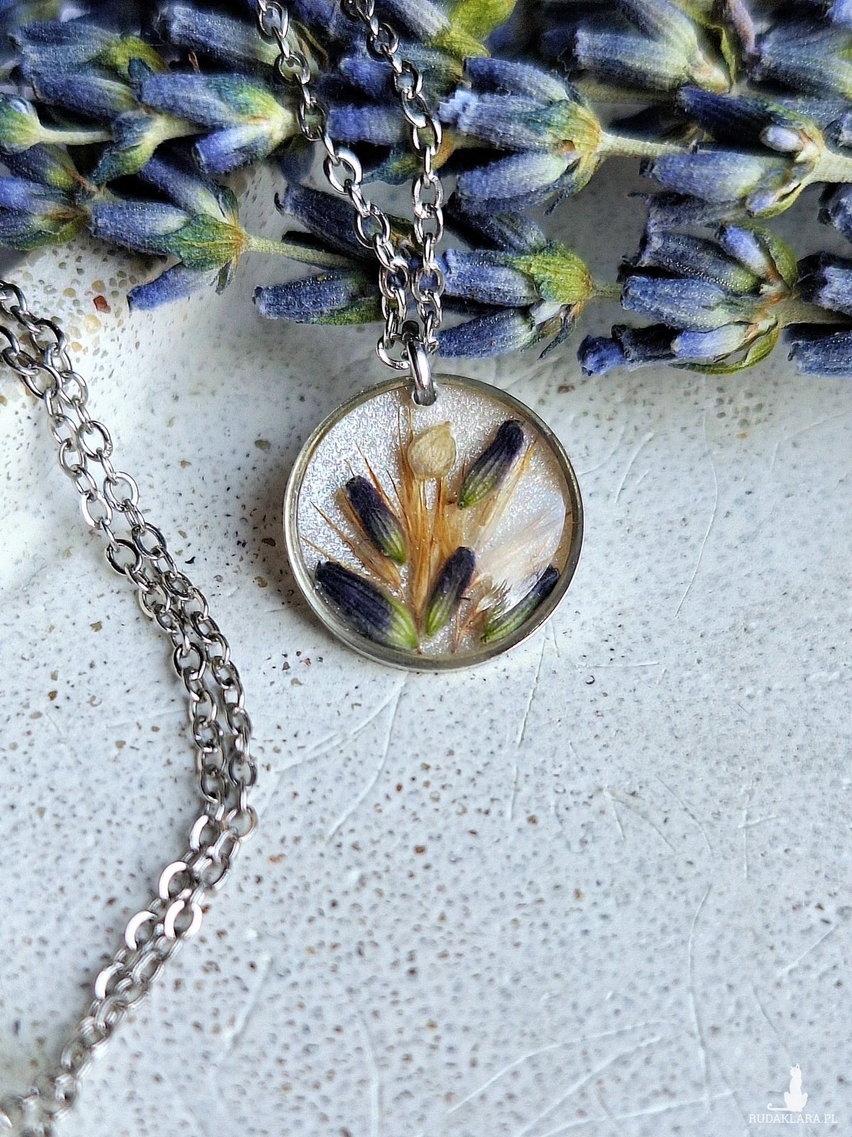 Uroczy wisiorek z zatopionymi kwiatami lawendy i trawą na białym brokatowym tle. Wykonana z wysokiej klasy żywicy, która nie zmienia koloru pod wpływem promieniowania uv oraz wysokiej jakości stali chirurgicznej.