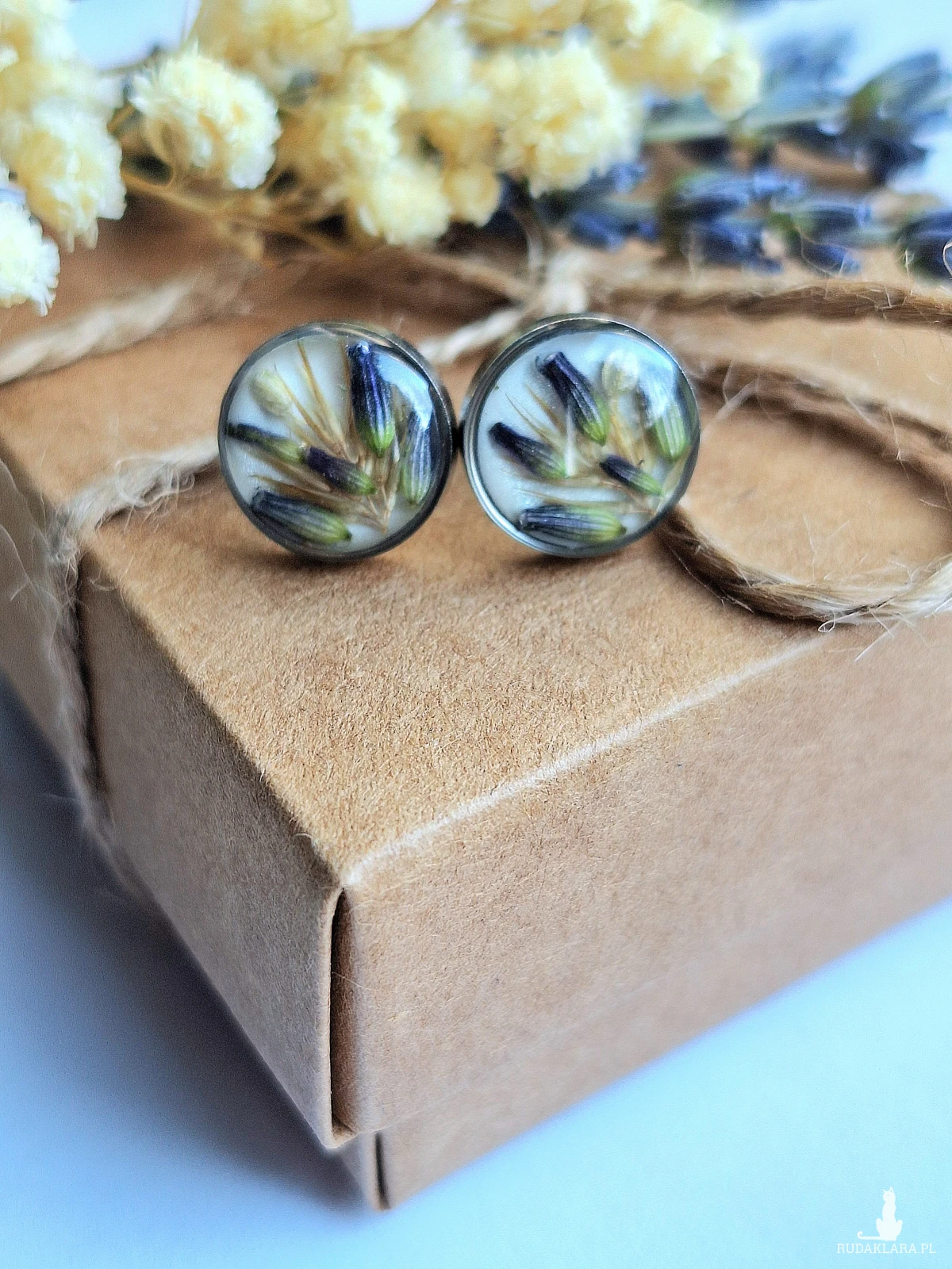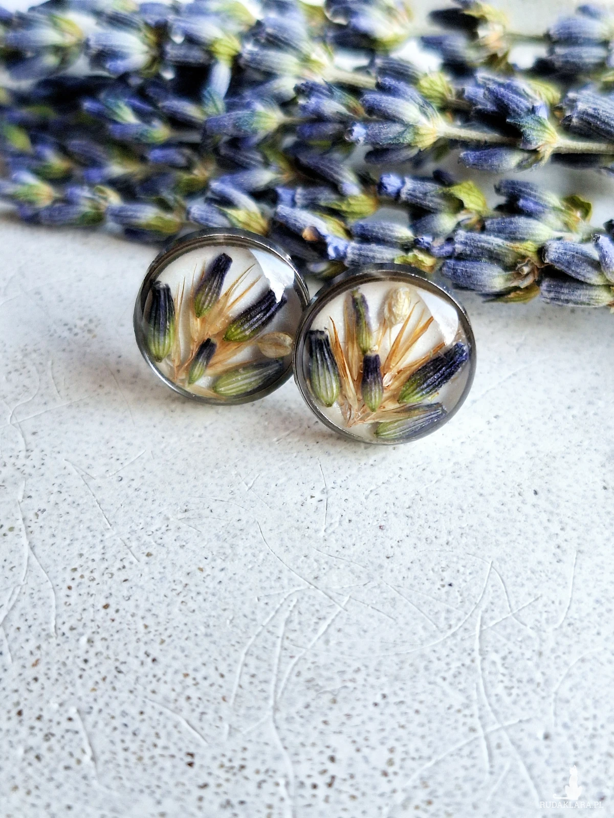 Urocze sztyfty z zatopionymi kwiatami lawendy i trawą na białym brokatowym tle. Wykonane z wysokiej klasy żywicy, która nie zmienia koloru pod wpływem promieniowania UV oraz wysokiej jakości stali chirurgicznej.