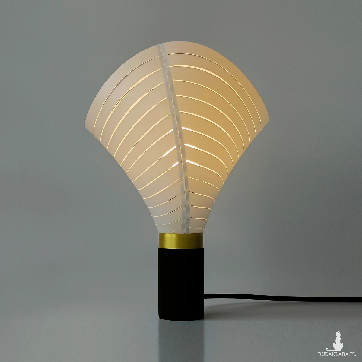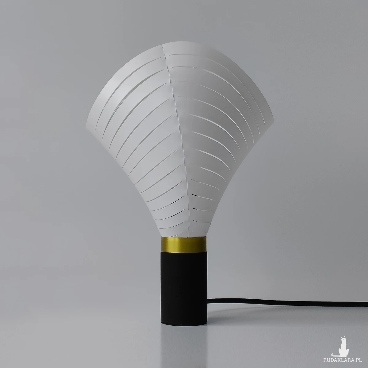 Lampka biurkowa, stołowa lub nocna. Wykonana z czarnego gipsu podstawa wysokości 7cm. Żarówka z ciepłym światłem pięknie współgra z całością (żarówka niedołączona). Abażur jest wykonany z białego tworzywa + pierścień ze złotego tworzywa. Pod podstawą znajduje się przymocowana podkładka z pianki – nierysująca mebli. Projektantem jest designer Michał Siełacz, założyciel marki Lampy Siełacz.