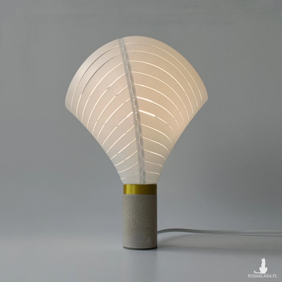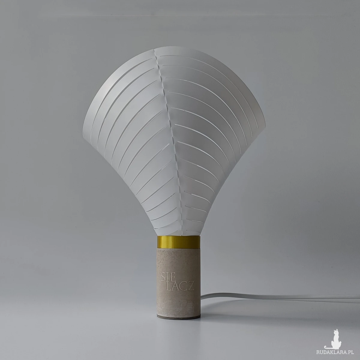 Lampka biurkowa, stołowa lub nocna. Wykonana z szarego gipsu podstawa wysokości 7cm. Żarówka z ciepłym światłem pięknie współgra z całością (żarówka niedołączona). Abażur jest wykonany z białego tworzywa + pierścień ze złotego tworzywa. Pod podstawą znajduje się przymocowana podkładka z pianki – nierysująca mebli. Projektantem jest designer Michał Siełacz, założyciel marki Lampy Siełacz.