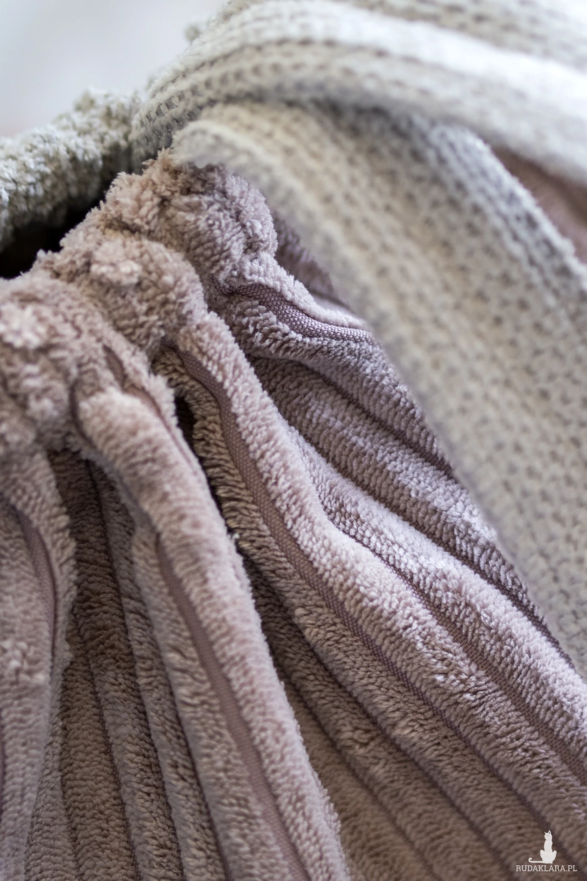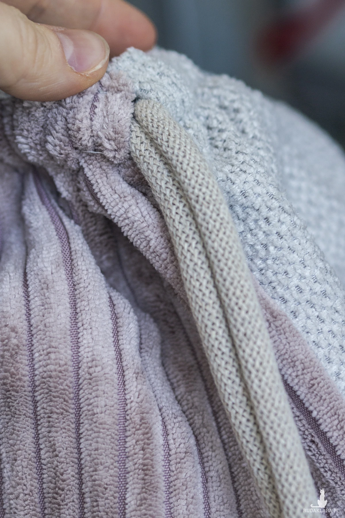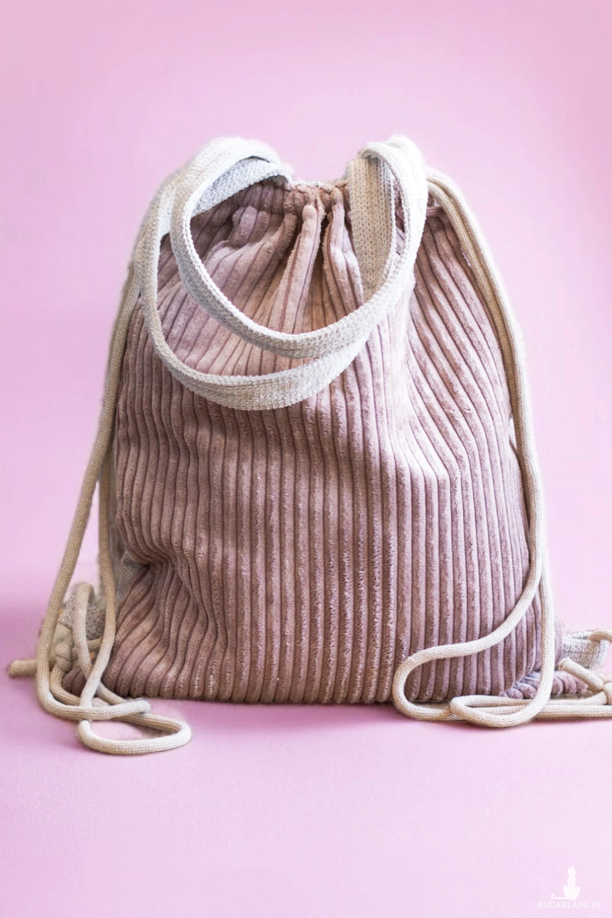 Plecakotorba worek 2w1 wykonana z grubego sztruksu w kolorze pudroworóżowym w połączeniu z jasną plecionką.
