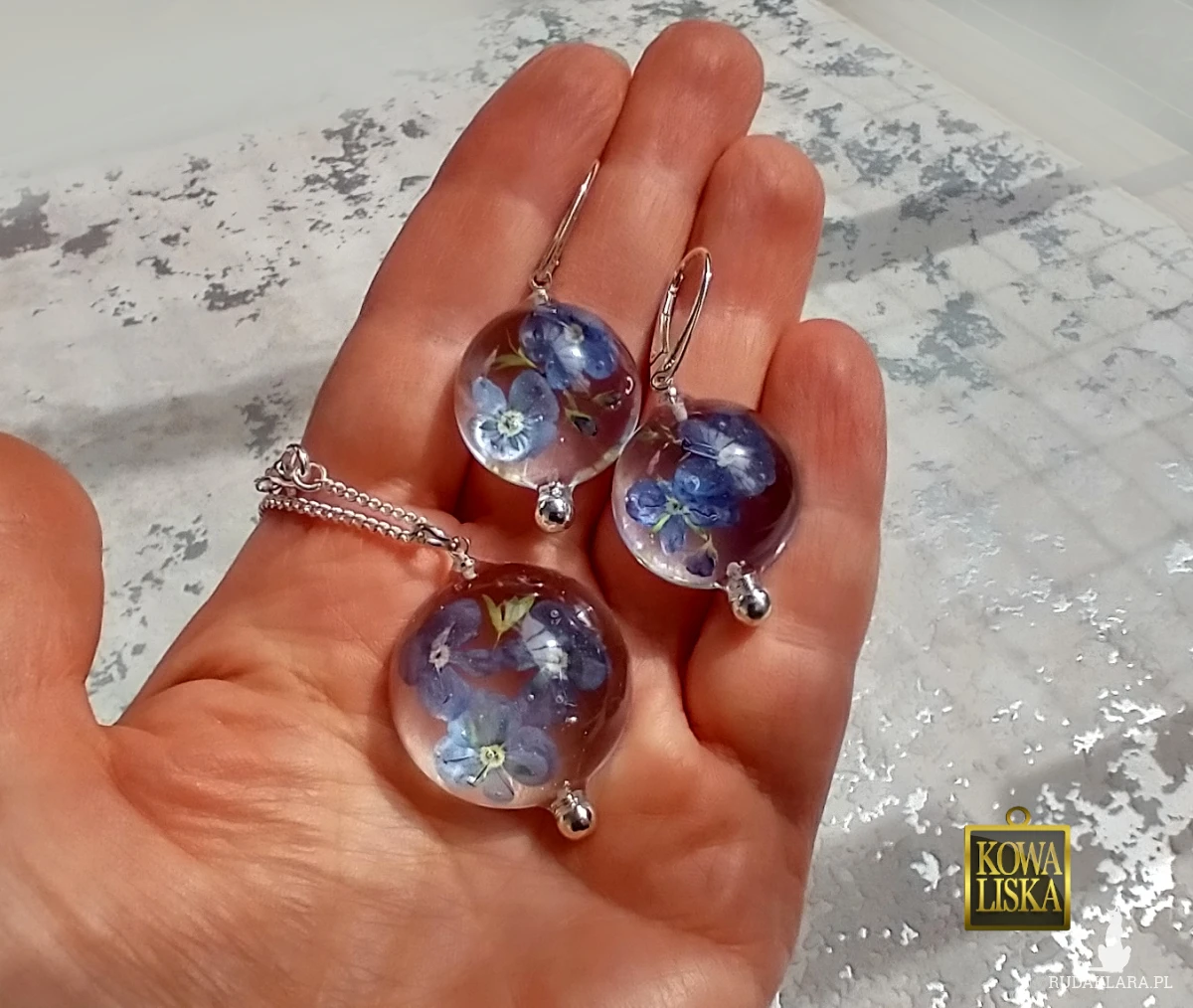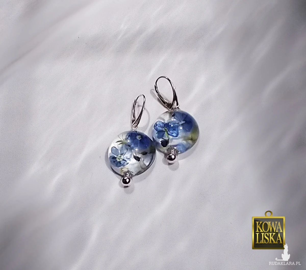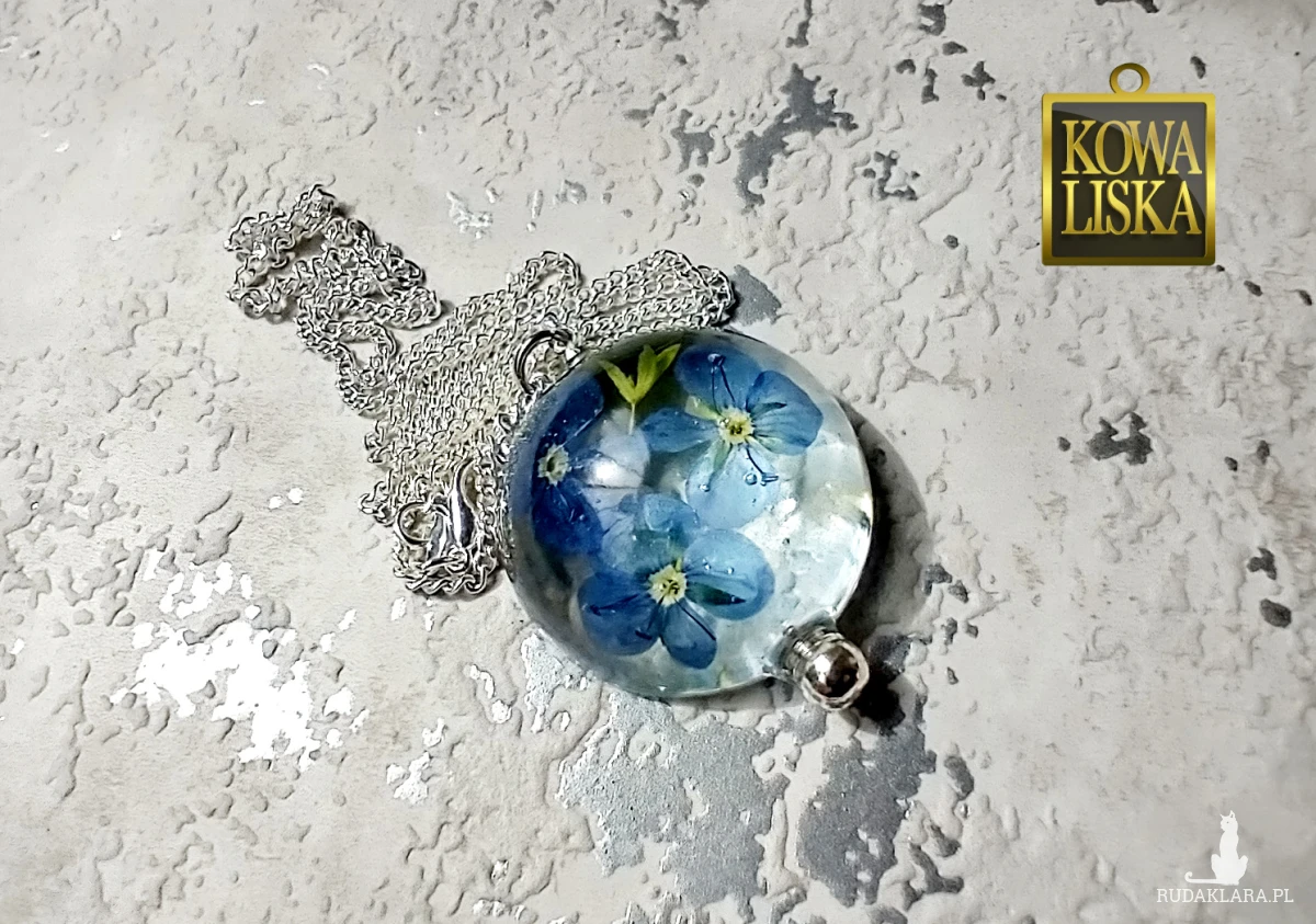 Delikatne, ulotne kwiatuszki przetacznika zamknięte w bąbelkach z krystalicznej żywicy. Wypełniając szkliste wnętrze, cudownie świecą eterycznym kolorem i rzucają przepiękne refleksy.