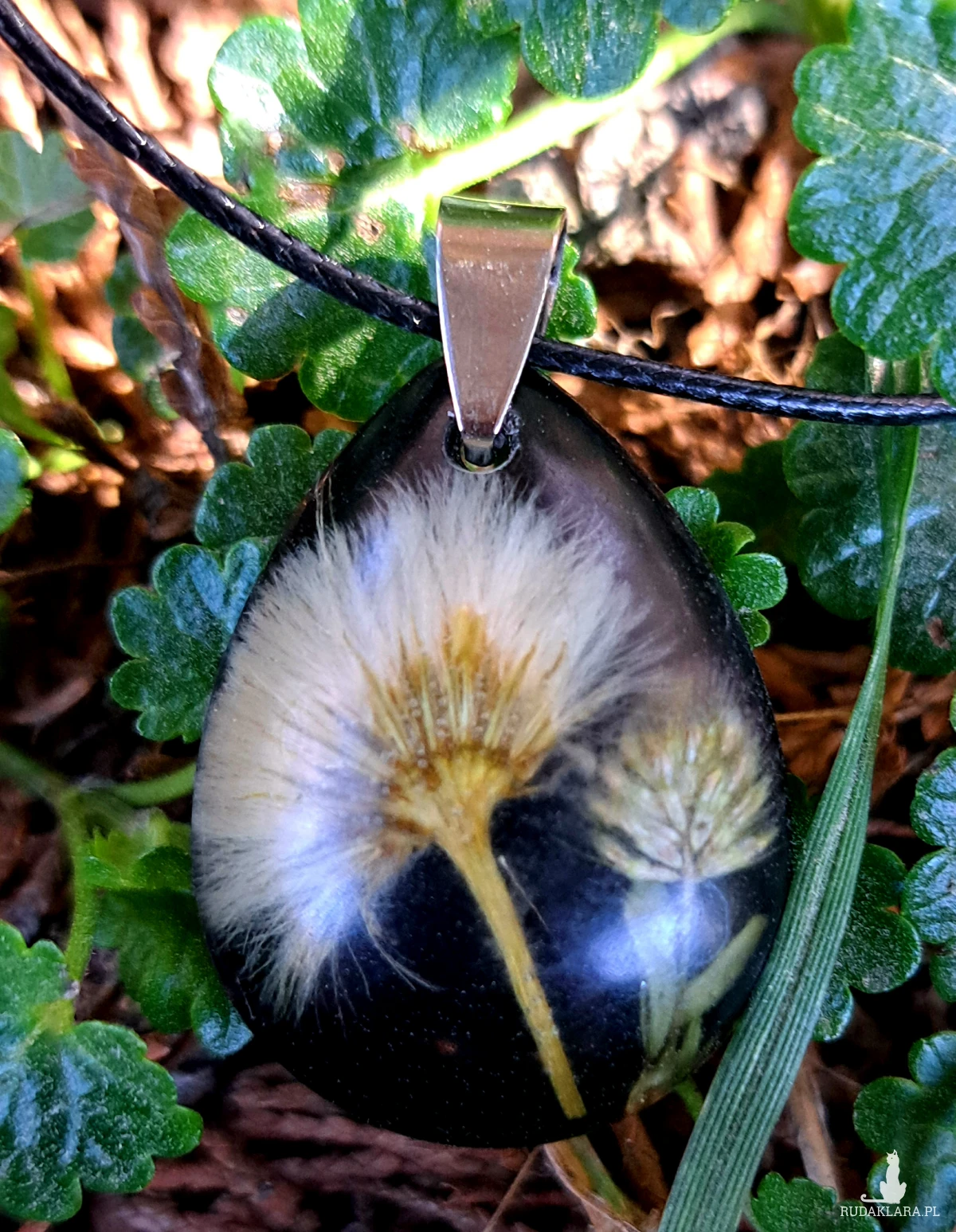 Naszyjnik na sznurku woskowanym z regulacją długości. Zawieszka wykonana z żywicy z zatopionym ziołem : jakubkiem starcem. Krawatka ze stali szlachetnej.
