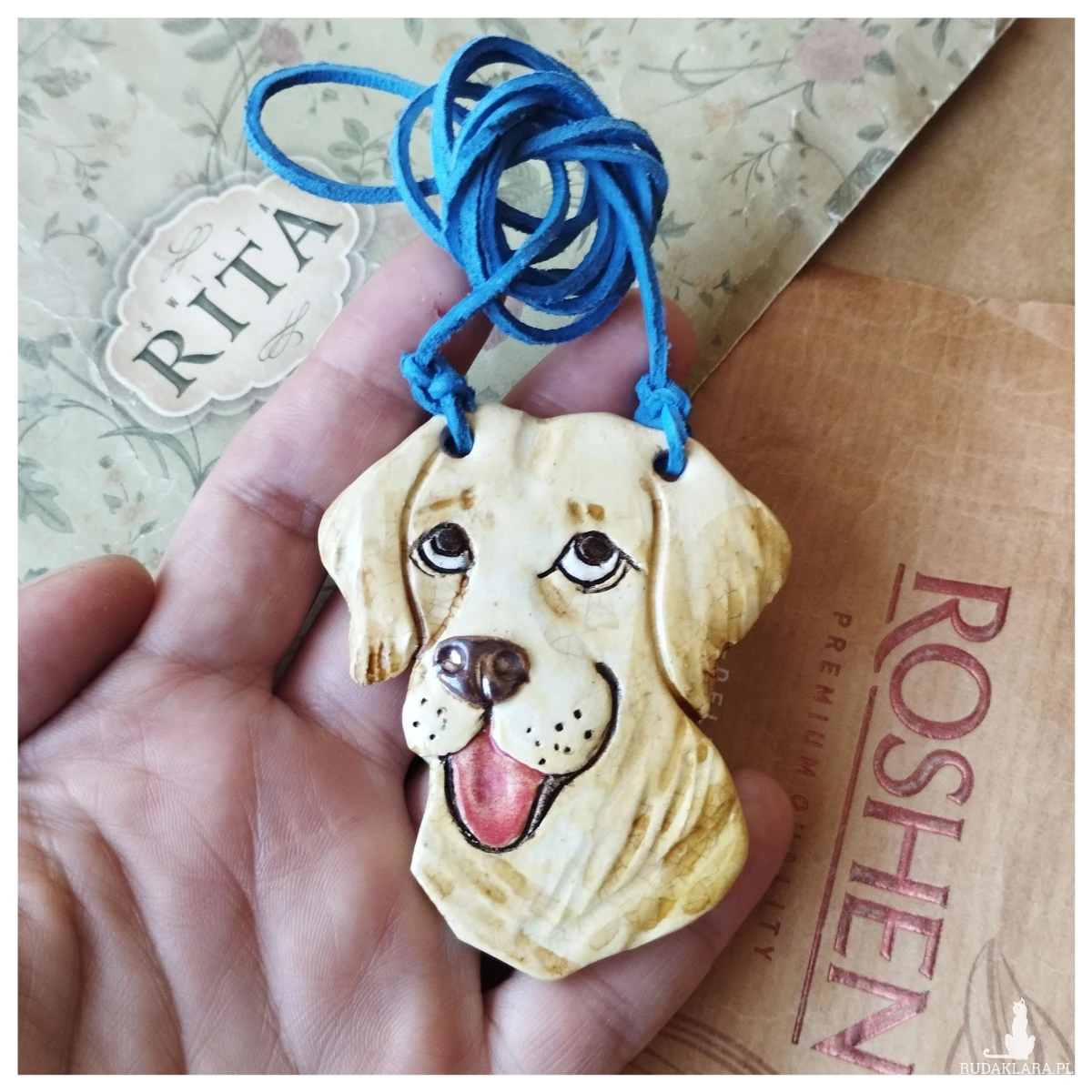 Piesek wisiorek ceramiczny, wykonany z gliny szamotowej, wypalony na biskwit, a następnie szkliwiony w temp ok 1260 stopni C. Polecam Paniom poszukującym nietuzinkowej biżuterii.