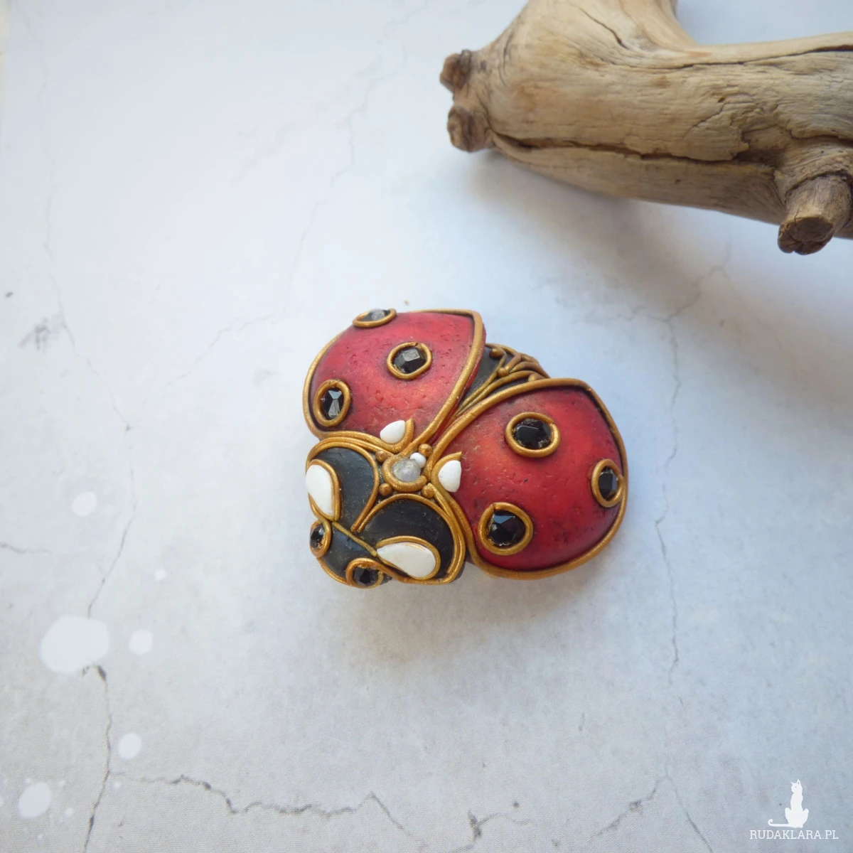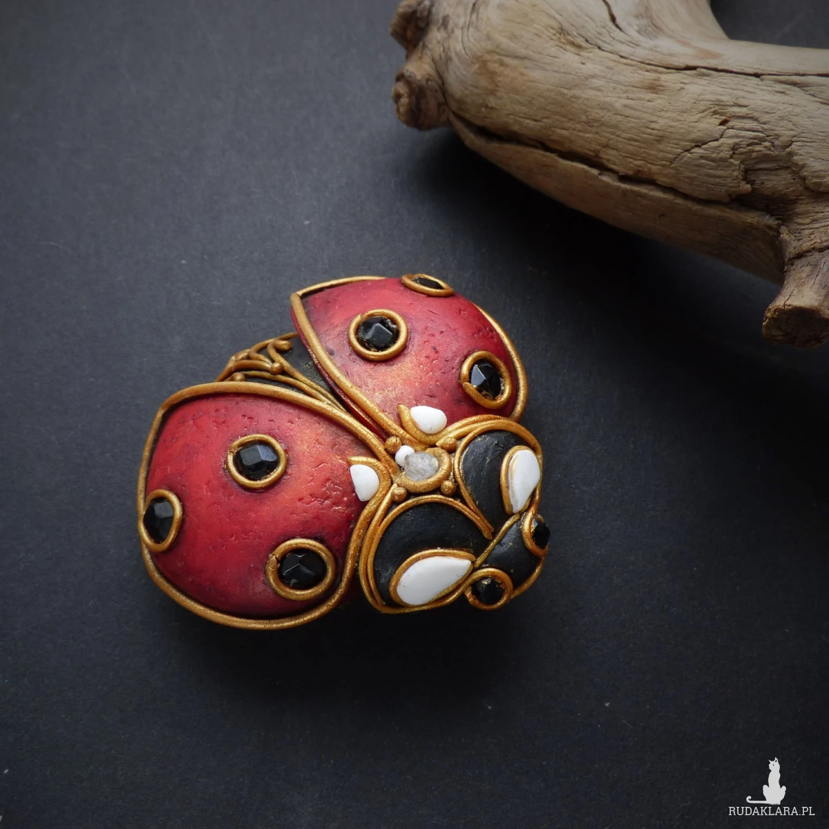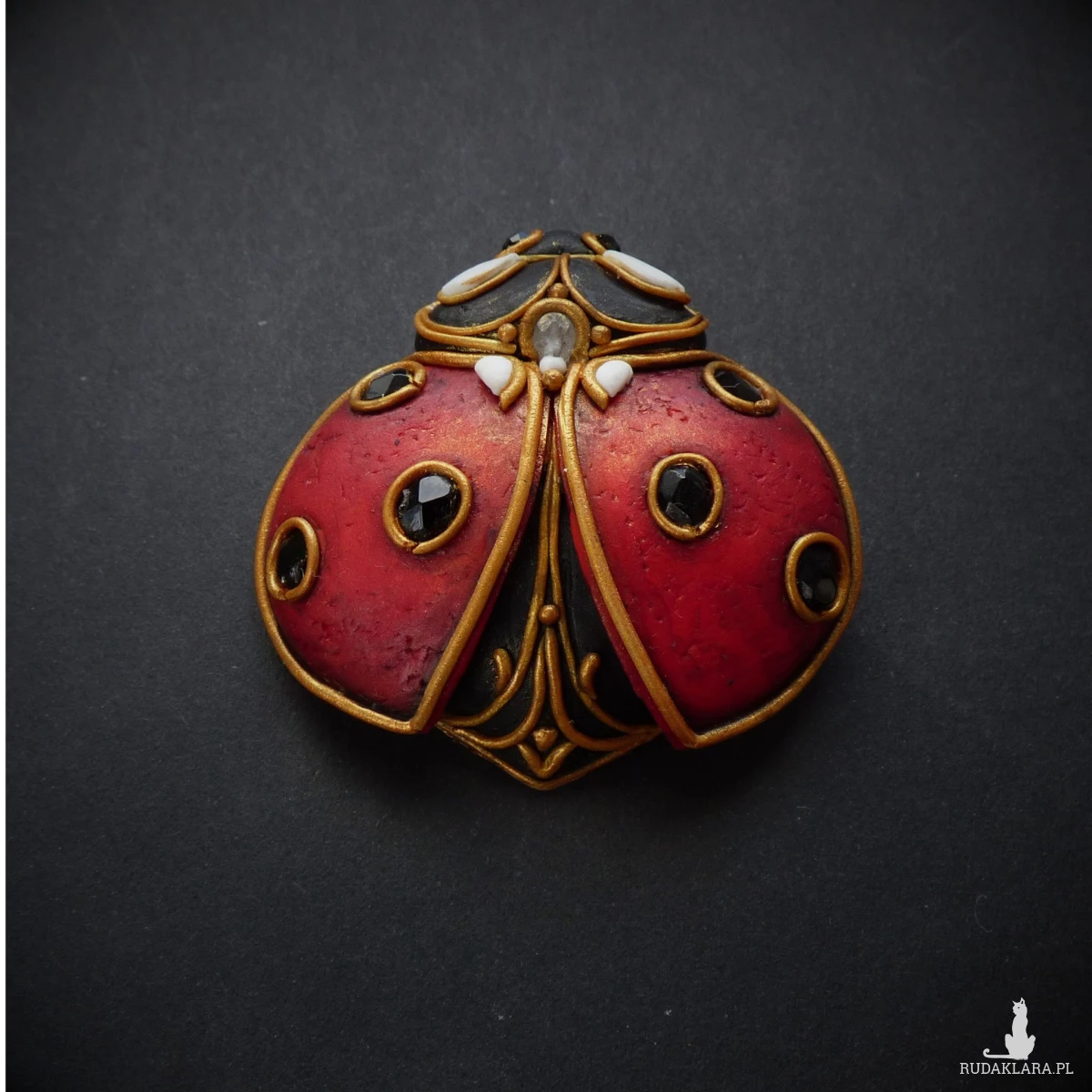 Broszko-wisiorek inspirowany biedronką – połączenie klasyki z naturą. Biedronka od wieków uchodzi za symbol szczęścia, ochrony i spełnionych marzeń. Ten misternie wykonany dodatek został stworzony z dbałością o każdy szczegół: skrzydełka w kolorze ciemnej czerwieni ozdobione są kropkami ze szklanych fasetowanych koralików, a oczka biedronki to czarne spinele – kamienie znane z ochronnych właściwości i głębokiego, magnetycznego połysku.