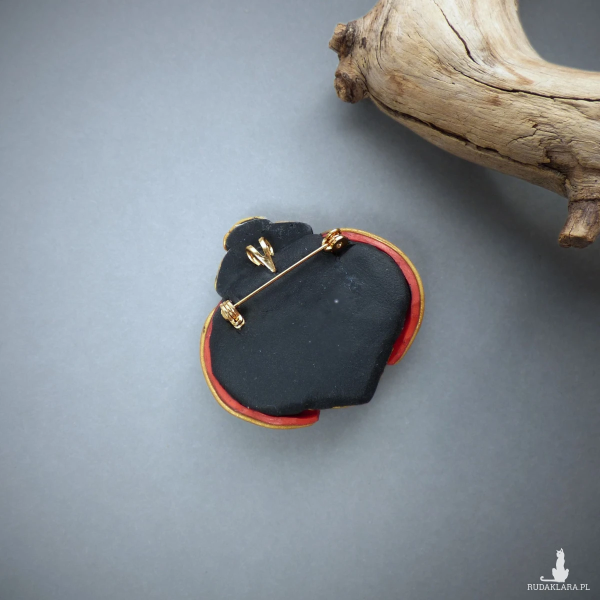 Materiały: glinka polimerowa (modelina Fimo), zapięcie broszkowe z blokadą zabezpieczającą przed przypadkowym otwarciem (stal szlachetna w kolorze złotym), farby akrylowe, czarny spinel fasetowany, szklane koraliki.