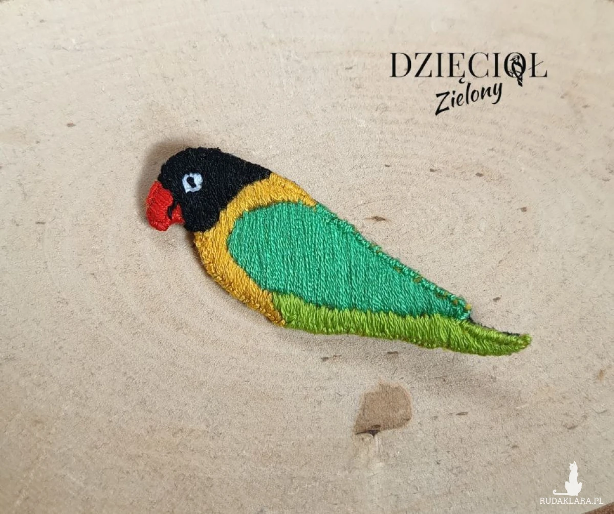 Ręcznie haftowana broszka nierozłączka czarnogłowa. Idealny dodatek dla miłośników ptaków 🙂