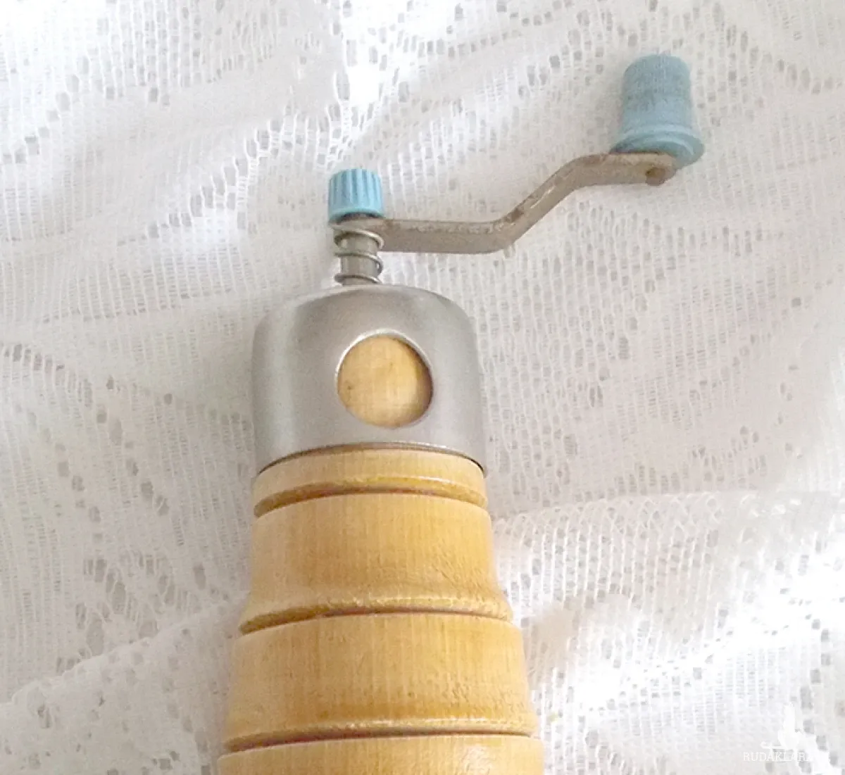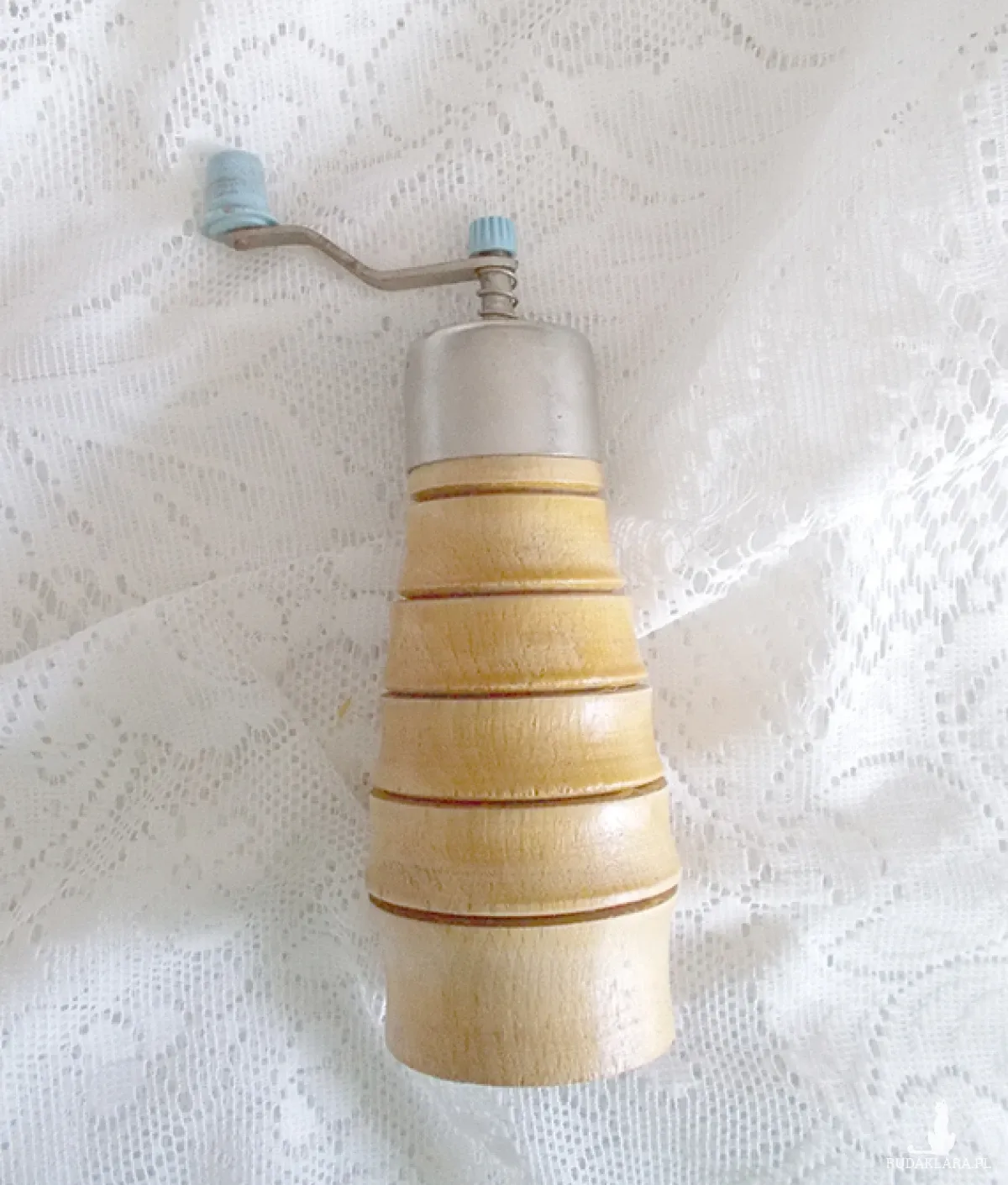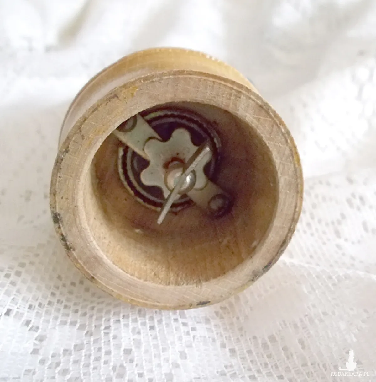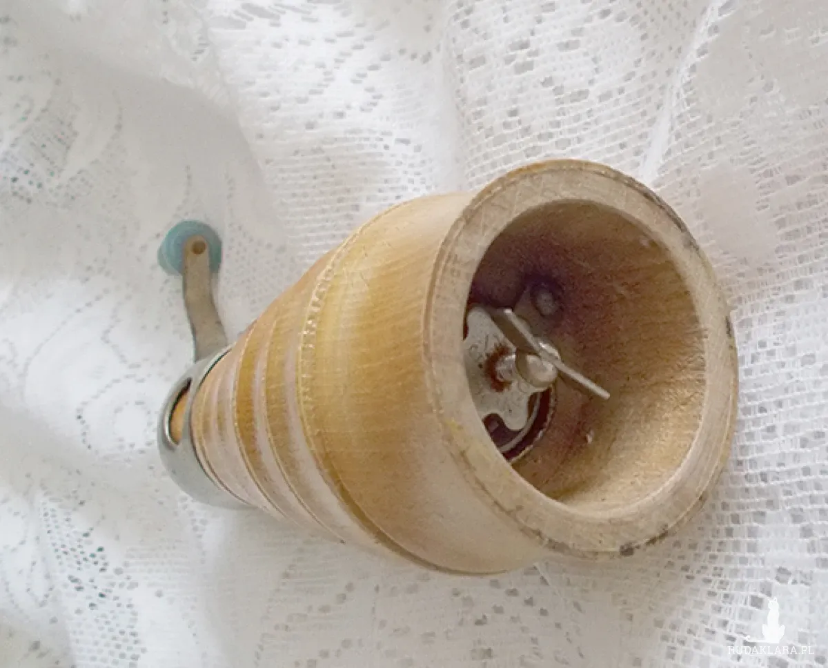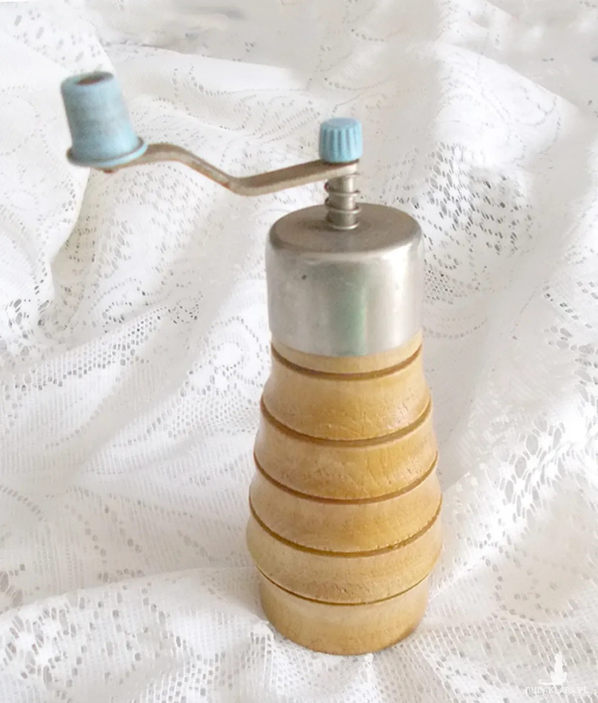Oryginalny przedmiot vintage z czasów PRL. Retro młynek ręczny do mielenia pieprzu. Materiał: drewno, metal, zakończenie tworzywo. Posiada ślady upływu czasu i użytkowania, otarcia, rdza itp. Nie wiem na ile jest sprawny, więc sprzedawany jako retro ozdoba do kuchni. Wymiary wys. ok. 15,5 cm x szer. 5 cm.