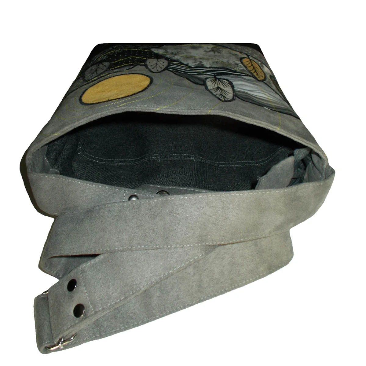 NIEPOWTARZALNA, jedna jedyna, autorska torba z eko zamszu. Tył torby w kolorze paska (szary). Pasek z tego samego materiału co całość, z regulacją, wzmocniony nitami, okucia srebrne. Przód zdobią aplikacje układające się w niepowtarzalny pejzaż. Cała torba trzyma kształt. W szwach wypustka. Denko poszerzone. Całość zapinana na zamek. Jedna z wewnętrznych kieszeni jest również zapinana na zamek. Druga kieszeń pomieści telefon, długopis i notesik. szerokość 32cm, wysokość 30cm plus denko 8cm