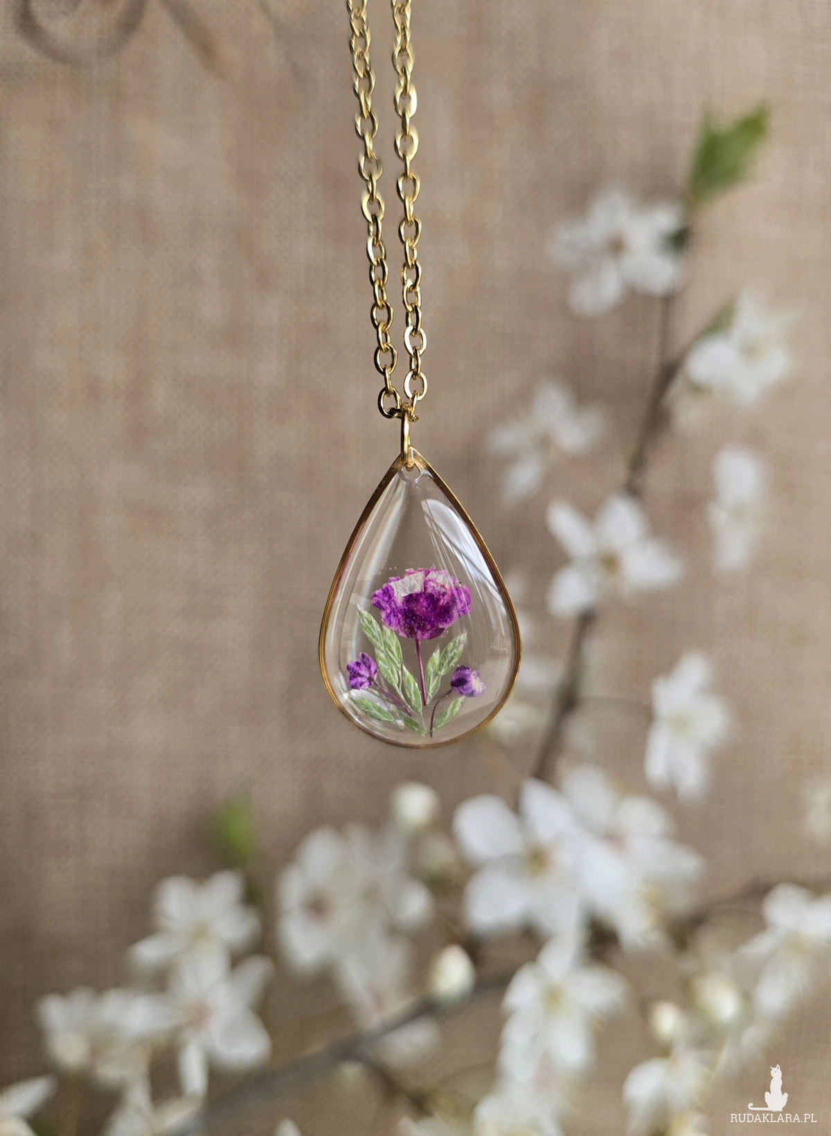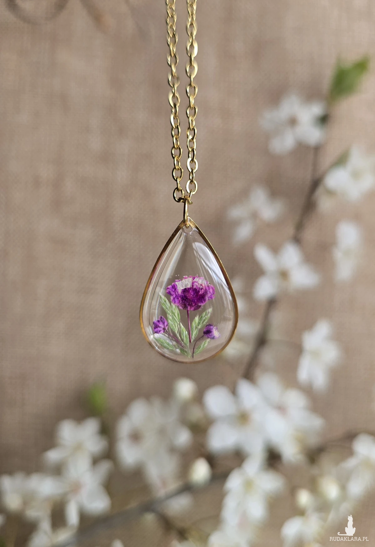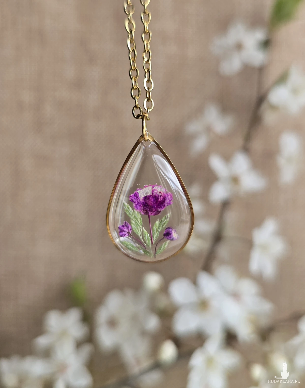 Oferuję Państwu unikalną biżuterię. Zawieszka jest wykonana z suszonych kwiatów i żywicy epoksydowej. Biżuteria jest wspaniałym i oryginalnym prezentem na lata.