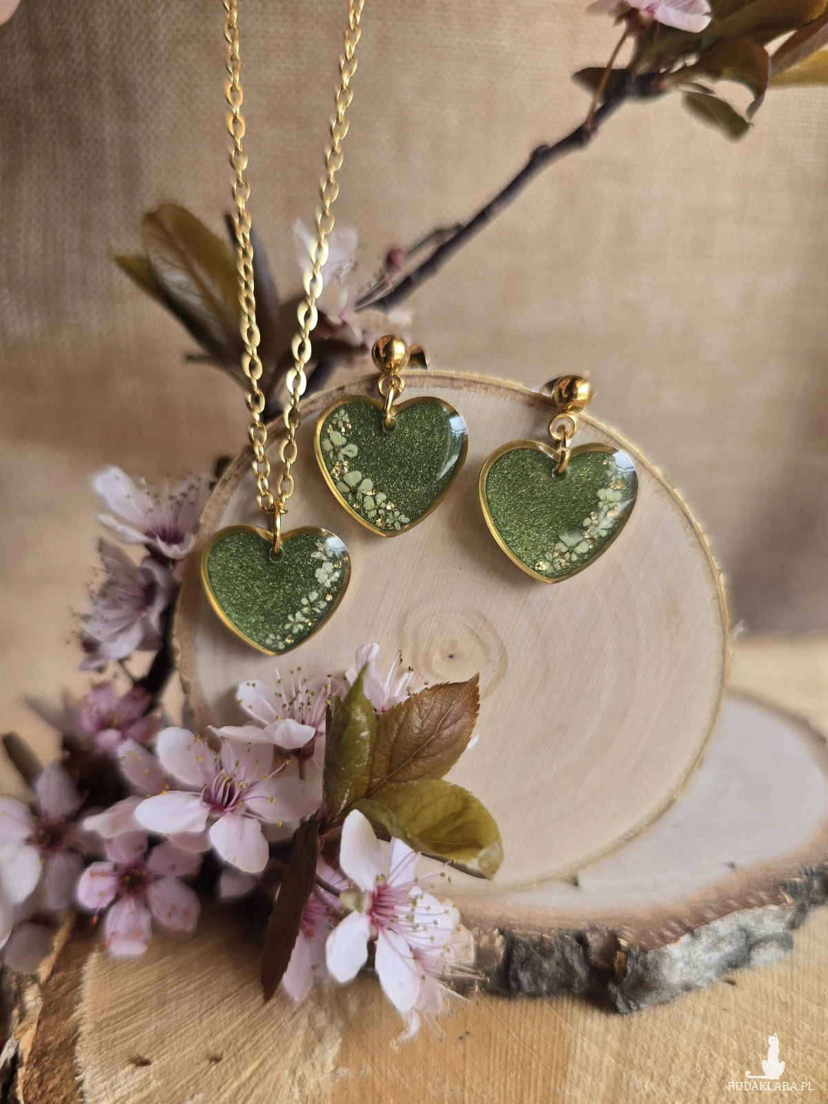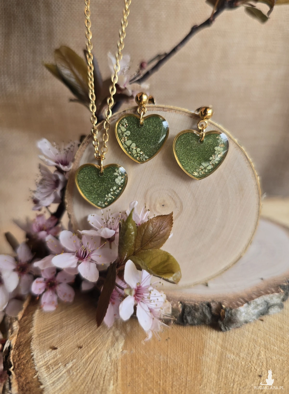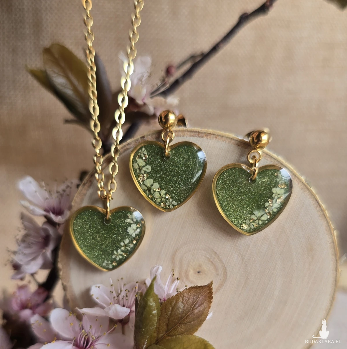 Oferuję Państwu unikalną biżuterię. Komplet jest wykonany z suszonych kwiatów i żywicy epoksydowej. Biżuteria jest wspaniałym i oryginalnym prezentem na lata.