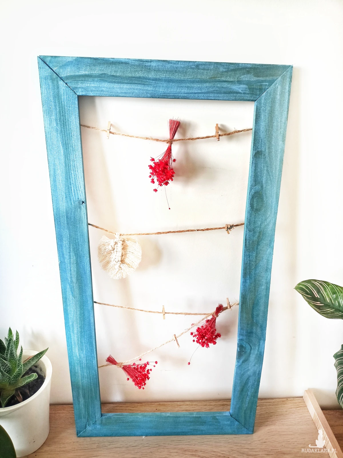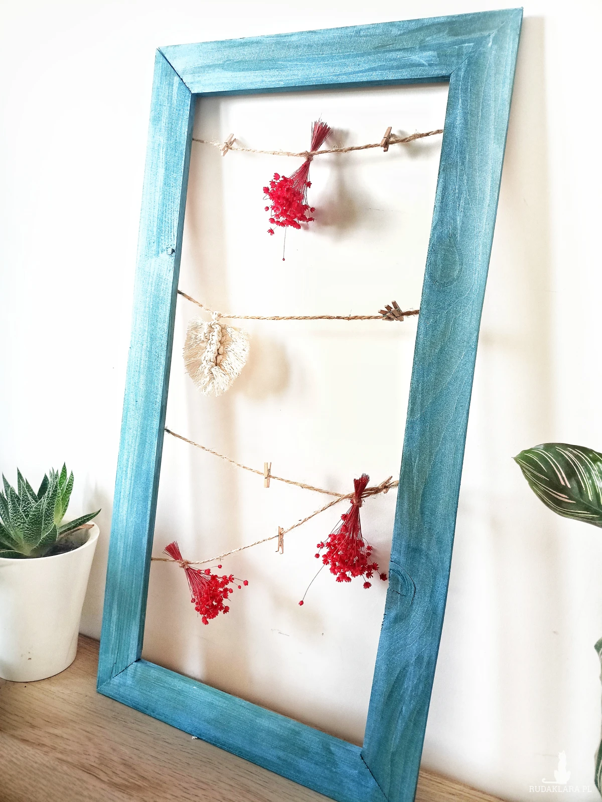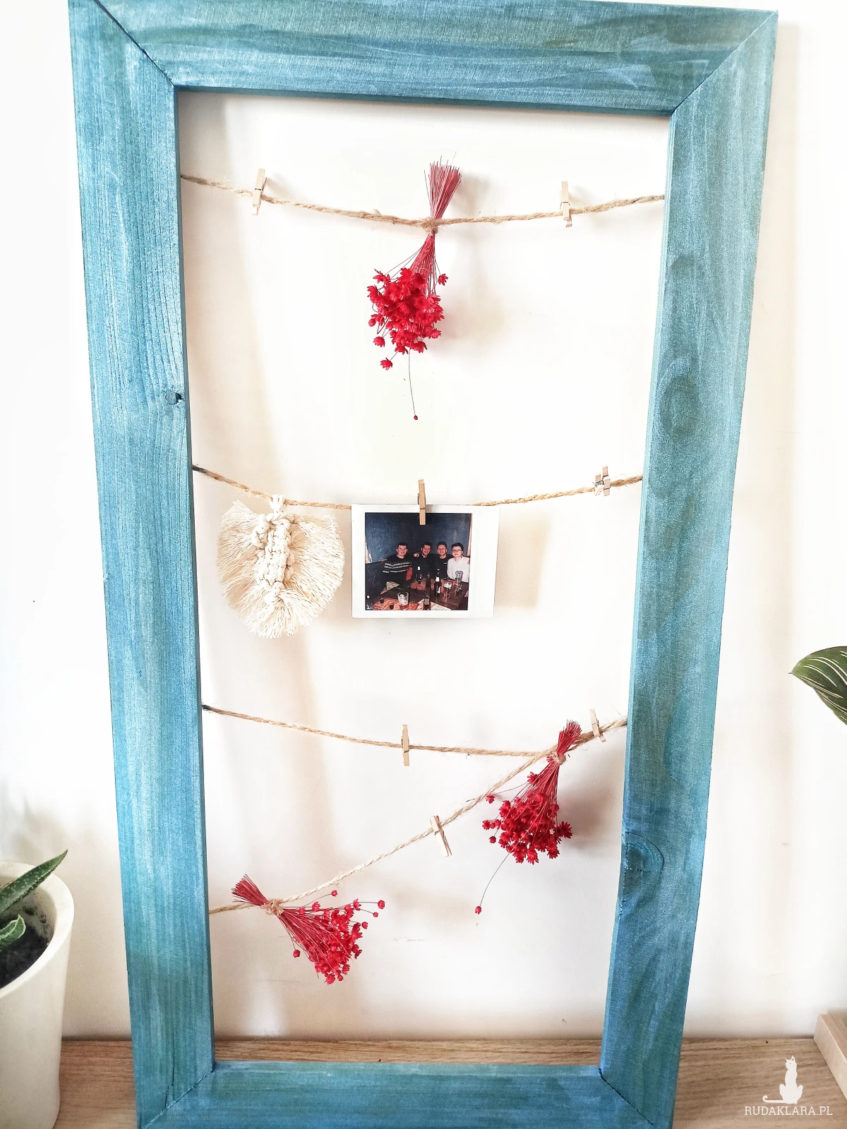 Rama wyposażona jest w sznurki i klamerki, które umożliwiają łatwe zawieszanie fotografii, pocztówek czy inspirujących cytatów. To nie tylko funkcjonalna dekoracja, ale również piękny element wystroju w stylu rustykalnym lub boho.