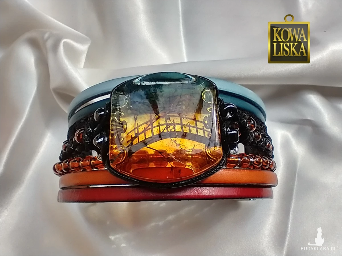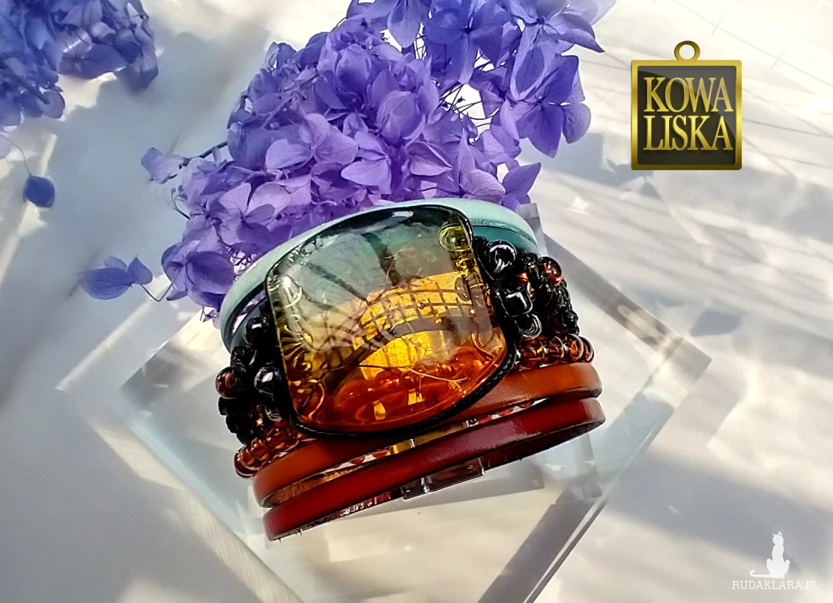 Oryginalna , bogato zdobiona i bardzo szeroka bransoletka w kolorach bursztynu, słońca i gorącego lata.
