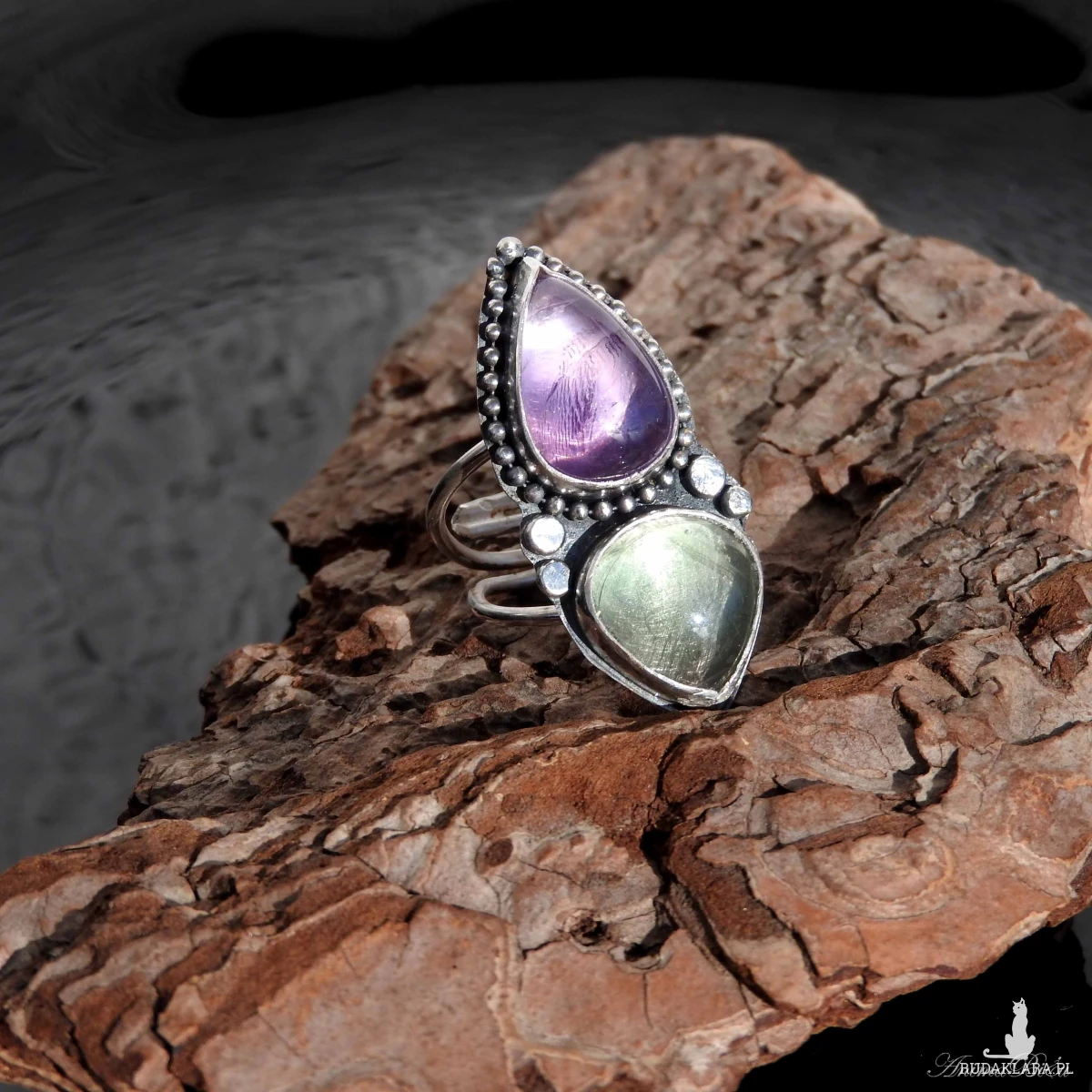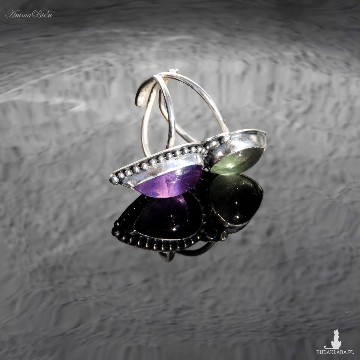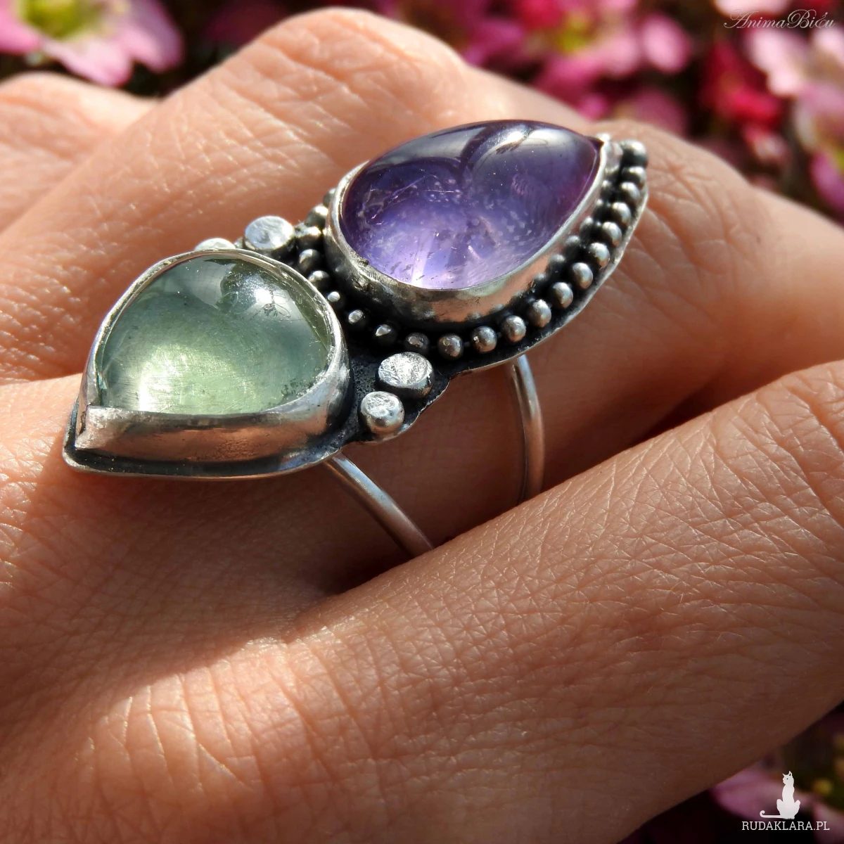 Pierścionek srebrny z ametystem i fluorytem. Wykonany od