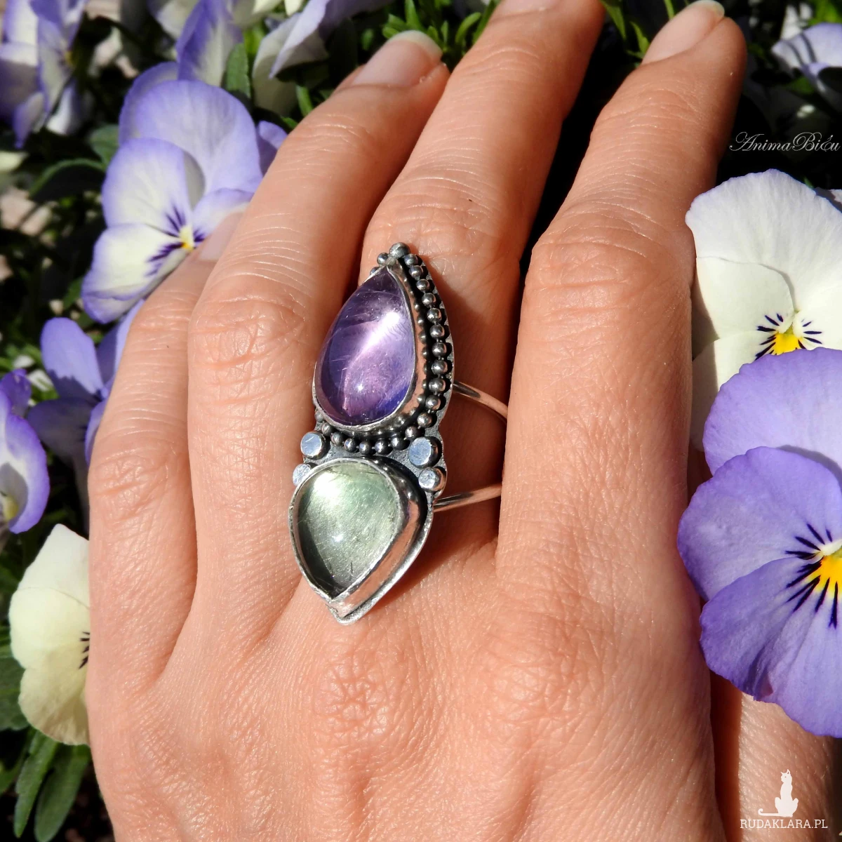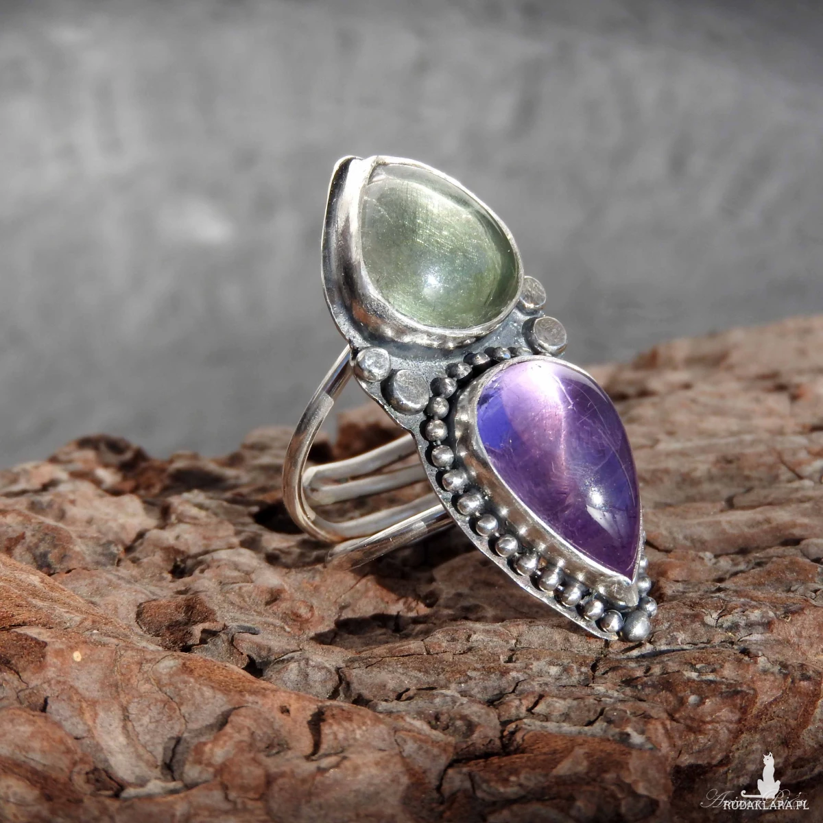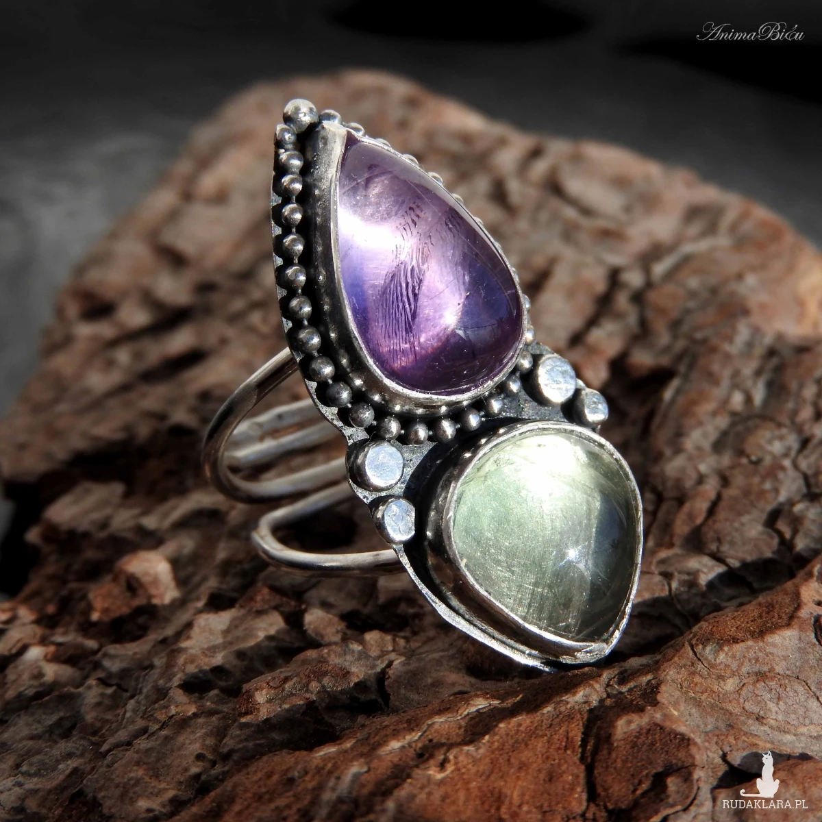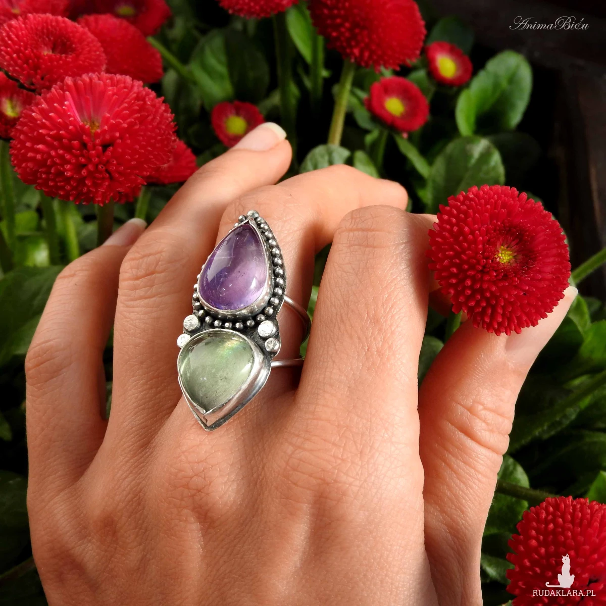 Pierścionek srebrny z ametystem i fluorytem. Wykonany od
