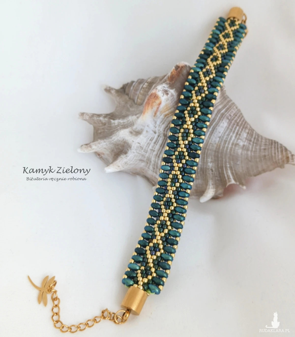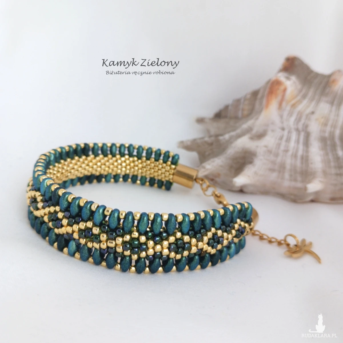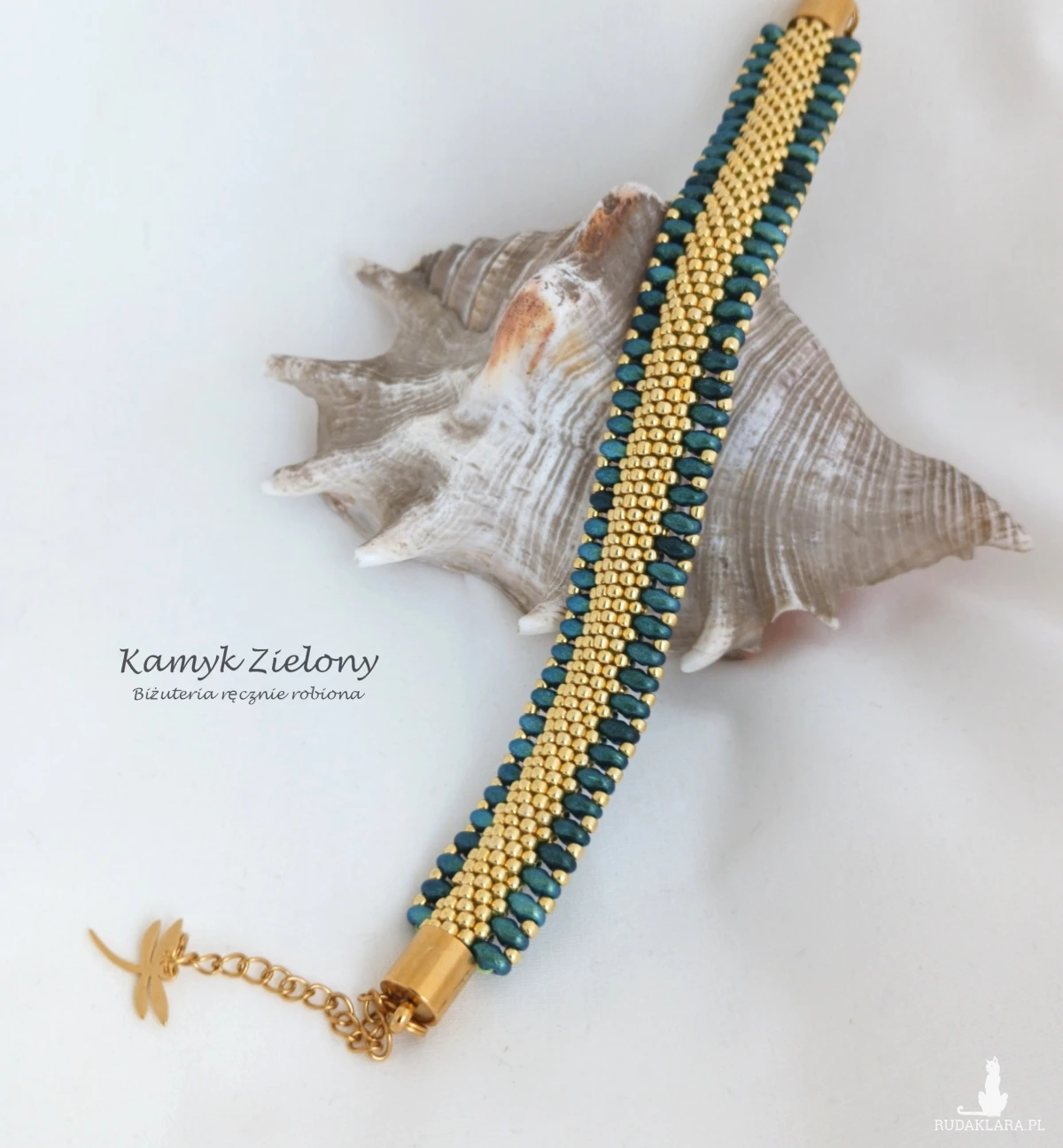Bransoletka wykonana z wysokiej jakości szklanych koralików Toho w kolorze ciemnej zieleni oraz złotym. Brzegi bransoletki zrobiono z dwudziurkowych koralików SuperDuo w kolorze zielonym o satynowym połysku.