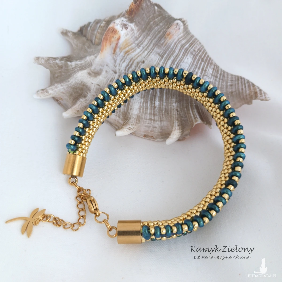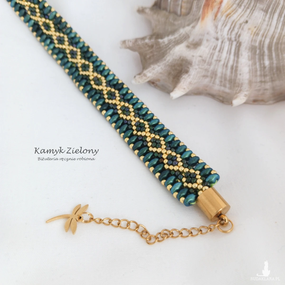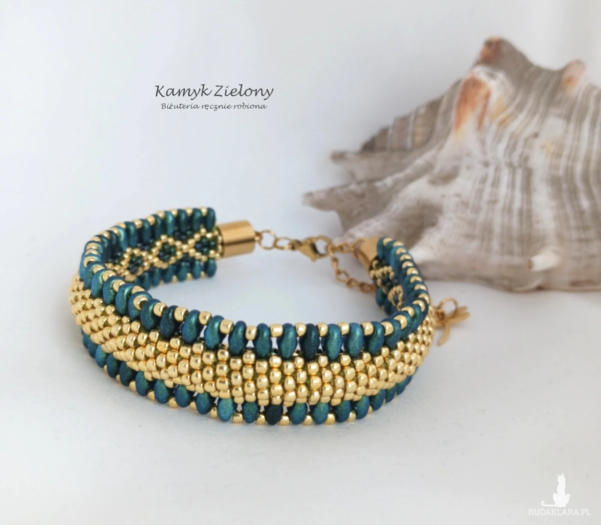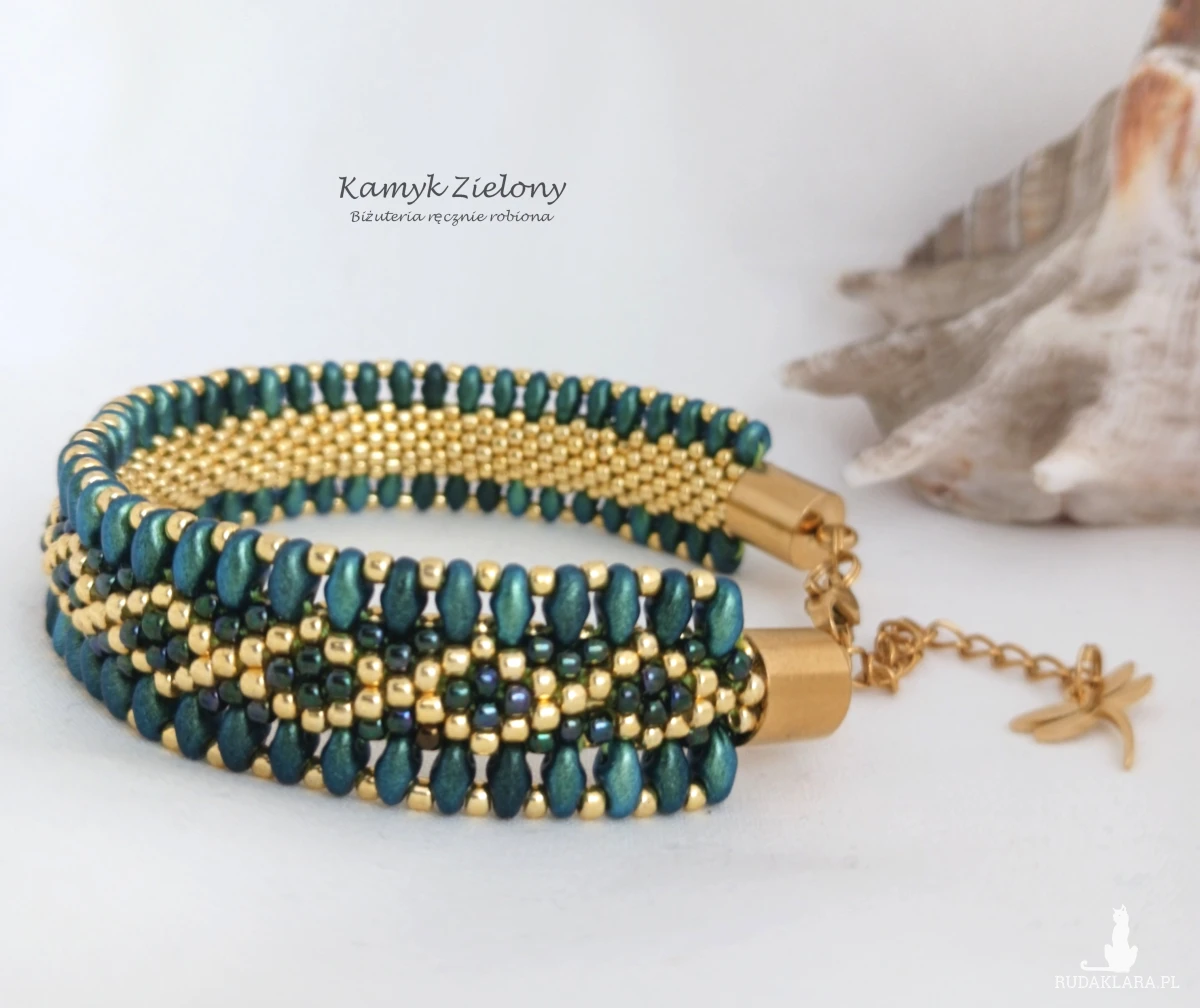 Bransoletka wykonana z wysokiej jakości szklanych koralików Toho w kolorze ciemnej zieleni oraz złotym. Brzegi bransoletki zrobiono z dwudziurkowych koralików SuperDuo w kolorze zielonym o satynowym połysku.