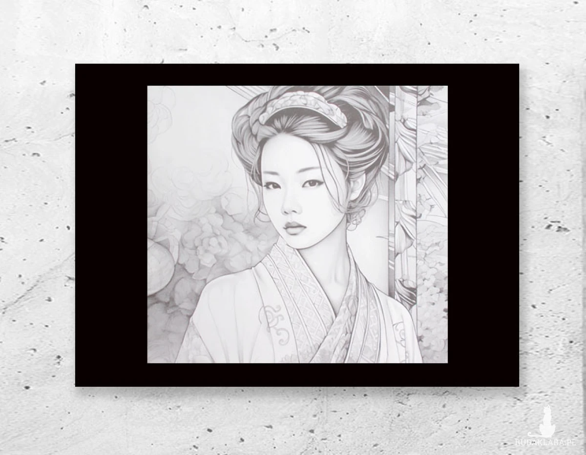 Nowy plakat w stylu vintage. Czarno biały obrazek z japońską dziewczyną na białym kartoniku w formacie A4. Poster wystarczy dać do ramki 21 x 30 cm. Dekoracja na ścianę do salonu, biura, gabinetu, pokoju młodzieżowego, sypialni, jadalni, restauracji, kawiarni, cukierni, herbaciarni itp. Plakat będzie pasowała zarówno do wnętrz urządzonych nowocześnie, jak i do tych bardziej klasycznych.