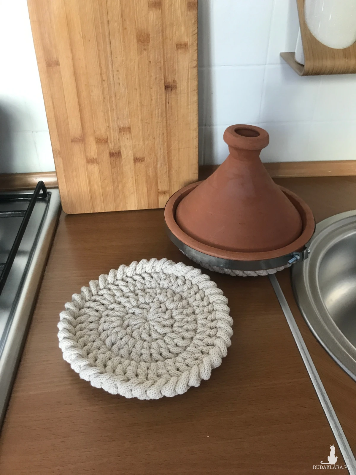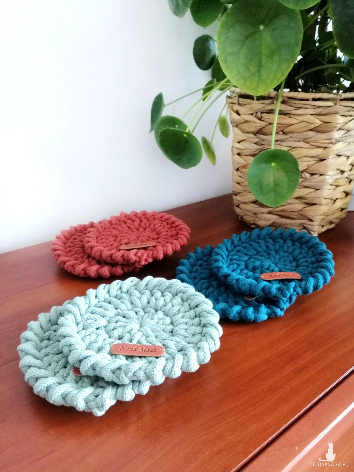W sprzedaży okrągła podkładka pod kubek wykonana na szydełku z sznurka bawełnianego o średnicy 5mm.