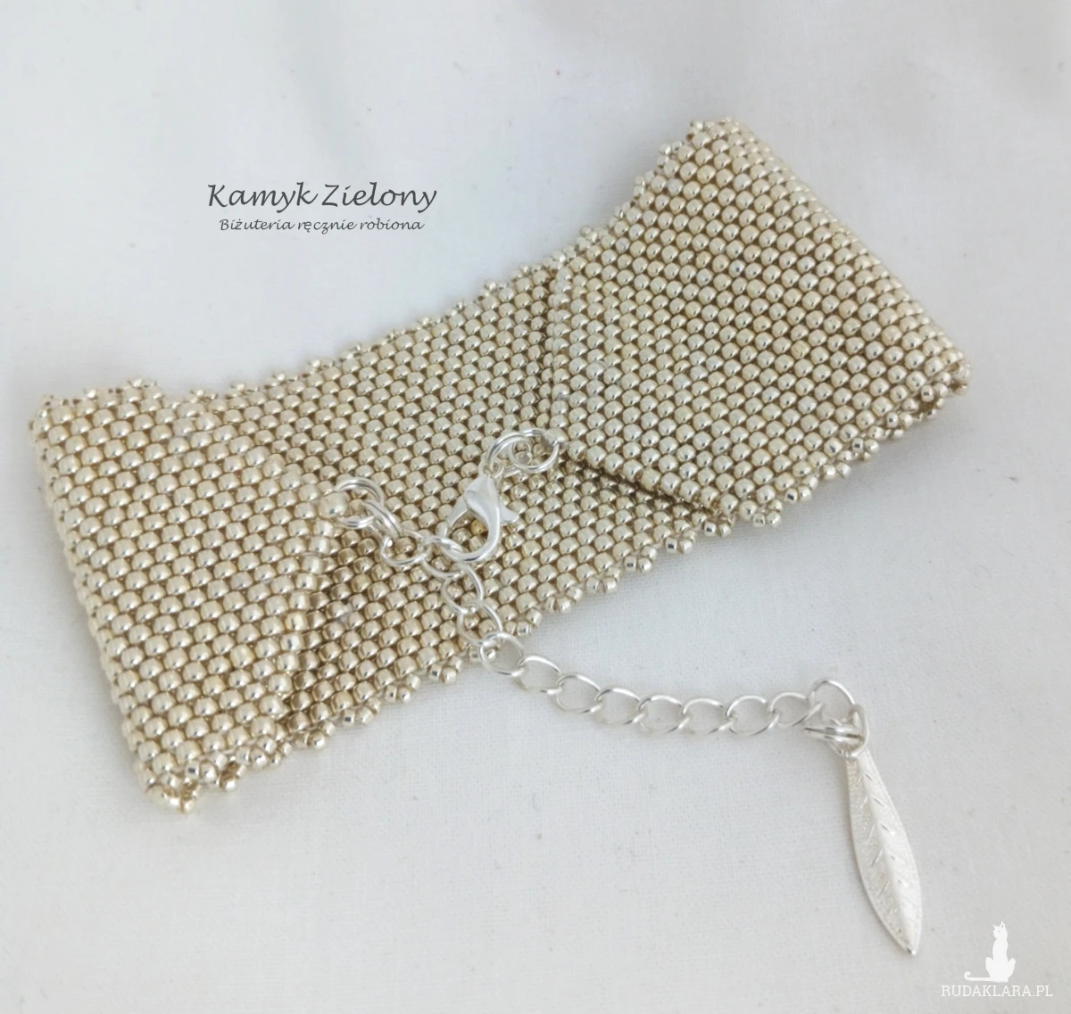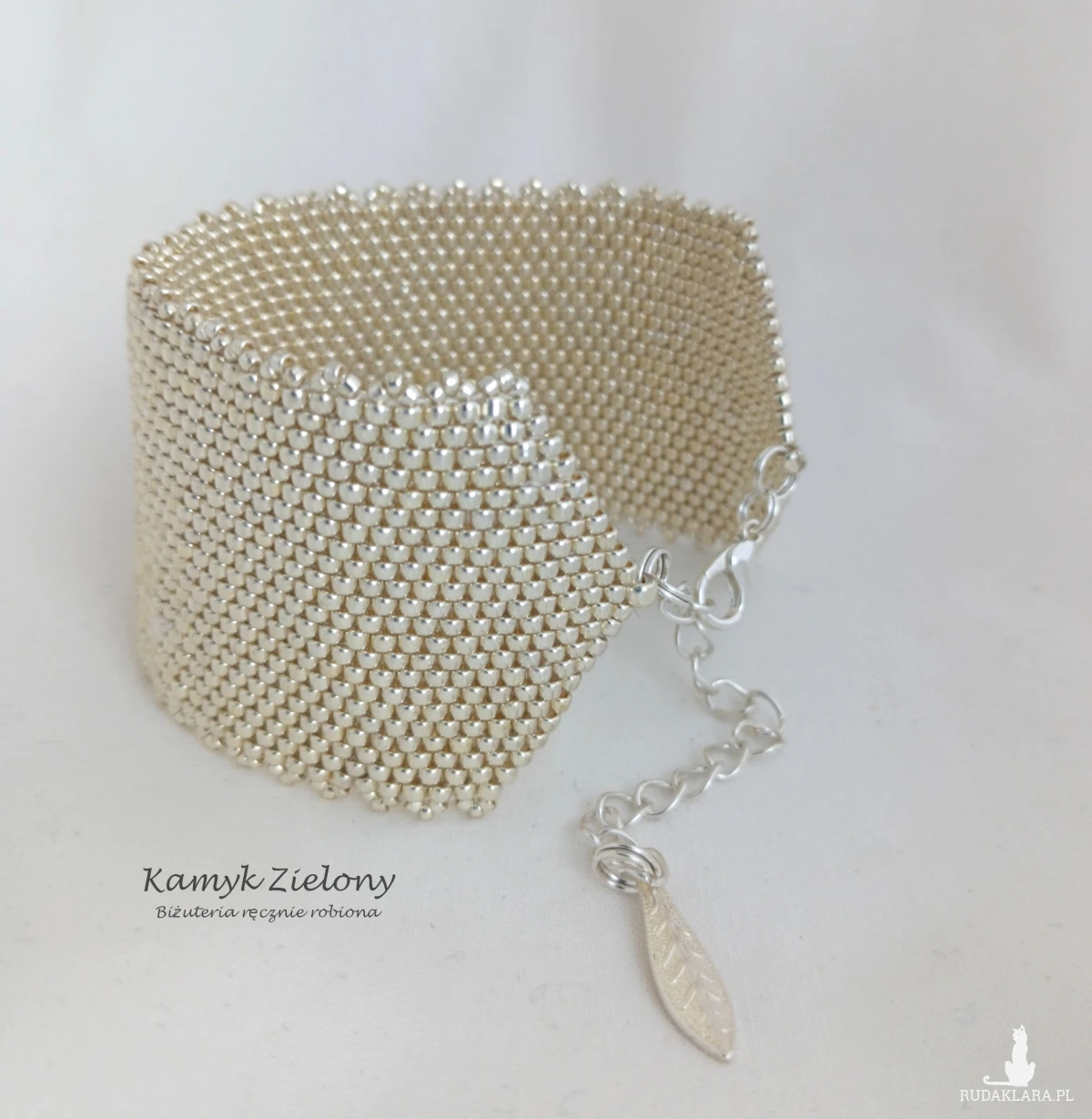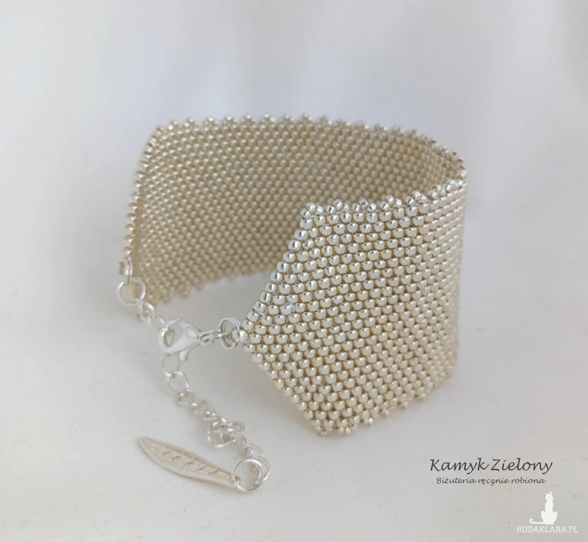 Szeroka, mankietowa bransoletka uszyta ręcznie z wysokiej jakości japońskich, szklanych koralików Toho w kolorze jasnego srebra. Do jej wykonania użyto koralików o odcieniu Galvanized Aluminium - z trwałą, metaliczną powłoka, która została naniesiona na szklane koraliki w procesie produkcji metodą galwanizowania. Dzięki temu kolor koralików jest bardzo trwały - nie ściera się, ani nie ulega zmatowieniu w trakcie użytkowania biżuterii.