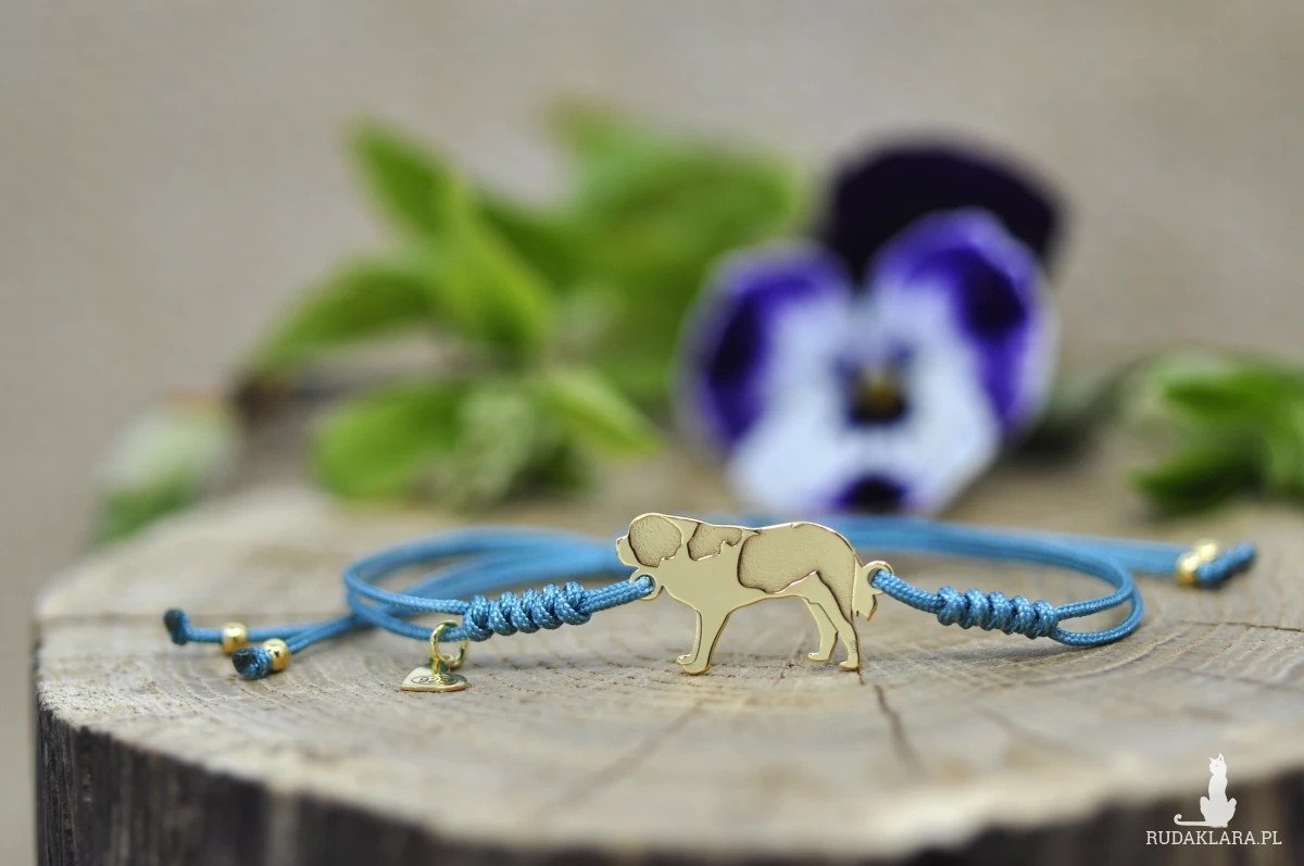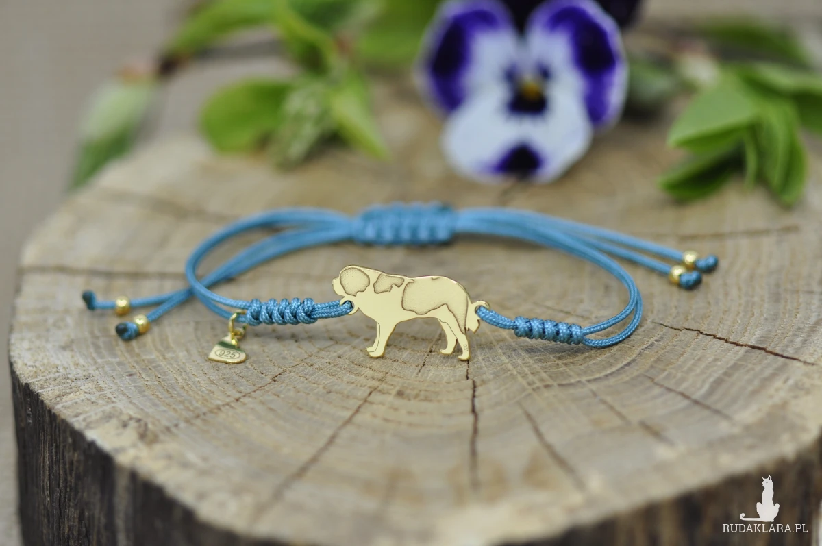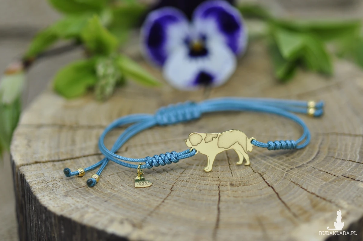 Bernardyn wykonany ze srebrnej blachy próby 925, wymiary pieska: 21,4 x 12,6 mm, grubość 0,8 mm, srebrne kulki.