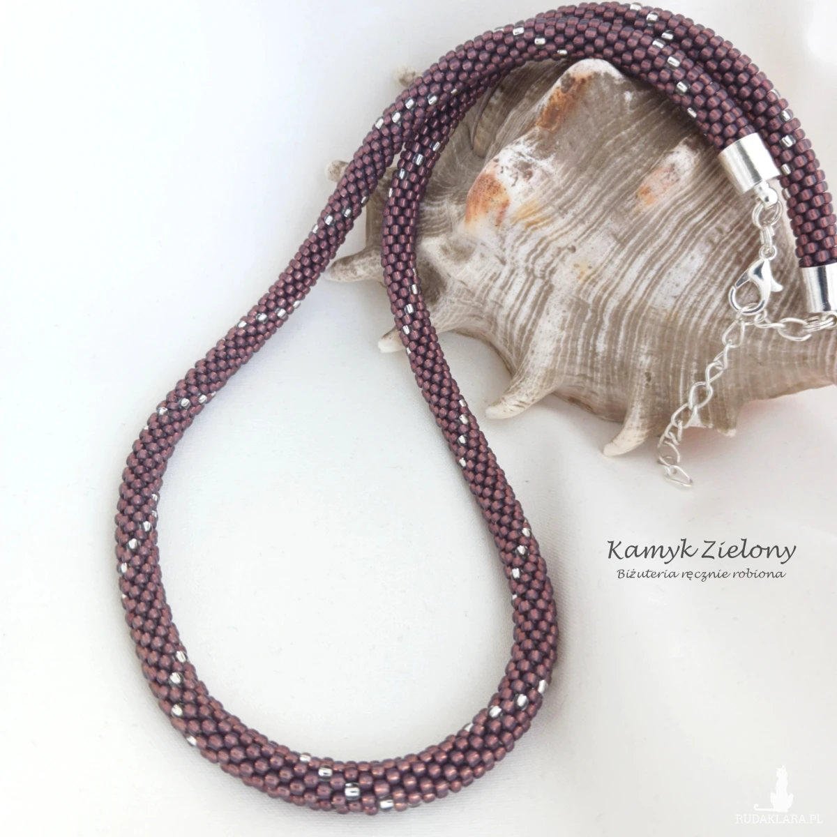 Sznur koralikowy wykonano ręcznie z wysokiej jakości szklanych koralików Toho w kolorze pudrowego fioletu z dodatkiem koralików transparentnych o srebrzonych środkach.