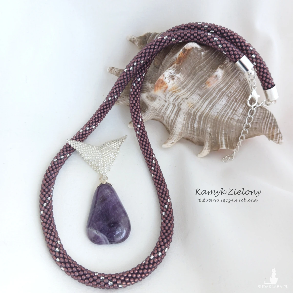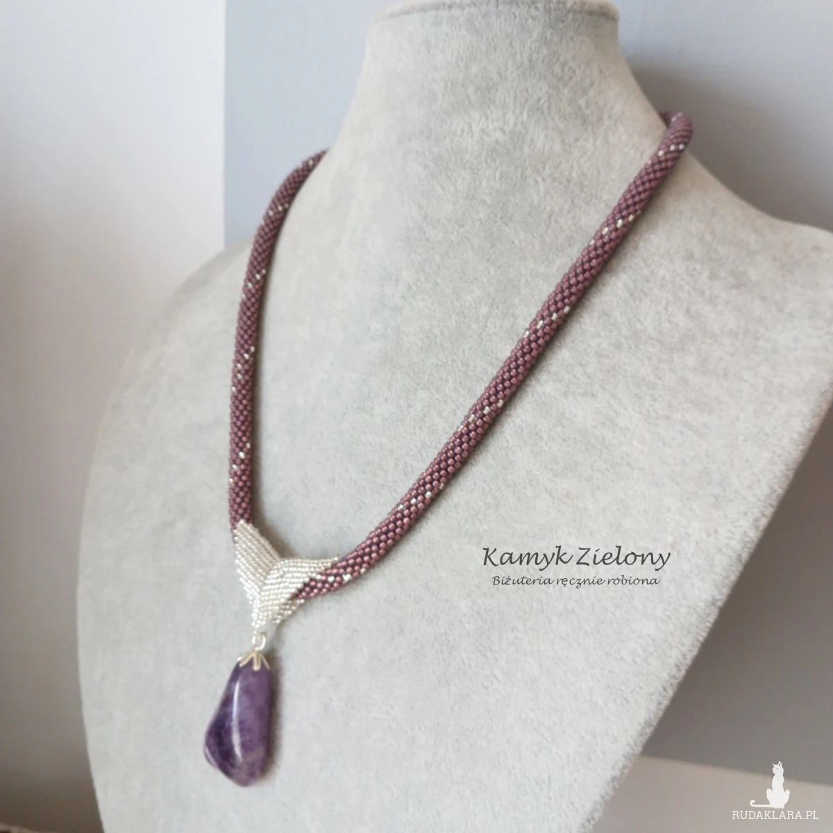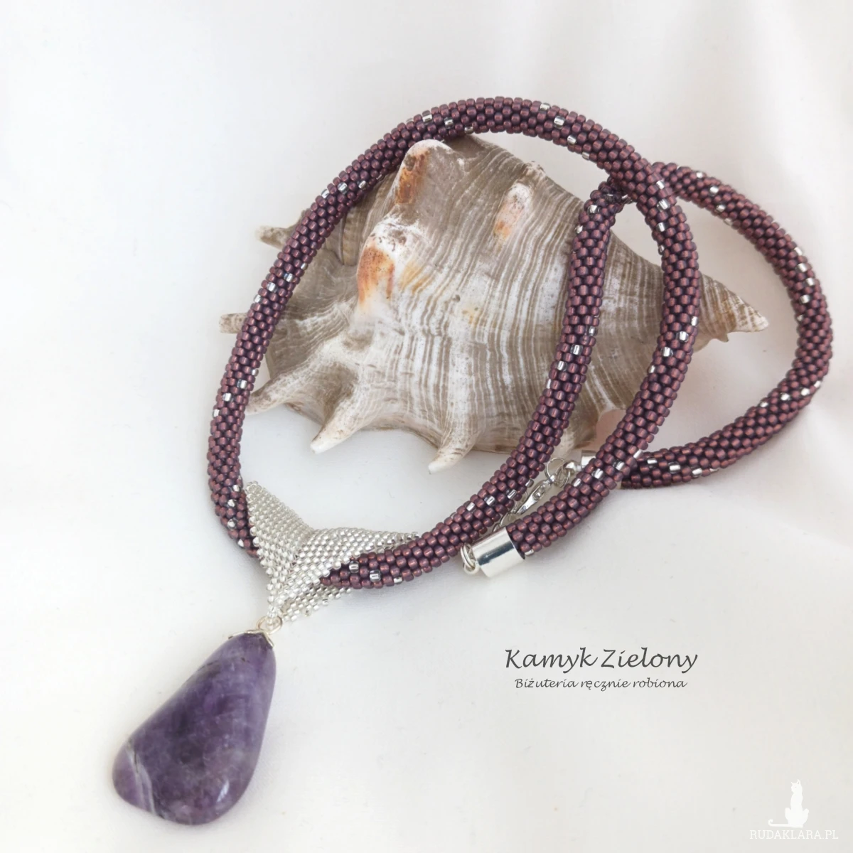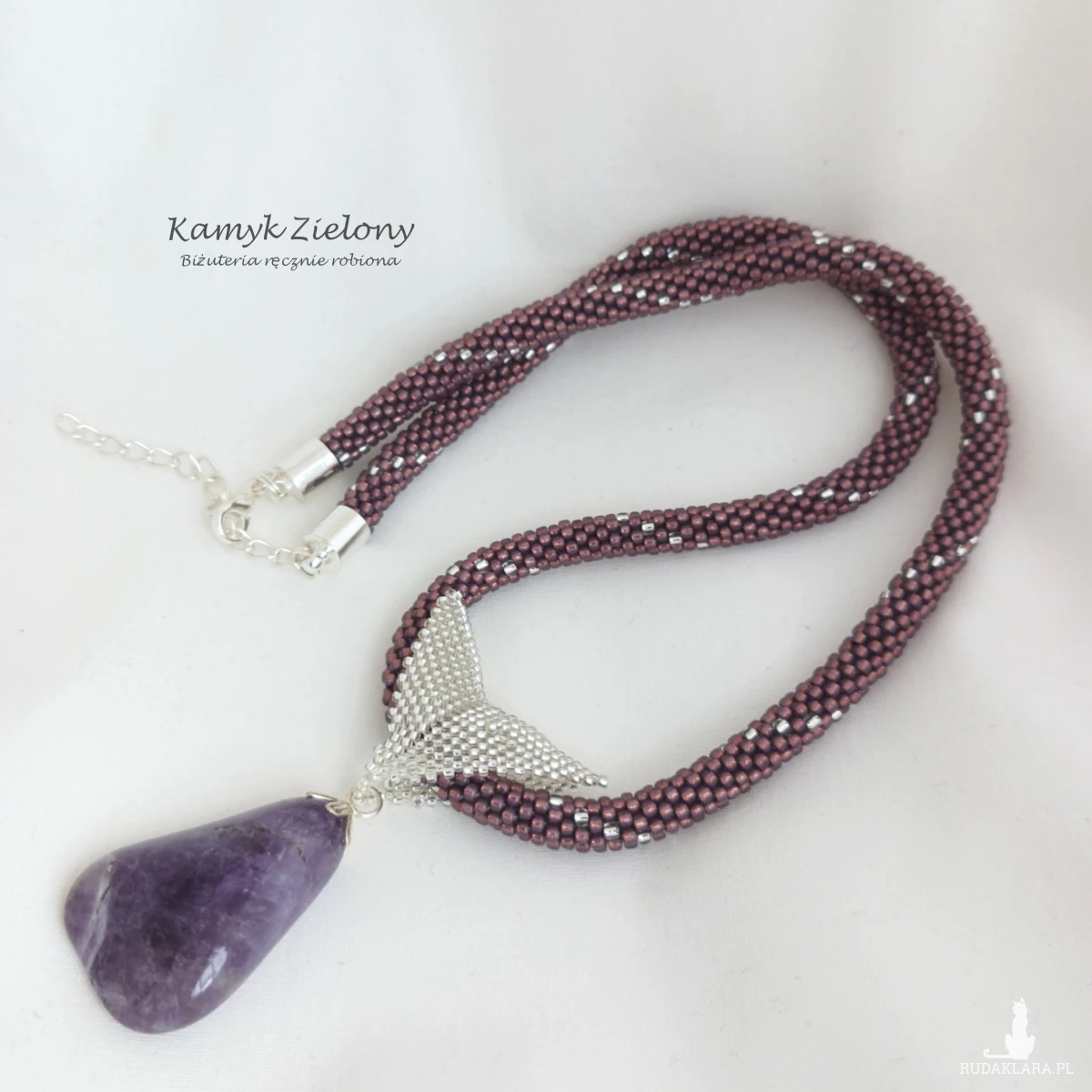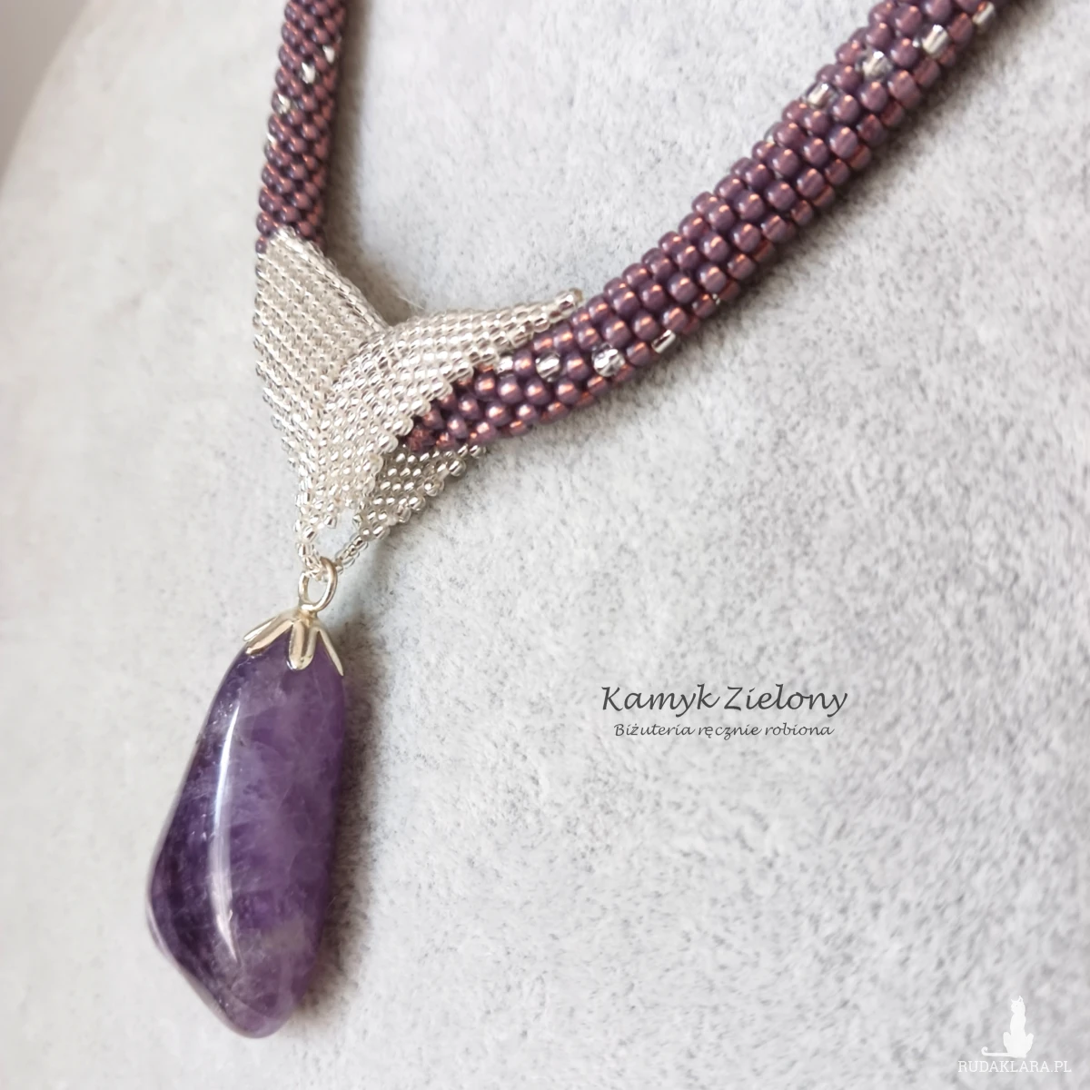 Dodatkową ozdobę naszyjnika stanowi zawieszka wykonana z grudki ametystu, którą zawieszono na krawatce uszytej z drobniutkich koralików Toho. Zawieszkę można zdjąć i naszyjnik nosić bez niej, jako zwykły sznur koralikowy. Zawieszka nadaje się również do noszenia na łańcuszku.