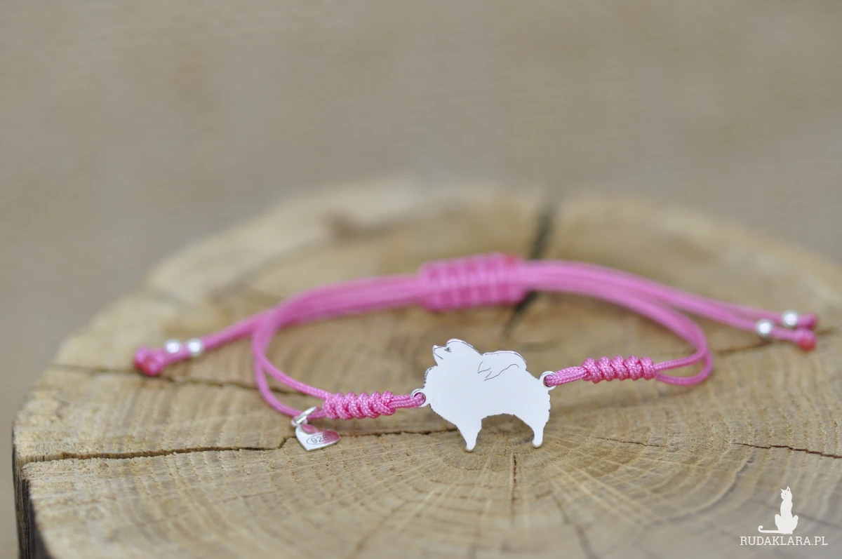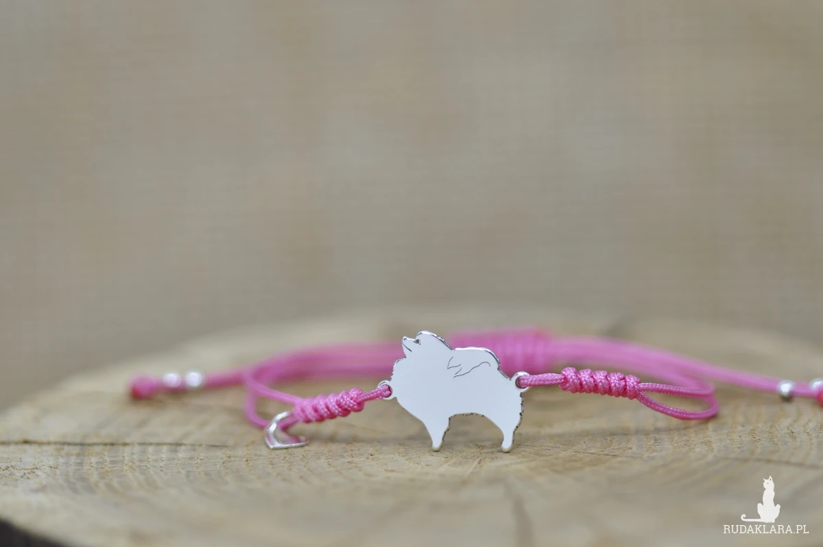 Szpic wykonany ze srebrnej blachy próby 925, wymiary pieska: 19 x 15,2 mm, grubość 0,8 mm oraz srebrne serduszka i kulki.