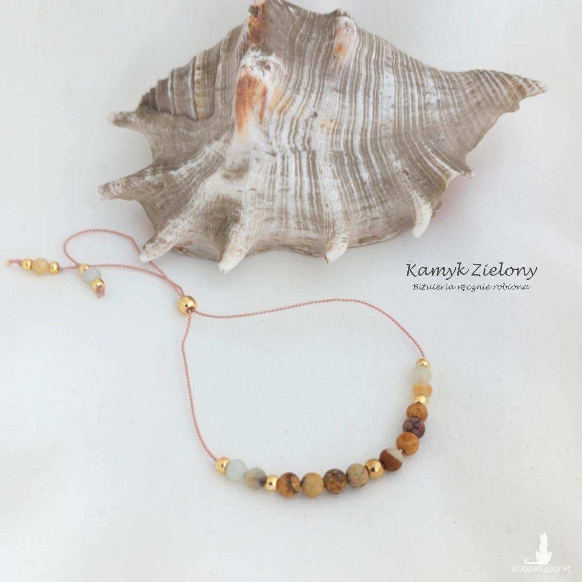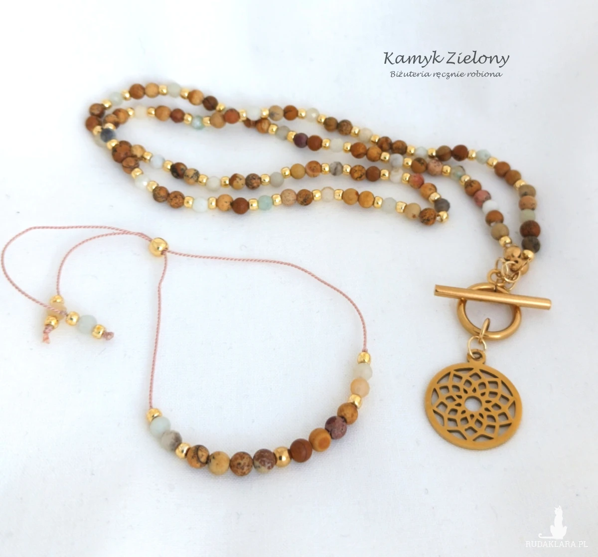 Naszyjnik i bransoletkę wykonano z kuleczek kamieni naturalnych oraz koralików Toho w złotym kolorze i elementów wykończeniowych ze stali chirurgicznej.
