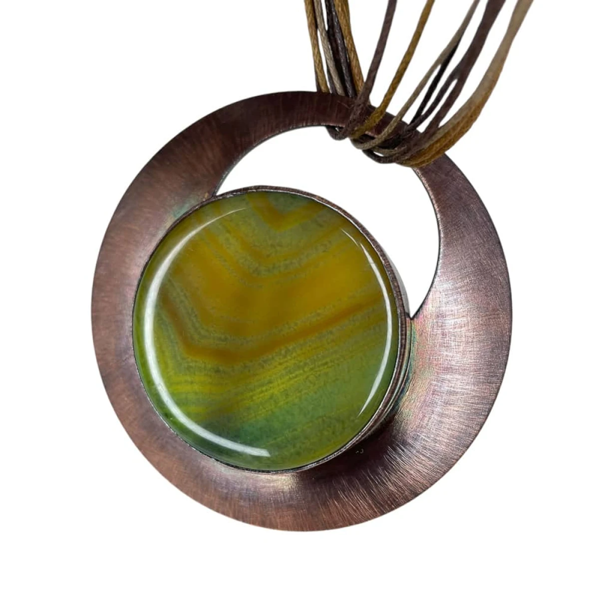 Przedstawiony wisior wykonany został z miedzi i agatu o średnicy ok. 40-45 mm. W procesie tworzenia wisiora blacha była polerowana, matowiona, a następnie malowana oksydą i przecierana, dzięki czemu powstał niepowtarzalny efekt kolorystyczny. Blacha otaczająca agat jest lekko wypukła oraz zabezpieczona warstwą ochronną. Miedziane koło, którego centralnym elementem jest niepowtarzalny agat, ma średnicę ok 7 cm.