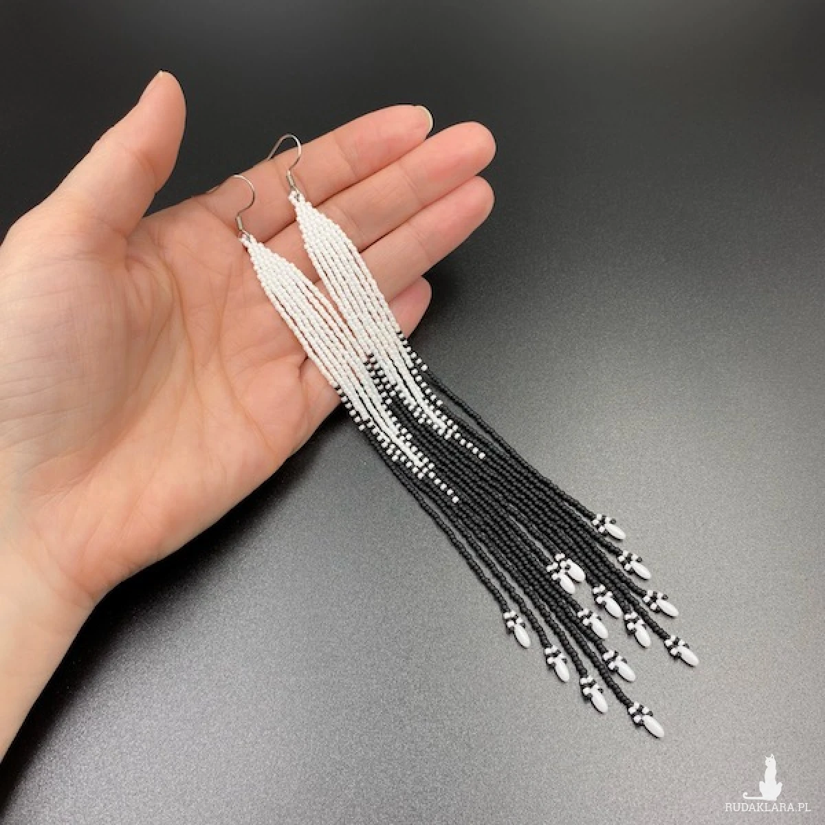 Bardzo długie i wąskie kolczyki do ramion z efektem cieniowania, zostały wykonane z najmniejszych na rynku koralików Toho 15 i Rizo. W 100% utkane ręcznie i z największą starannością.