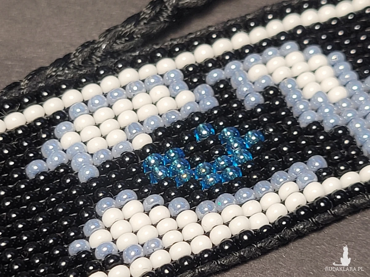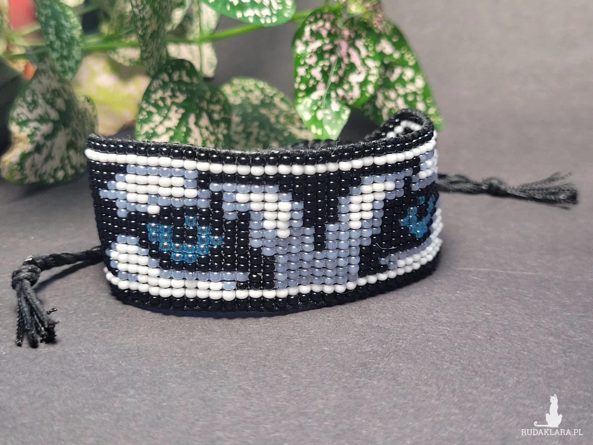 • Ręcznie wytkana na krosnie z koralików czeskich Preciosa bransoletka uniseks z oczami Hasky.