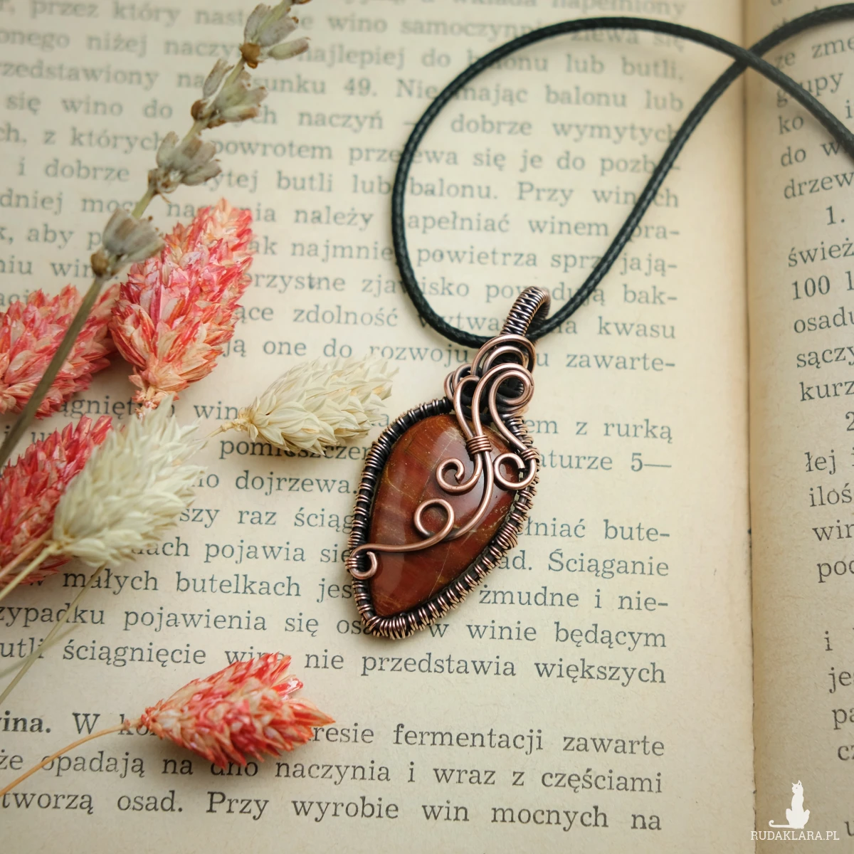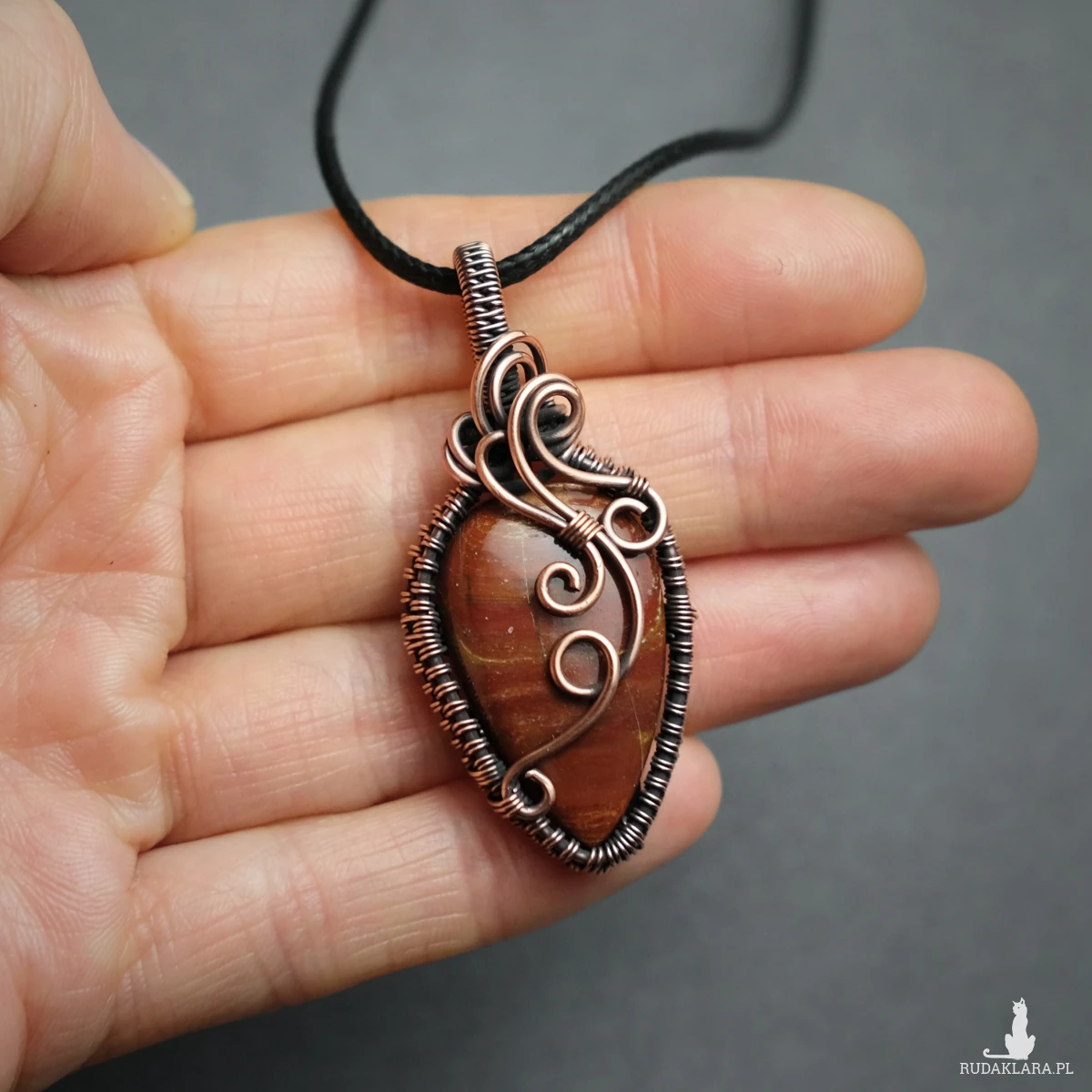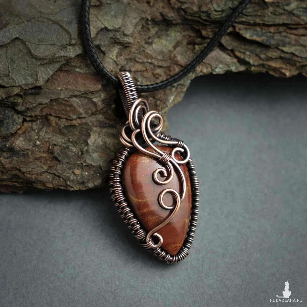 Miedziany wisiorek mieści w sobie skamieniałe drewno o brązowo-czerwonej barwie. Posiada ozdobne boczki i oplata go moc fikuśnych miedzianych splotów. Wisiorek jest unikatem, doda Twojej stylizacji oryginalności, a jeśli lubisz naturę i kolory ziemi wisiorek będzie idealnym dopełnieniem Ciebie :-)