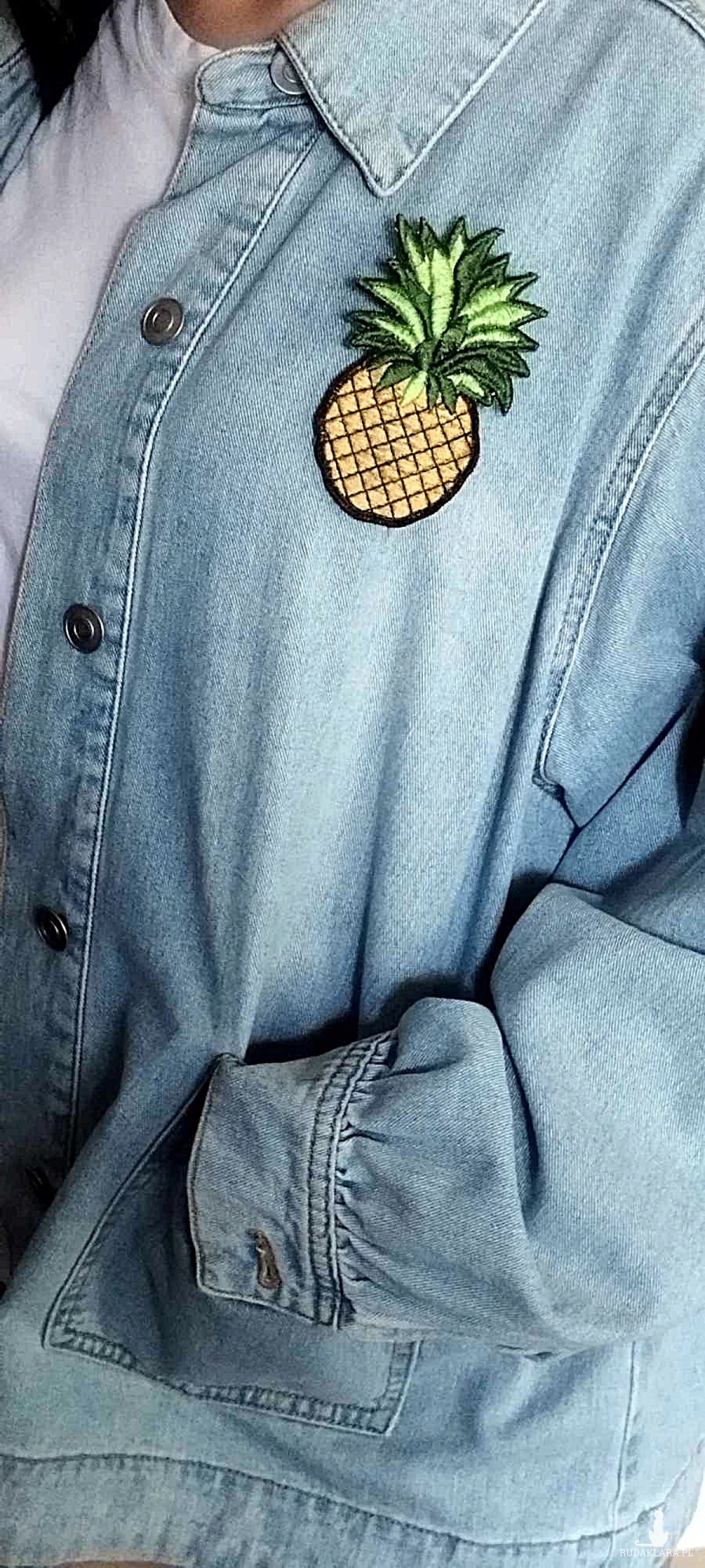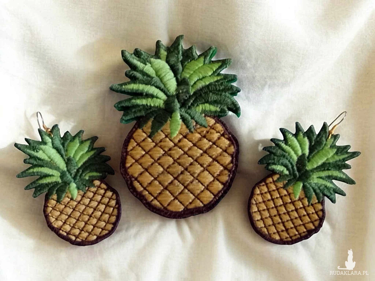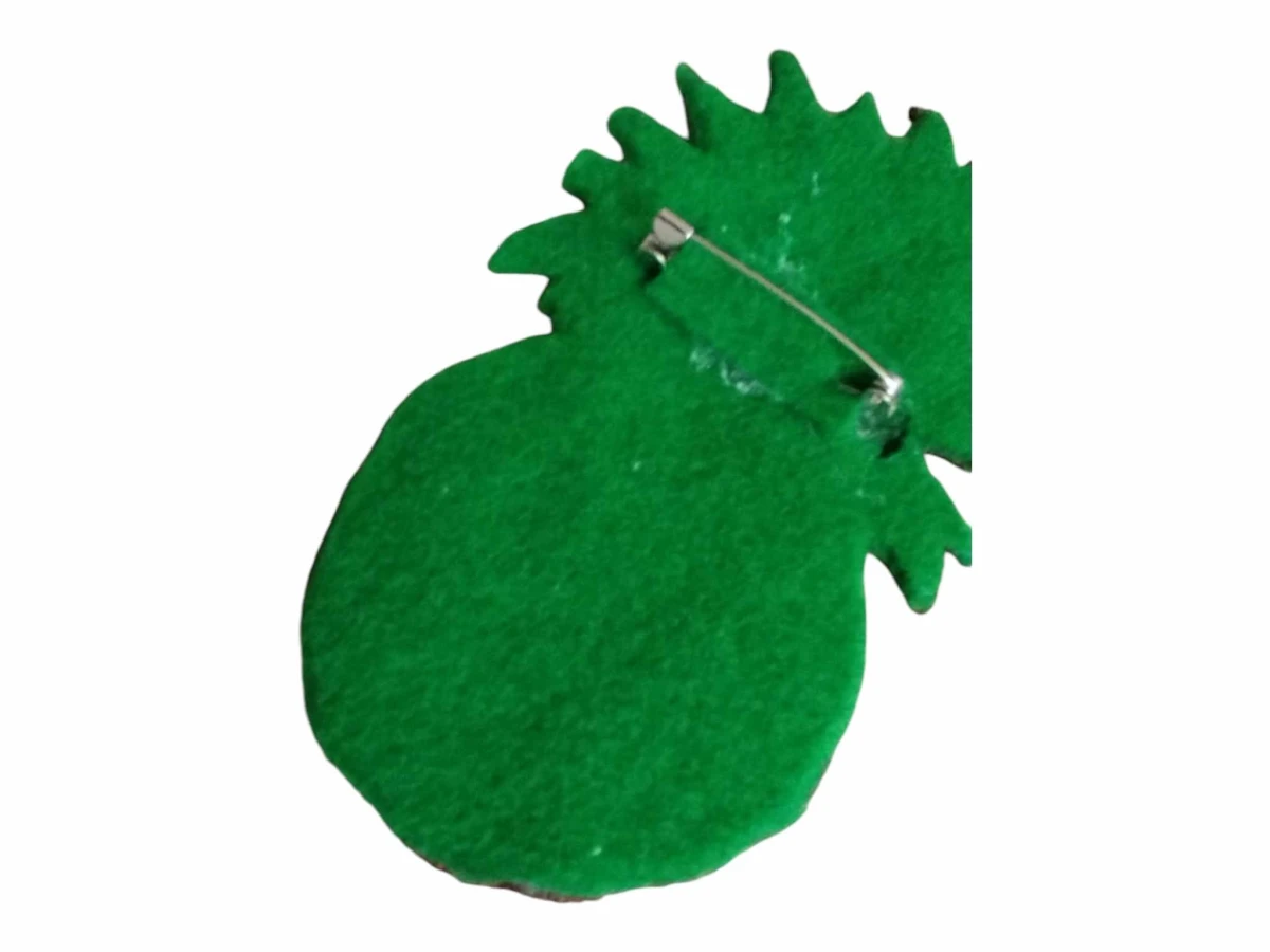 Broszka ananas. Broszka haftowana na podkładzie z filcu. Haft(maszynowy) jest gęsty nieprześwitujący.