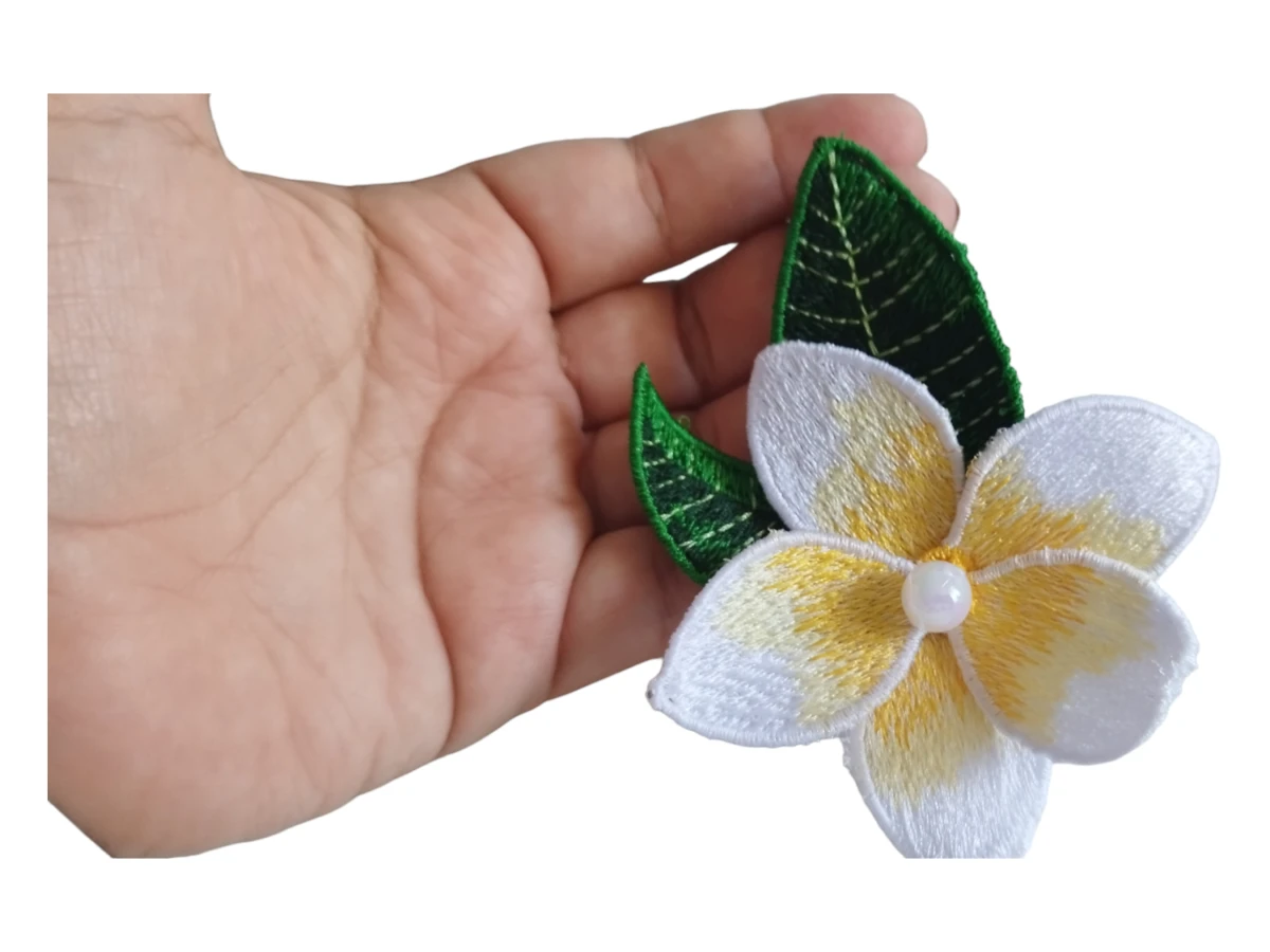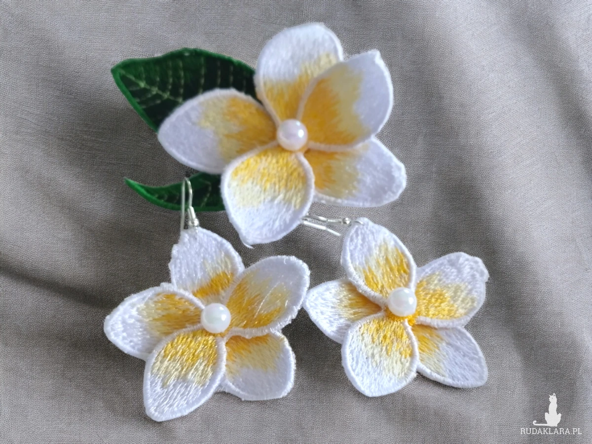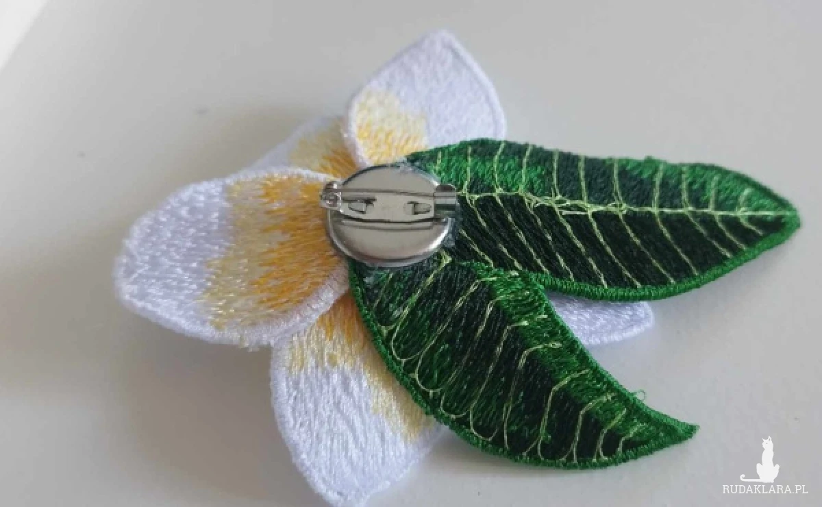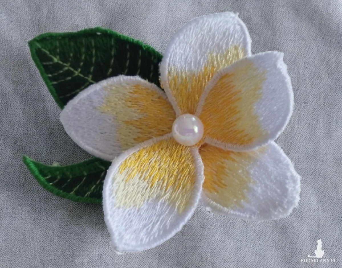 Urocza haftowana broszka - kwiat plumerii. Ta nietuzinkowa broszka będzie ciekawą ozdobą wielu stylizacji podkreślającą piękno i indywidualizm każdej kobiety.
